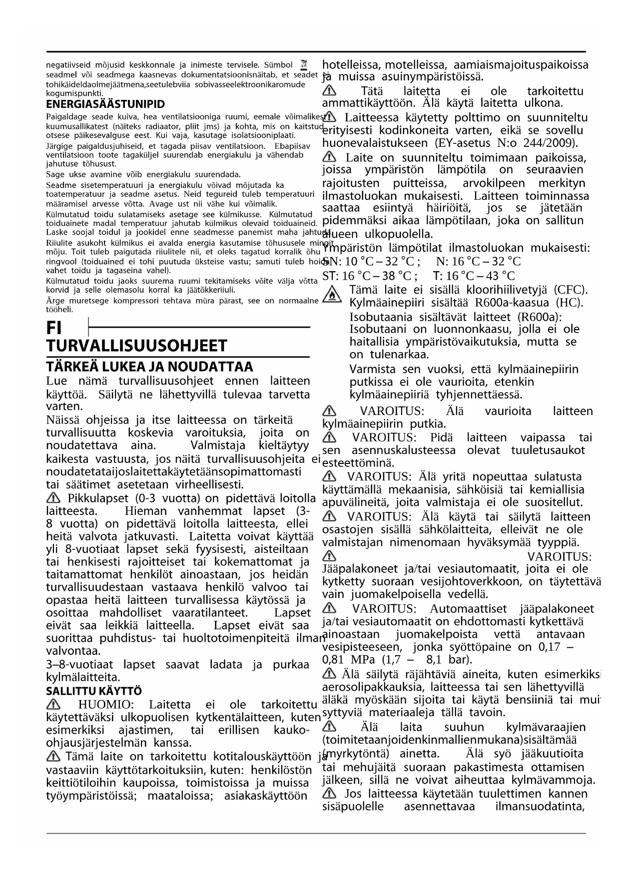 HUOMIO: Laitetta ei ole tarkoitettu käytettäväksi ulkopuolisen kytkentälaitteen, kuten esimerkiksi ajastimen, tai erillisen kauko ohjausjärjestelmän kanssa. Tämä laite on tarkoitettu kotitalouskäyttöön ja vastaaviin käyttötarkoituksiin, kuten: henkilöstön keittiötiloihin kaupoissa, toimistoissa ja muissa työympäristöissä; maataloissa; asiakaskäyttöön hotelleissa, motelleissa, aamiaismajoituspaikoissa ja muissa asuinympäristöissä. Tätä laitetta ei ole tarkoitettu ammattikäyttöön. Älä käytä laitetta ulkona. Laitteessa käytetty polttimo on suunniteltu erityisesti kodinkoneita varten, eikä se sovellu huonevalaistukseen (EYasetus N:o 244/2009). Laite on suunniteltu toimimaan paikoissa, joissa ympäristön lämpötila on seuraavien rajoitusten puitteissa, arvokilpeen merkityn ilmastoluokan mukaisesti. Laitteen toiminnassa saattaa esiintyä häiriöitä, jos se jätetään pidemmäksi aikaa lämpötilaan, joka on sallitun alueen ulkopuolella. Ympäristön lämpötilat ilmastoluokan mukaisesti: SN: 10 °C – 32 °C ; N: 16 °C – 32 °C ST: 16 °C – 38 °C ; T: 16 °C – 43 °C Tämä laite ei sisällä kloorihiilivetyjä (CFC). Kylmäainepiiri sisältää R600akaasua (HC). Isobutaania sisältävät laitteet (R600a): Isobutaani on luonnonkaasu, jolla ei ole haitallisia ympäristövaikutuksia, mutta se on tulenarkaa. Varmista sen vuoksi, että kylmäainepiirin putkissa ei ole vaurioita, etenkin kylmäainepiiriä tyhjennettäessä. VAROITUS: Älä vaurioita laitteen kylmäainepiirin putkia. VAROITUS: Pidä laitteen vaipassa tai sen asennuskalusteessa olevat tuuletusaukot esteettöminä. VAROITUS: Älä yritä nopeuttaa sulatusta käyttämällä mekaanisia, sähköisiä tai kemiallisia apuvälineitä, joita valmistaja ei ole suositellut. VAROITUS: Älä käytä tai säilytä laitteen osastojen sisällä sähkölaitteita, elleivät ne ole valmistajan nimenomaan hyväksymää tyyppiä. VAROITUS: Jääpalakoneet ja/tai vesiautomaatit, joita ei ole kytketty suoraan vesijohtoverkkoon, on täytettävä vain juomakelpoisella vedellä. VAROITUS: Automaattiset jääpalakoneet ja/tai vesiautomaatit on ehdottomasti kytkettävä ainoastaan juomakelpoista vettä antavaan vesipisteeseen, jonka syöttöpaine on 0,17 – 0,81 MPa (1,7 – 8,1 bar). Älä säilytä räjähtäviä aineita, kuten esimerkiksi aerosolipakkauksia, laitteessa tai sen lähettyvillä äläkä myöskään sijoita tai käytä bensiiniä tai muita syttyviä materiaaleja tällä tavoin. Älä laita suuhun kylmävaraajien (toimitetaanjoidenkinmallienmukana)sisältämää (myrkytöntä) ainetta. Älä syö jääkuutioita tai mehujäitä suoraan pakastimesta ottamisen jälkeen, sillä ne voivat aiheuttaa kylmävammoja. Jos laitteessa käytetään tuulettimen kannen sisäpuolelle asennettavaa ilmansuodatinta,suodattimen on oltava paikoillaan aina, kun jääkaappi on käytössä. Älä säilytä pakastelokerossa nesteitä sisältäviä lasiastioita, sillä ne saattavat särkyä. Älä estä tuulettimen pyörimistä elintarvikkeilla (jos laitteessa on tuuletin). Varmista elintarvikkeiden sijoittamisen jälkeen, että osastojen, erityisesti pakastimen, ovet sulkeutuvat kunnolla. Vioittuneet tiivisteet on vaihdettava mahdollisimman pian. Käytä jääkaappiosastoa vain tuoreiden elintarvikkeiden säilytykseen. Käytä pakastinosastoa vain pakasteiden säilytykseen, tuoreiden elintarvikkeiden pakastukseen ja jääkuutioiden jäädytykseen. Vältä pakkaamattomien ruokien säilyttämistä suorassa kosketuksessa jääkaapin tai pakastimen sisäpintoihin. Laitteissa voi olla erikoislokeroita (tuoretuotelokero, Zero Degrees lokero jne.). Ellei tuotteen ohjeissa erityisesti toisin mainita, ne voidaan poistaa ilman, että laitteen suorituskyky heikkenee. Cpentaania käytetään eristysmassan paisutusaineena, ja se on syttyvä kaasu. Laitteen sopivimmat osastot, joissa varastoidaan tietyntyyppisiä elintarvikkeita, ottaen huomioon laitteen eri osastojen erilaiset lämpötilajakaumat, ovat seuraavat: Jääkaappiosasto: