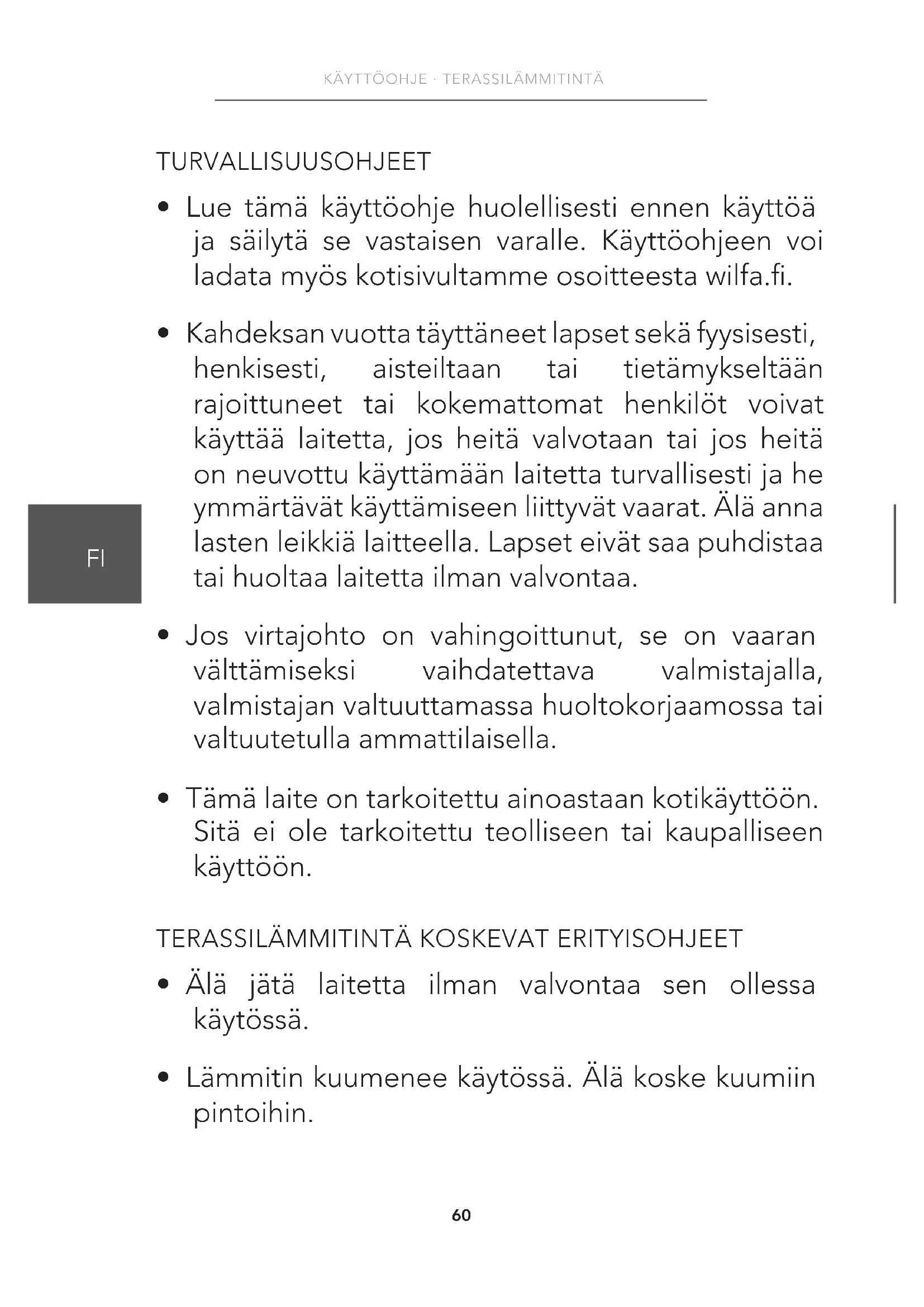 - Lue tämä käyttöohje huolellisesti ennen käyttöä ja säilytä se vastaisen varalle. Käyttöohjeen voi ladata myös kotisivultamme osoitteesta wilfa..
