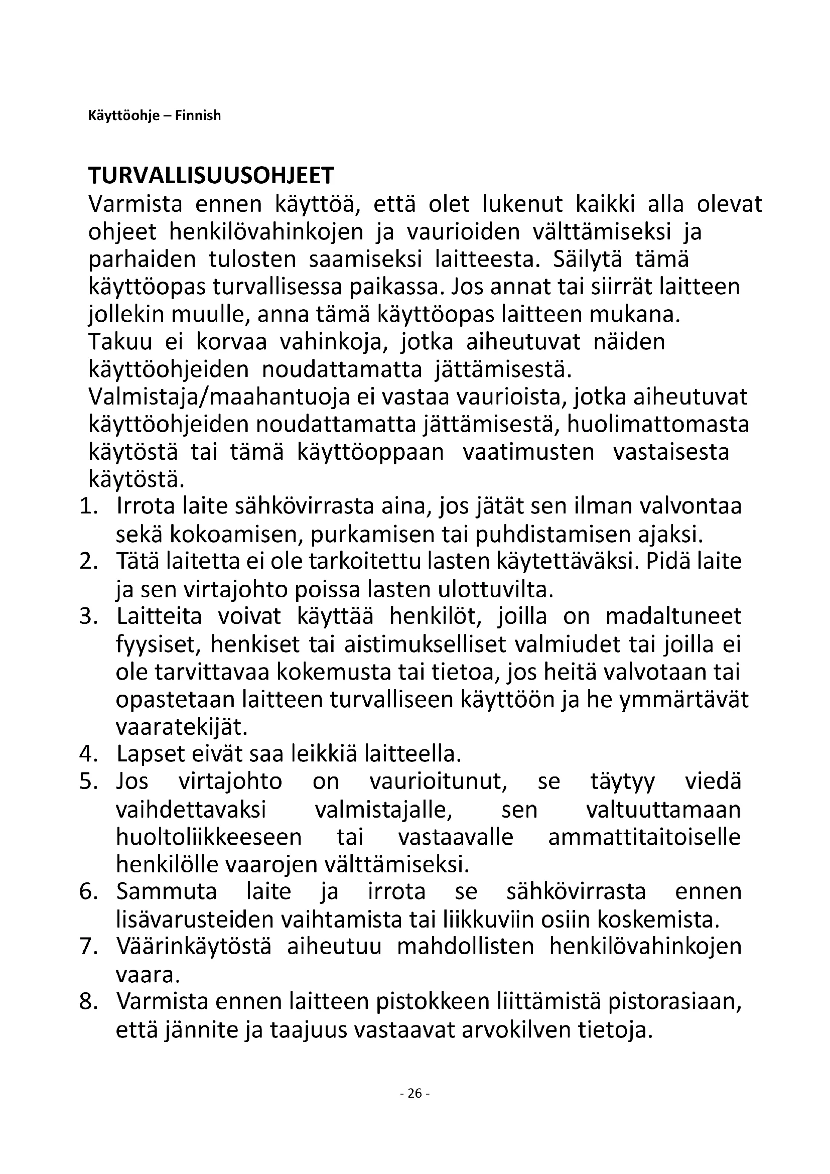 25. Älä kierrä virtajohtoa laitteen ympärille säilytyksen ajaksi.
