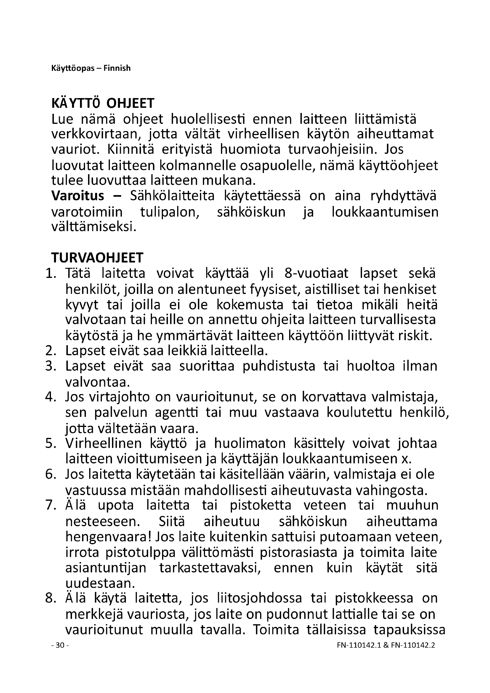 merkkejä vauriosta, jos laite on pudonnut lattialle tai se on vaurioitunut muulla tavalla. Toimita tällaisissa tapauksissa- 31 - FN-110142.1 & FN-110142.2 laite asiantuntijalle tarkastusta ja korjausta varten, jos tarpeen.