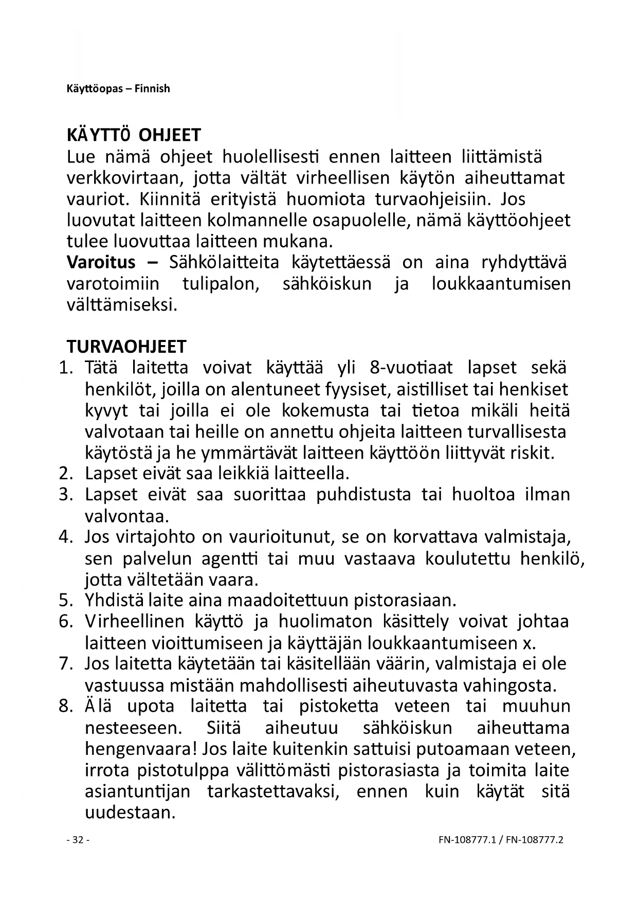 nesteeseen. Siitä aiheutuu sähköiskun aiheuttama hengenvaara! Jos laite kuitenkin sattuisi putoamaan veteen, irrota pistotulppa välittömästi pistorasiasta ja toimita laite asiantuntijan tarkastettavaksi, ennen kuin käytät sitä uudestaan.- 33 - FN-108777.1 / FN-108777.2