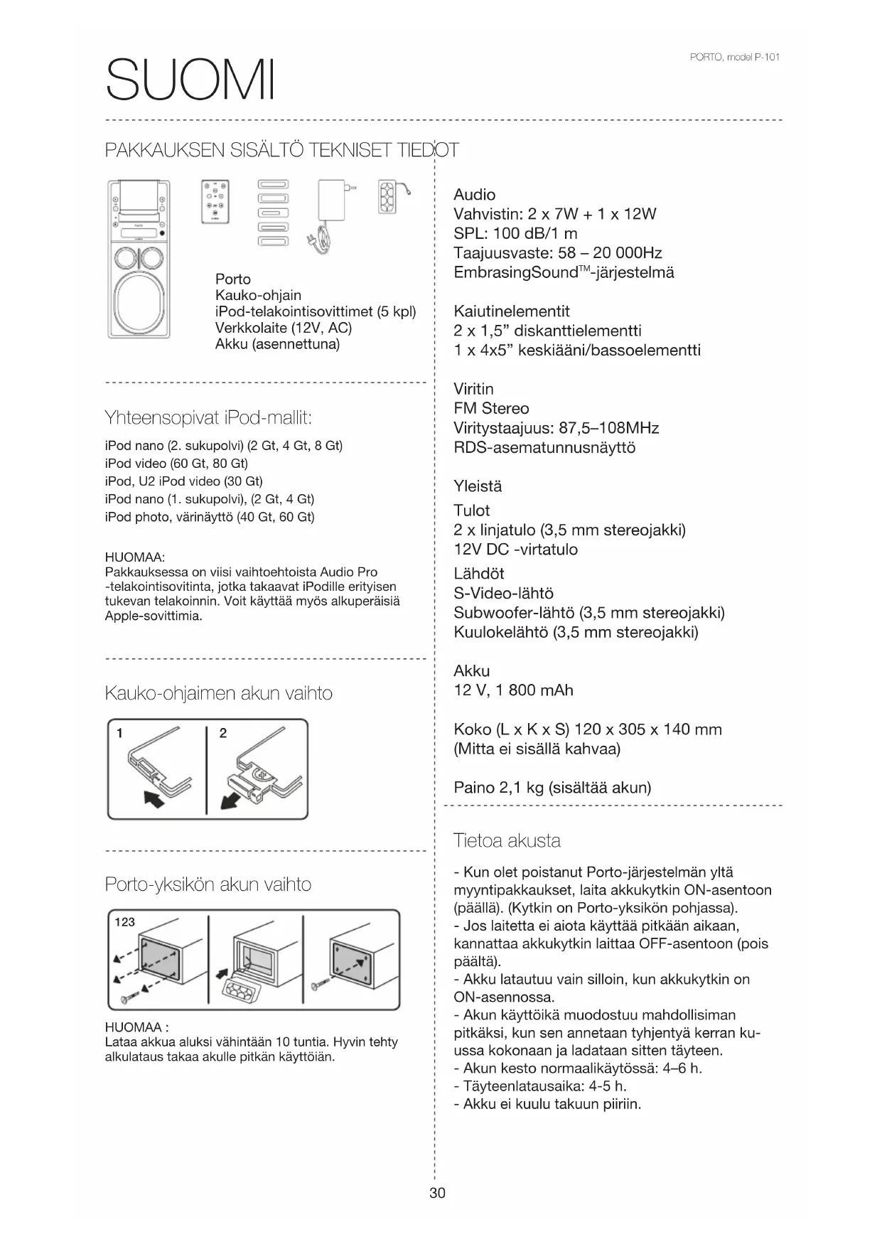 Porto Kauko-ohjain iPod-telakointisovittimet (5 kpl) Verkkolaite (12V, AC) Akku (asennettuna) Kauko-ohjaimen akun vaihto Porto-yksikön akun vaihto HUOMAA :Lataa akkua aluksi vähintään 10 tuntia. Hyvin tehty alkulataus takaa akulle pitkän käyttöiän. Yhteensopivat iPod-mallit: HUOMAA:Pakkauksessa on viisi vaihtoehtoista Audio Pro -telakointisovitinta, jotka takaavat iPodille erityisen tukevan telakoinnin. Voit käyttää myös alkuperäisiä Apple-sovittimia.iPod nano (2. sukupolvi) (2 Gt, 4 Gt, 8 Gt)iPod video (60 Gt, 80 Gt)iPod, U2 iPod video (30 Gt)iPod nano (1. sukupolvi), (2 Gt, 4 Gt)iPod photo, värinäyttö (40 Gt, 60 Gt) Tietoa akusta Audio Vahvistin: 2 x 7W + 1 x 12W SPL: 100 dB/1 m Taajuusvaste: 58 – 20 000Hz EmbrasingSound