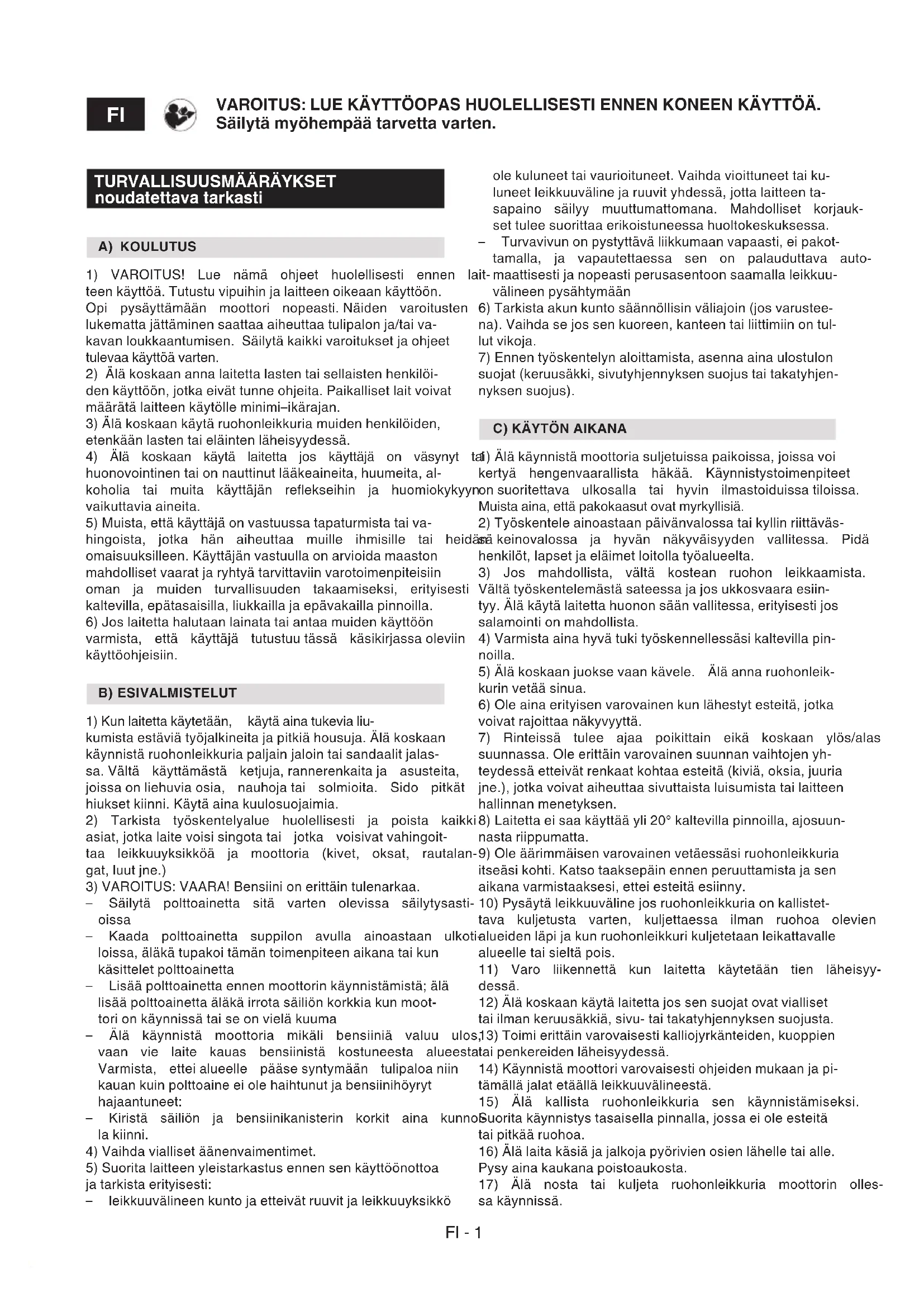 noudatettava tarkasti A) KOULUTUS 1) VAROITUS! Lue nämä ohjeet huolellisesti ennen lait- teen käyttöä. Tutustu vipuihin ja laitteen oikeaan käyttöön. Opi pysäyttämään moottori nopeasti. Näiden varoitusten lukematta jättäminen saattaa aiheuttaa tulipalon ja/tai va- kavan loukkaantumisen. Säilytä kaikki varoitukset ja ohjeet tulevaa käyttöä varten. 2) Älä koskaan anna laitetta lasten tai sellaisten henkilöi- den käyttöön, jotka eivät tunne ohjeita. Paikalliset lait voivat määrätä laitteen käytölle minimi–ikärajan. 3) Älä koskaan käytä ruohonleikkuria muiden henkilöiden, etenkään lasten tai eläinten läheisyydessä. 4) Älä koskaan käytä laitetta jos käyttäjä on väsynyt tai huonovointinen tai on nauttinut lääkeaineita, huumeita, al- koholia tai muita käyttäjän reekseihin ja huomiokykyyn vaikuttavia aineita. 5) Muista, että käyttäjä on vastuussa tapaturmista tai va- hingoista, jotka hän aiheuttaa muille ihmisille tai heidän omaisuuksilleen. Käyttäjän vastuulla on arvioida maaston mahdolliset vaarat ja ryhtyä tarvittaviin varotoimenpiteisiin oman ja muiden turvallisuuden takaamiseksi, erityisesti kaltevilla, epätasaisilla, liukkailla ja epävakailla pinnoilla. 6) Jos laitetta halutaan lainata tai antaa muiden käyttöön varmista, että käyttäjä tutustuu tässä käsikirjassa oleviin käyttöohjeisiin. B) ESIVALMISTELUT 1) Kun laitetta käytetään, käytä aina tukevia liu- kumista estäviä työjalkineita ja pitkiä housuja. Älä koskaan käynnistä ruohonleikkuria paljain jaloin tai sandaalit jalas- sa. Vältä käyttämästä ketjuja, rannerenkaita ja asusteita, joissa on liehuvia osia, nauhoja tai solmioita. Sido pitkät hiukset kiinni. Käytä aina kuulosuojaimia. 2) Tarkista työskentelyalue huolellisesti ja poista kaikki asiat, jotka laite voisi singota tai jotka voisivat vahingoit- taa leikkuuyksikköä ja moottoria (kivet, oksat, rautalan- gat, luut jne.) 3) VAROITUS: VAARA! Bensiini on erittäin tulenarkaa. – Säilytä polttoainetta sitä varten olevissa säilytysasti- oissa – Kaada polttoainetta suppilon avulla ainoastaan ulkoti- loissa, äläkä tupakoi tämän toimenpiteen aikana tai kun käsittelet polttoainetta – Lisää polttoainetta ennen moottorin käynnistämistä; älä lisää polttoainetta äläkä irrota säiliön korkkia kun moot- tori on käynnissä tai se on vielä kuuma – Älä käynnistä moottoria mikäli bensiiniä valuu ulos, vaan vie laite kauas bensiinistä kostuneesta alueesta. Varmista, ettei alueelle pääse syntymään tulipaloa niin kauan kuin polttoaine ei ole haihtunut ja bensiinihöyryt hajaantuneet: – Kiristä säiliön ja bensiinikanisterin korkit aina kunnol- la kiinni. 4) Vaihda vialliset äänenvaimentimet. 5) Suorita laitteen yleistarkastus ennen sen käyttöönottoa ja tarkista erityisesti: – leikkuuvälineen kunto ja etteivät ruuvit ja leikkuuyksikkö