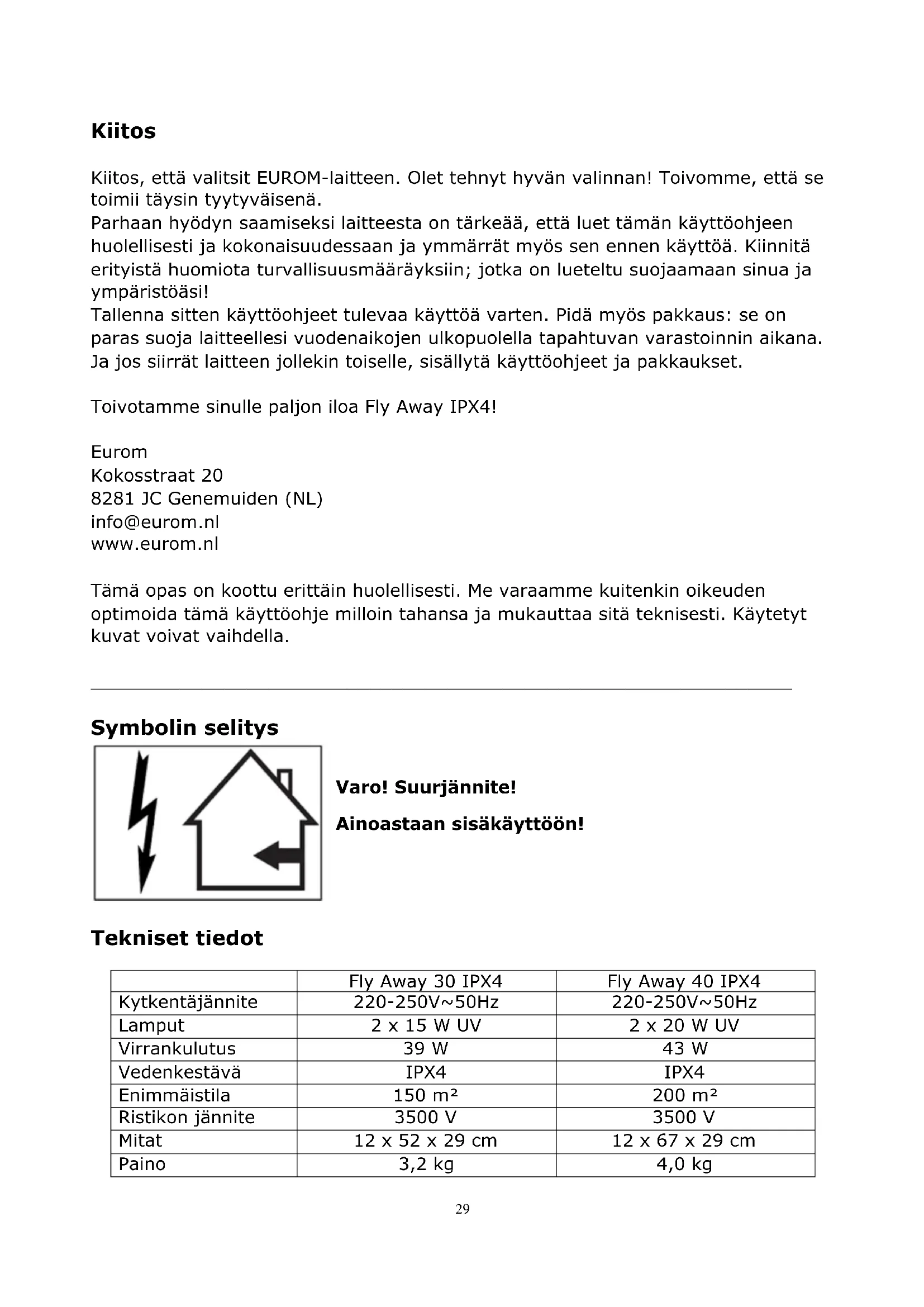 ilmavirtausta. Mittaritappurin sijoittaminen vetovirtaan ei sen vuoksi ole tehokasta. Käyttö ja huolto Kytkentä ensimmäisen kerran Varmistu, että käyttämäsi pistoke on maadoitettu ja että jännite on oikea (220- 240V~50Hz). Käynnistä hyönteistuhoaja kytkemällä laite pistorasiaan. Hyönteistuhoaja on toiminnassa. Hyönteistuhoaja voi olla käynnissä vuoden ympäri (24 tuntia päivässä). Lamppujen vaihtaminen Kulunutta UV-putkea vaihdettaessa irrota pistoke ensin pistorasiasta ja ota keräysalusta pois vetämällä sitä laitteen sivulle päin. Kierrä ripustussilmukoiden vieressä olevat 2x2 ruuvit irti. Poista ripustussilmukat ja yläkansi. Kierrä nyt 2x2 ruuvit irti säleikön etu- ja takasivulla ja kallista koko sähköosa lamppuineen pois säleiköstä. Käännä vasemmalle ja oikealle rengasta niin että lampun kiinnitys irtoaa. Työnnä kumirenkaat ja muoviset sisärenkaat pois. Nyt voit kiertää loisteputkea 90°, ottaa sen pois kiinnittimestä ja vaihtaa uuteen. Pane lamput, renkaat, säleikkö ja keräysalusta takaisin alkuperäiseen asentoon ennen kuin otat laitteen uudelleen käyttöön.33 Puhdistus Tyhjennä keräysalusta säännöllisesti vetämällä sitä laitteen sivulle päin. Liiallinen pöly vähentää valon tehoa ja liialliset epäpuhtaudet vaikuttavat hyönteisten tuhoamiseen. Joten puhdista laite säännöllisesti. Irrota pistotulppa pistorasiasta ja irrota luovutusalusta. Aseta laite työskentelytasolle ja voit poistaa pölyn sekä epäpuhtaudet esimerkiksi pölynimurilla, pölynpoistajalla tai pehmeällä harjalla. Älä käytä kosteutta tai ruosteen puhdistusaineita hyönteistuhoajaan. Voit poistaa pölyn laitteen ulkopuolelta pehmeällä liinalla. Mahdolliset viat/ongelmat Lamput eivät syty Lamppu ei kiinnity. Korjaa se. Lamppu on rikki. Vaihda se. Käynnistin on viallinen. Vie vaihdettavaksi. Induktiokela on viallinen. Vie vaihdettavaksi. Pistoke ei kiinnitettynä asianmukaisesti pistorasiaan. Aseta se paikoilleen. Sähköistetyssä verkossa ei ole virtaa Verkkoon johtavassa virtajohdossa on vika. Korjauta se. Muuntajassa on oikosulku. Vie korjattavaksi/vaihdettavaksi. Varmistu aina, että pistoke on irrotettu pistorasiasta ennen kuin teet mitään korjauksia! Poistaminen EU: ssa tämä symboli tarkoittaa, että tätä tuotetta ei saa hävittää tavallisen talousjätteen mukana. Jätelaitteet sisältävät arvokkaita materiaaleja, joita voidaan ja pitää käyttää uudelleen, jotta sääntelemättömän jätteenkeräyksen avulla ei vahingoiteta ympäristöä ja terveyttä. Siksi vie hävitetyt välineet nimettyyn keräyspisteeseen tai ota yhteyttä yritykseen, josta ostit laitteen. He voivat varmistaa, että mahdollisimman monta laitteen osaa käytetään uudelleen. CE-ilmoitus Katso sivu 34.34 CE Declaration Eurom Kokosstraat 20 8281 JC Genemuiden The Netherlands declares the following device in sole responsibility: Product: Insekt-killer Brand name: EUROM Model: Fly Away 30 IPX4 & Fly Away 30 IPX4 Item number: 211870 & 211887 Complies with the following harmonization rules: Low Voltage Directive: LVD 2014/35/EU Electromagnetic compatibility Directive: EMC 2014/30/EU Restriction of Hazardous Substances RoHS Directive: 2011/65/EU&(EU)2015/863 Applied harmonized standards: EN 60335-2-59:2003/A2:2009 EN 60335-1:2012/A11 :2014 EN 62233:2008 AfPS GS 2014 :01 PAK EN 55014-1:2006+A1:2009+A2:2011 EN 55014-2:1997+A1:2001+A2:2008 EN 55014-2:2015 EN 61000-3-2:2014 EN 61000-3-3:2013 Genemuiden, 02-12-2020 W.J. Bakker, alg. Dir.3536