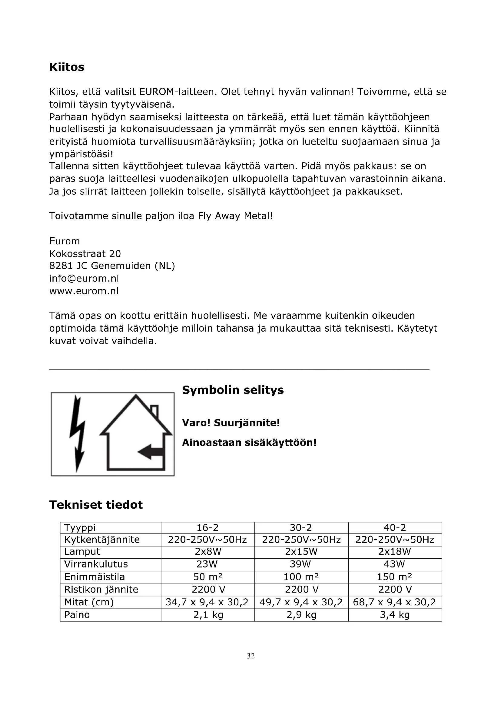 Kiitos Kiitos, että valitsit EUROM-laitteen. Olet tehnyt hyvän valinnan! Toivomme, että se toimii täysin tyytyväisenä. Parhaan hyödyn saamiseksi laitteesta on tärkeää, että luet tämän käyttöohjeen huolellisesti ja kokonaisuudessaan ja ymmärrät myös sen ennen käyttöä. Kiinnitä erityistä huomiota turvallisuusmääräyksiin; jotka on lueteltu suojaamaan sinua ja ympäristöäsi! Tallenna sitten käyttöohjeet tulevaa käyttöä varten. Pidä myös pakkaus: se on paras suoja laitteellesi vuodenaikojen ulkopuolella tapahtuvan varastoinnin aikana. Ja jos siirrät laitteen jollekin toiselle, sisällytä käyttöohjeet ja pakkaukset. Toivotamme sinulle paljon iloa Fly Away Metal! Eurom Kokosstraat 20 8281 JC Genemuiden (NL) info@eurom.nl www.eurom.nl Tämä opas on koottu erittäin huolellisesti. Me varaamme kuitenkin oikeuden optimoida tämä käyttöohje milloin tahansa ja mukauttaa sitä teknisesti. Käytetyt kuvat voivat vaihdella.