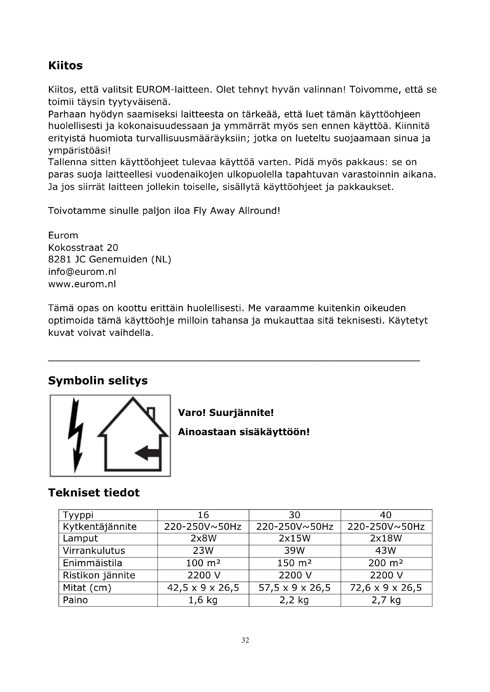 Kiitos Kiitos, että valitsit EUROM-laitteen. Olet tehnyt hyvän valinnan! Toivomme, että se toimii täysin tyytyväisenä. Parhaan hyödyn saamiseksi laitteesta on tärkeää, että luet tämän käyttöohjeen huolellisesti ja kokonaisuudessaan ja ymmärrät myös sen ennen käyttöä. Kiinnitä erityistä huomiota turvallisuusmääräyksiin; jotka on lueteltu suojaamaan sinua ja ympäristöäsi! Tallenna sitten käyttöohjeet tulevaa käyttöä varten. Pidä myös pakkaus: se on paras suoja laitteellesi vuodenaikojen ulkopuolella tapahtuvan varastoinnin aikana. Ja jos siirrät laitteen jollekin toiselle, sisällytä käyttöohjeet ja pakkaukset. Toivotamme sinulle paljon iloa Fly Away Allround! Eurom Kokosstraat 20 8281 JC Genemuiden (NL) info@eurom.nl www.eurom.nl Tämä opas on koottu erittäin huolellisesti. Me varaamme kuitenkin oikeuden optimoida tämä käyttöohje milloin tahansa ja mukauttaa sitä teknisesti. Käytetyt kuvat voivat vaihdella.