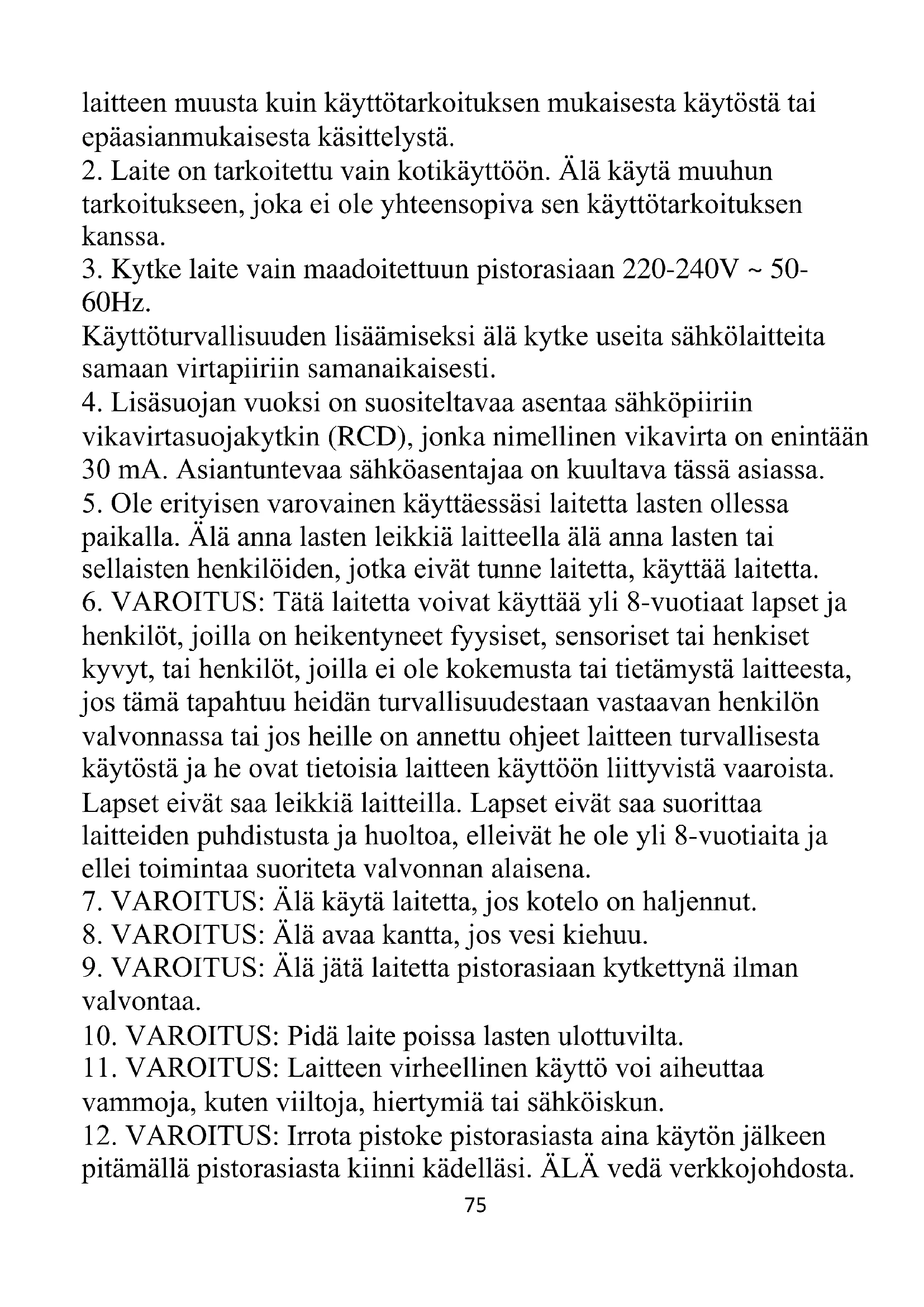 annettuja ohjeita. Valmistaja ei vastaa vahingoista, jotka aiheutuvat75 laitteen muusta kuin käyttötarkoituksen mukaisesta käytöstä tai epäasianmukaisesta käsittelystä.