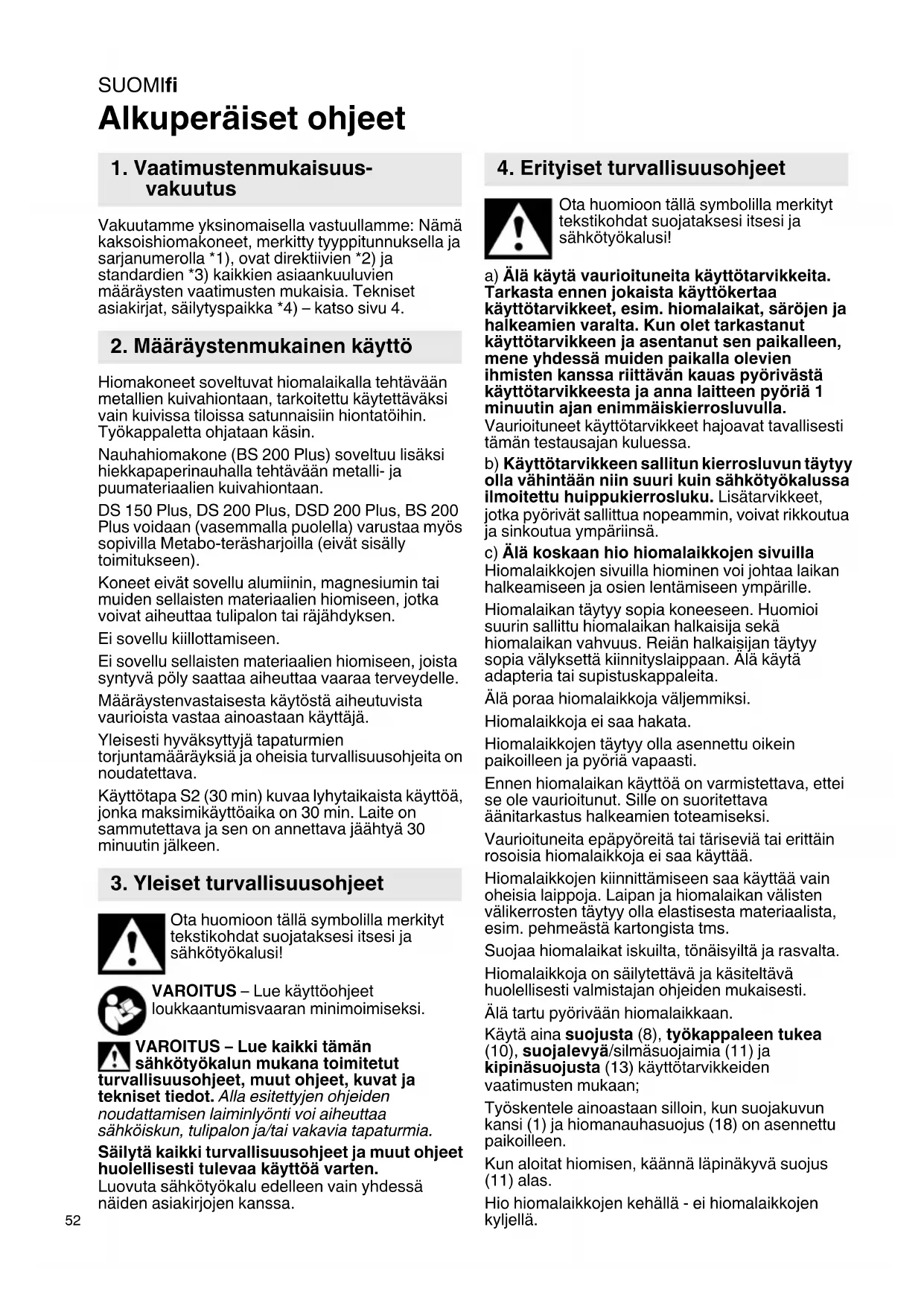 Alkuperäiset ohjeet Vakuutamme yksinomaisella vastuullamme: Nämä kaksoishiomakoneet, merkitty tyyppitunnuksella ja sarjanumerolla *1), ovat direktiivien *2) ja standardien *3) kaikkien asiaankuuluvien määräysten vaatimusten mukaisia. Tekniset asiakirjat, säilytyspaikka *4) – katso sivu 4. Hiomakoneet soveltuvat hiomalaikalla tehtävään metallien kuivahiontaan, tarkoitettu käytettäväksi vain kuivissa tiloissa satunnaisiin hiontatöihin. Työkappaletta ohjataan käsin. Nauhahiomakone (BS 200 Plus) soveltuu lisäksi hiekkapaperinauhalla tehtävään metalli- ja puumateriaalien kuivahiontaan. DS 150 Plus, DS 200 Plus, DSD 200 Plus, BS 200 Plus voidaan (vasemmalla puolella) varustaa myös sopivilla Metabo-teräsharjoilla (eivät sisälly toimitukseen). Koneet eivät sovellu alumiinin, magnesiumin tai muiden sellaisten materiaalien hiomiseen, jotka voivat aiheuttaa tulipalon tai räjähdyksen. Ei sovellu kiillottamiseen. Ei sovellu sellaisten materiaalien hiomiseen, joista syntyvä pöly saattaa aiheuttaa vaaraa terveydelle. Määräystenvastaisesta käytöstä aiheutuvista vaurioista vastaa ainoastaan käyttäjä. Yleisesti hyväksyttyjä tapaturmien torjuntamääräyksiä ja oheisia turvallisuusohjeita on noudatettava. Käyttötapa S2 (30 min) kuvaa lyhytaikaista käyttöä, jonka maksimikäyttöaika on 30 min. Laite on sammutettava ja sen on annettava jäähtyä 30 minuutin jälkeen. Ota huomioon tällä symbolilla merkityt tekstikohdat suojataksesi itsesi ja sähkötyökalusi! VAROITUS – Lue käyttöohjeet loukkaantumisvaaran minimoimiseksi. VAROITUS – Lue kaikki tämän sähkötyökalun mukana toimitetut turvallisuusohjeet, muut ohjeet, kuvat ja tekniset tiedot. Alla esitettyjen ohjeiden noudattamisen laiminlyönti voi aiheuttaa sähköiskun, tulipalon ja/tai vakavia tapaturmia. Säilytä kaikki turvallisuusohjeet ja muut ohjeet huolellisesti tulevaa käyttöä varten. Luovuta sähkötyökalu edelleen vain yhdessä näiden asiakirjojen kanssa. Ota huomioon tällä symbolilla merkityt tekstikohdat suojataksesi itsesi ja sähkötyökalusi! a) Älä käytä vaurioituneita käyttötarvikkeita. Tarkasta ennen jokaista käyttökertaa käyttötarvikkeet, esim. hiomalaikat, säröjen ja halkeamien varalta. Kun olet tarkastanut käyttötarvikkeen ja asentanut sen paikalleen, mene yhdessä muiden paikalla olevien ihmisten kanssa riittävän kauas pyörivästä käyttötarvikkeesta ja anna laitteen pyöriä 1 minuutin ajan enimmäiskierrosluvulla. Vaurioituneet käyttötarvikkeet hajoavat tavallisesti tämän testausajan kuluessa. b) Käyttötarvikkeen sallitun kierrosluvun täytyy olla vähintään niin suuri kuin sähkötyökalussa ilmoitettu huippukierrosluku. Lisätarvikkeet, jotka pyörivät sallittua nopeammin, voivat rikkoutua ja sinkoutua ympäriinsä. c) Älä koskaan hio hiomalaikkojen sivuilla Hiomalaikkojen sivuilla hiominen voi johtaa laikan halkeamiseen ja osien lentämiseen ympärille. Hiomalaikan täytyy sopia koneeseen. Huomioi suurin sallittu hiomalaikan halkaisija sekä hiomalaikan vahvuus. Reiän halkaisijan täytyy sopia välyksettä kiinnityslaippaan. Älä käytä adapteria tai supistuskappaleita. Älä poraa hiomalaikkoja väljemmiksi. Hiomalaikkoja ei saa hakata. Hiomalaikkojen täytyy olla asennettu oikein paikoilleen ja pyöriä vapaasti. Ennen hiomalaikan käyttöä on varmistettava, ettei se ole vaurioitunut. Sille on suoritettava äänitarkastus halkeamien toteamiseksi. Vaurioituneita epäpyöreitä tai täriseviä tai erittäin rosoisia hiomalaikkoja ei saa käyttää. Hiomalaikkojen kiinnittämiseen saa käyttää vain oheisia laippoja. Laipan ja hiomalaikan välisten välikerrosten täytyy olla elastisesta materiaalista, esim. pehmeästä kartongista tms. Suojaa hiomalaikat iskuilta, tönäisyiltä ja rasvalta. Hiomalaikkoja on säilytettävä ja käsiteltävä huolellisesti valmistajan ohjeiden mukaisesti. Älä tartu pyörivään hiomalaikkaan. Käytä aina suojusta (8), työkappaleen tukea (10), suojalevyä/silmäsuojaimia (11) ja kipinäsuojusta (13) käyttötarvikkeiden vaatimusten mukaan; Työskentele ainoastaan silloin, kun suojakuvun kansi (1) ja hiomanauhasuojus (18) on asennettu paikoilleen. Kun aloitat hiomisen, käännä läpinäkyvä suojus (11) alas. Hio hiomalaikkojen kehällä - ei hiomalaikkojen kyljellä.