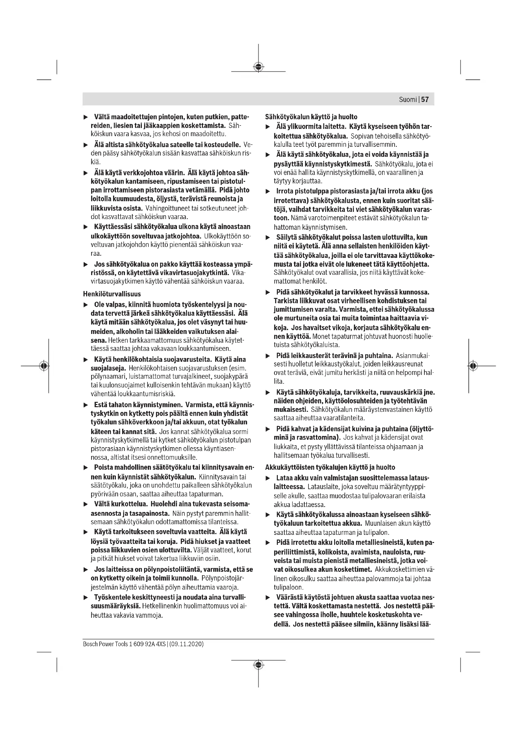 Høyt turtall, til arbeid med liten bordiameter. Temperaturavhengig overbelastningsvern Ved forskriftsmessig bruk kan ikke elektroverktøyet overbelastes. Ved for stor belastning eller overskridelse av Bosch Power Tools 1 609 92A 4XS | (09.11.2020)56 | Suomi tillatt batteritemperatur slår elektronikken elektroverktøyet av helt til det igjen har optimal driftstemperatur. Informasjon om bruk u Sett elektroverktøyet bare mot mutteren/skruen når det er slått av. Innsatsverktøy som dreier seg kan skli. Etter langvarig arbeid med lavt turtall bør du avkjøle elektroverktøyet ved å la det gå på tomgang med maksimalt turtall i ca. 3 minutter. Service og vedlikehold Vedlikehold og rengjøring u Ta alltid batteriet ut av elektroverktøyet før arbeider på elektroverktøyet utføres (f.eks. vedlikehold, verktøyskifte osv.) og før transport og oppbevaring. Det er fare for skader hvis du trykker på av/på-bryteren ved en feiltagelse. u Hold selve elektroverktøyet og ventilasjonsslissene alltid rene, for å kunne arbeide bra og sikkert. Kundeservice og kundeveiledning Kundeservice hjelper deg ved spørsmål om reparasjon og vedlikehold av produktet ditt og reservedelene. Du finner også sprengskisser og informasjon om reservedeler på www.bosch-pt.com Boschs kundeveilederteam hjelper deg gjerne hvis du har spørsmål om våre produkter og tilbehør. Ved alle forespørsler og reservedelsbestillinger må du oppgi det 10‑sifrede produktnummeret som er angitt på produktets typeskilt. Norsk Robert Bosch AS Postboks 350 1402 Ski Tel.: 64 87 89 50 Faks: 64 87 89 55 Du finner adresser til andre verksteder på: www.bosch-pt.com/serviceaddresses Transport Li-ion-batteriene i verktøyet underligger kravene for farlig gods. Batteriene kan transporteres på veier av brukeren uten ytterligere krav. Ved forsendelse gjennom tredje personer (f.eks.: lufttransport eller spedisjon) må det oppfylles spesielle krav til emballasje og merking. Du må konsultere en ekspert for farlig gods ved forberedelse av forsendelsen. Send batterier kun hvis huset ikke er skadet. Lim igjen de åpne kontaktene og pakk batteriet slik at det ikke beveger seg i emballasjen. Ta også hensyn til videreførende nasjonale forskrifter. Deponering Elektroverktøy, batterier, tilbehør og emballasje må leveres inn til miljøvennlig gjenvinning. Elektroverktøy og batterier må ikke kastes i vanlig søppel! Bare for land i EU: Iht. det europeiske direktivet 2012/19/EU om brukt elektrisk utstyr og iht. det europeiske direktivet 2006/66/ EC må defekte eller brukte batterier/oppladbare batterier samles adskilt og leveres inn for miljøvennlig resirkulering. (Oppladbare) batterier: Li-ion: Se informasjonen i avsnittet Transport (se „Transport“, Side56). Suomi Turvallisuusohjeet Yleiset sähkötyökalujen turvaohjeet VAROITUS Lue kaikki tämän sähkötyökalun mukana toimitetut varoitukset, oh- jeet, kuvat ja tekniset tiedot. Alla mainittujen ohjeiden noudattamisen laiminlyönti saattaa aiheuttaa sähköiskun, tu- lipalon ja/tai vakavan loukkaantumisen. Säilytä kaikki turvallisuusohjeet ja muut ohjeet tulevai- suutta varten. Turvallisuusohjeissa käytetty käsite "sähkötyökalu" käsittää verkkokäyttöisiä sähkötyökaluja (verkkojohdolla) ja akku- käyttöisiä sähkötyökaluja (ilman verkkojohtoa). Työpaikan turvallisuus u Pidä työskentelyalue puhtaana ja hyvin valaistuna. Työpaikan epäjärjestys tai valaisemattomat työalueet voi- vat johtaa tapaturmiin. u Älä työskentele sähkötyökalulla räjähdysalttiissa ym- päristössä, jossa on palavaa nestettä, kaasua tai pö- lyä. Sähkötyökalu muodostaa kipinöitä, jotka saattavat sytyttää pölyn tai höyryn. u Pidä lapset ja sivulliset loitolla sähkötyökalua käyt- täessäsi. Voit menettää laitteen hallinnan, jos suuntaat huomiosi muualle. Sähköturvallisuus u Sähkötyökalun pistotulpan tulee sopia pistorasiaan. Pistotulppaa ei saa muuttaa millään tavalla. Älä käytä minkäänlaisia pistorasia-adaptereita maadoitettujen sähkötyökalujen kanssa. Alkuperäisessä kunnossa ole- vat pistotulpat ja sopivat pistorasiat vähentävät sähköis- kun vaaraa. 1 609 92A 4XS | (09.11.2020) Bosch Power ToolsSuomi | 57 u Vältä maadoitettujen pintojen, kuten putkien, patte- reiden, liesien tai jääkaappien koskettamista. Säh- köiskun vaara kasvaa, jos kehosi on maadoitettu. u Älä altista sähkötyökalua sateelle tai kosteudelle. Ve- den pääsy sähkötyökalun sisään kasvattaa sähköiskun ris- kiä. u Älä käytä verkkojohtoa väärin. Älä käytä johtoa säh- kötyökalun kantamiseen, ripustamiseen tai pistotul- pan irrottamiseen pistorasiasta vetämällä. Pidä johto loitolla kuumuudesta, öljystä, terävistä reunoista ja liikkuvista osista. Vahingoittuneet tai sotkeutuneet joh- dot kasvattavat sähköiskun vaaraa. u Käyttäessäsi sähkötyökalua ulkona käytä ainoastaan ulkokäyttöön soveltuvaa jatkojohtoa. Ulkokäyttöön so- veltuvan jatkojohdon käyttö pienentää sähköiskun vaa- raa. u Jos sähkötyökalua on pakko käyttää kosteassa ympä- ristössä, on käytettävä vikavirtasuojakytkintä. Vika- virtasuojakytkimen käyttö vähentää sähköiskun vaaraa. Henkilöturvallisuus u Ole valpas, kiinnitä huomiota työskentelyysi ja nou- data tervettä järkeä sähkötyökalua käyttäessäsi. Älä käytä mitään sähkötyökalua, jos olet väsynyt tai huu- meiden, alkoholin tai lääkkeiden vaikutuksen alai- sena. Hetken tarkkaamattomuus sähkötyökalua käytet- täessä saattaa johtaa vakavaan loukkaantumiseen. u Käytä henkilökohtaisia suojavarusteita. Käytä aina suojalaseja. Henkilökohtaisen suojavarustuksen (esim. pölynaamari, luistamattomat turvajalkineet, suojakypärä tai kuulonsuojaimet kulloisenkin tehtävän mukaan) käyttö vähentää loukkaantumisriskiä. u Estä tahaton käynnistyminen. Varmista, että käynnis- tyskytkin on kytketty pois päältä ennen kuin yhdistät työkalun sähköverkk
