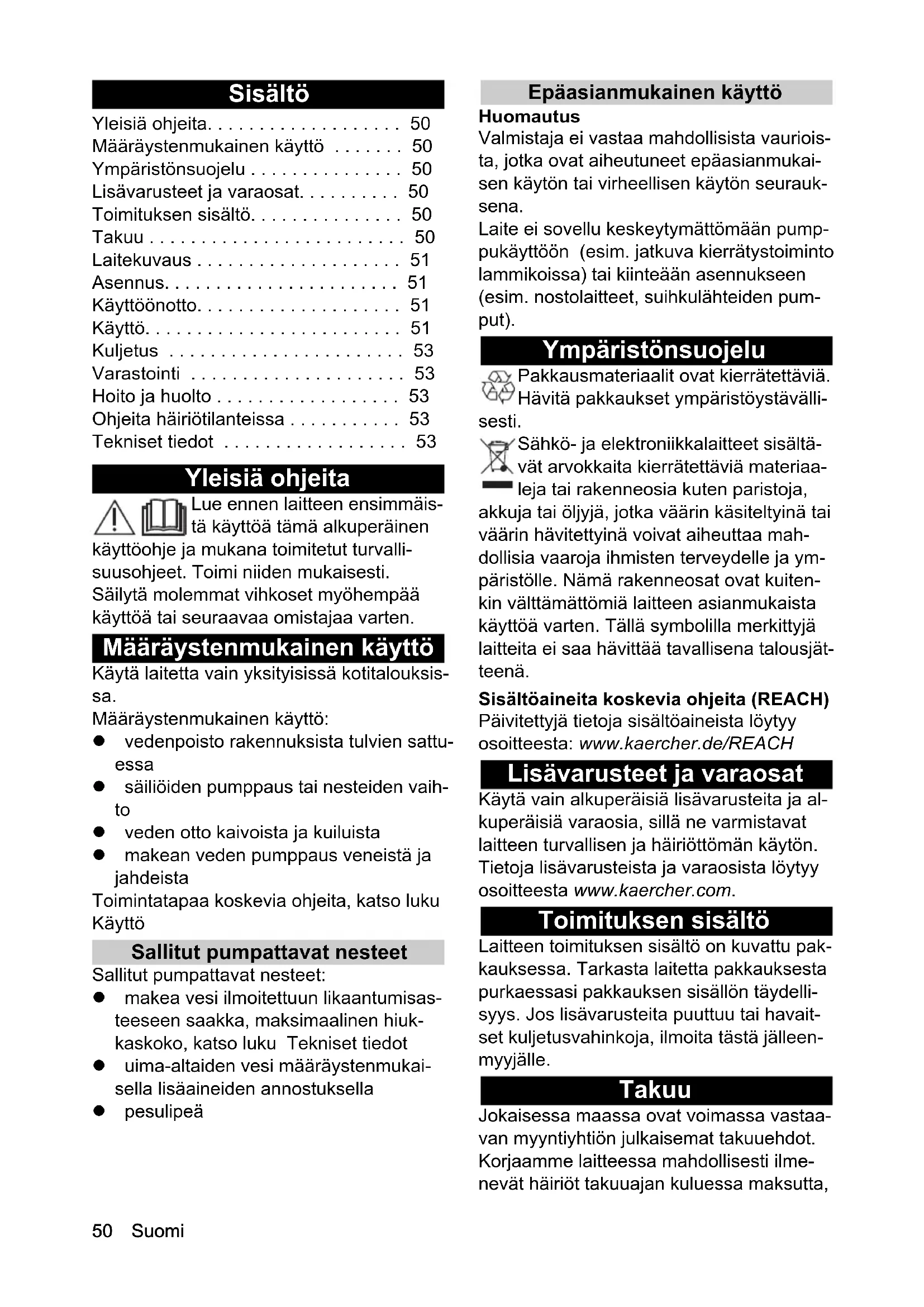 - veden otto kaivoista ja kuiluista makean veden pumppaus veneistä ja jahdeista Toimintatapaa koskevia ohjeita, katso luku Käyttö Sallitut pumpattavat nesteet Sallitut pumpattavat nesteet: makea vesi ilmoitettuun likaantumisas- teeseen saakka, maksimaalinen hiuk- kaskoko, katso luku Tekniset tiedot uima-altaiden vesi määräystenmukai- sella lisäaineiden annostuksella pesulipeä Epäasianmukainen käyttö Huomautus Valmistaja ei vastaa mahdollisista vauriois- ta, jotka ovat aiheutuneet epäasianmukai- sen käytön tai virheellisen käytön seurauk- sena. Laite ei sovellu keskeytymättömään pump- pukäyttöön (esim. jatkuva kierrätystoiminto lammikoissa) tai kiinteään asennukseen (esim. nostolaitteet, suihkulähteiden pum- put). Ympäristönsuojelu Pakkausmateriaalit ovat kierrätettäviä. Hävitä pakkaukset ympäristöystävälli- sesti. Sähkö- ja elektroniikkalaitteet sisältä- vät arvokkaita kierrätettäviä materiaa- leja tai rakenneosia kuten paristoja, akkuja tai öljyjä, jotka väärin käsiteltyinä tai väärin hävitettyinä voivat aiheuttaa mah- dollisia vaaroja ihmisten terveydelle ja ym- päristölle. Nämä rakenneosat ovat kuiten- kin välttämättömiä laitteen asianmukaista käyttöä varten. Tällä symbolilla merkittyjä laitteita ei saa hävittää tavallisena talousjät- teenä. Sisältöaineita koskevia ohjeita (REACH) Päivitettyjä tietoja sisältöaineista löytyy osoitteesta: www.kaercher.de/REACH Lisävarusteet ja varaosat Käytä vain alkuperäisiä lisävarusteita ja al- kuperäisiä varaosia, sillä ne varmistavat laitteen turvallisen ja häiriöttömän käytön. Tietoja lisävarusteista ja varaosista löytyy osoitteesta www.kaercher.com. Toimituksen sisältö Laitteen toimituksen sisältö on kuvattu pak- kauksessa. Tarkasta laitetta pakkauksesta purkaessasi pakkauksen sisällön täydelli- syys. Jos lisävarusteita puuttuu tai havait- set kuljetusvahinkoja, ilmoita tästä jälleen- myyjälle. Takuu Jokaisessa maassa ovat voimassa vastaa- van myyntiyhtiön julkaisemat takuuehdot. Korjaamme laitteessa mahdollisesti ilme- nevät häiriöt takuuajan kuluessa maksutta, Yleisiä ohjeita p. 50