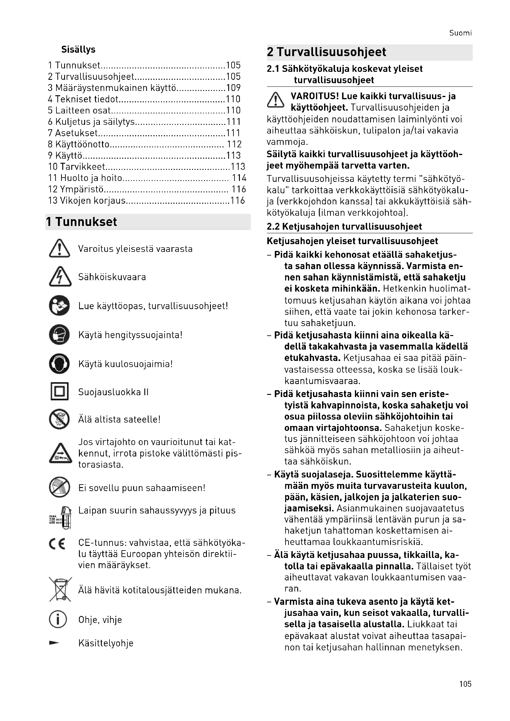 Sähkötyökalun rakenne- ja käyttösyistä sen tur vallisuuteen liittyy seuraavia jäännösriskejä, vaikka sähkötyökalua käytetään suositellulla tavalla ja noudattamalla kaikkia turvallisuus määräyksiä: – Ketjun hampaiden aiheuttama haava ketjua vaihdettaessa. – Tapaturma koskettaessa ketjua sahausalu eella. – Vaatteiden takertuminen pyörivään ketjuun. – Ympäriinsä sinkoutuvien puupalojen tai te räosien aiheuttama tapaturma. – Virtajohdon aiheuttama vaara. – Takaisku ketjun jumittumisen tai laipan kärjellä sahaamisen takia. – Terveydelle vaarallinen pölypitoisuus työs kenneltäessä huonosti tuuletetuissa tilois sa. – Loukkaantuminen jännitteisten osien kos kettamisen takia, mikäli sähkötyökalu tai sen osia puretaan ennen kuin virtajohdon pistoke on irrotettu pistorasiasta. – Kuulovaurio, jos tehdään pitkäkestoisia töi tä ilman kuulosuojaimia.