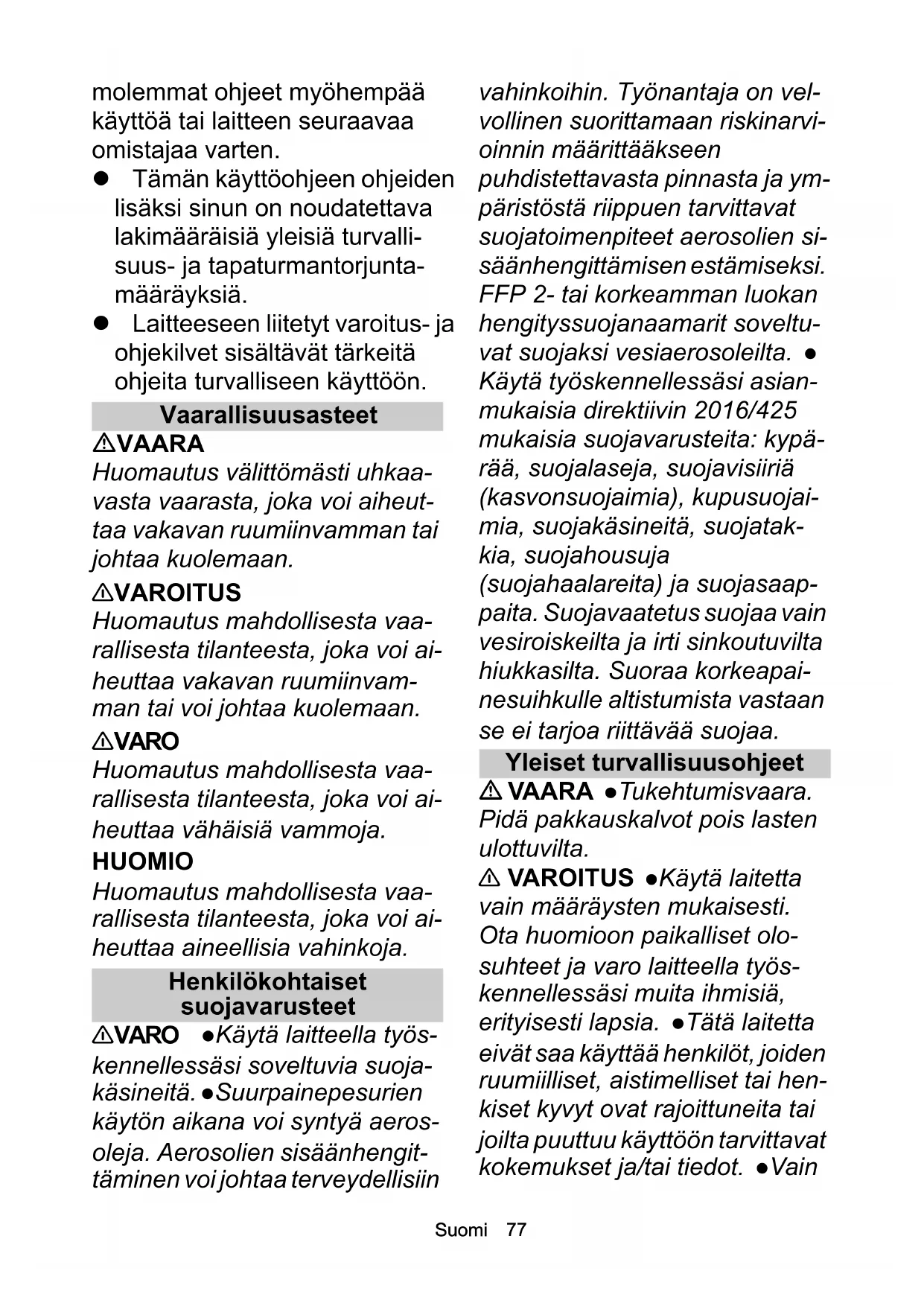 Käytä vain valmistajan toimitta- mia ja suosittelemia puhdistus- aineita. Muiden puhdistusaineiden tai kemikaali- en käyttö voi vaarantaa laitteen turvallisuuden. Älä käytä suosi- teltua puhdistusainetta laimen- tamattomana. Tuotteet ovat käyttöturvallisia, koska ne eivät sisällä happoja, lipeäliuoksia tai ympäristölle haitallisia aineita. Jos puhdistusaineita menee sil- miin, huuhtele ne välittömästi runsaalla vedellä ja hakeudu heti lääkärin hoitoon, kuten puh- distusaineita nieltäessäkin. Laite käden-käsivarren tärinäarvolla > 2,5 m/s² (katso käyttöohjeen luku Tekniset tiedot) 몇 VARO Laitteen pitkäaikaisessa käytös- sä voi käsissä syntyä tärinän ai- heuttamia verenkiertohäiriöitä. Yleispätevää kestoa laitteen käytölle ei voida määrittää, kos- ka se riippuu monista tekijöistä: Henkilökohtainen taipumus heikentyneeseen verenkier-82 Suomi toon (usein kylmät sormet, sormien kihelmöinti) Alhainen ympäristön lämpöti- la. Käytä käsiesi suojana läm- pimiä käsineitä. Lujan tarttumisen estämä ve- renkierto. Keskeytymätön käyttö on va- hingollisempaa kuin taukojen keskeyttämä käyttö. Jos käytät laitetta säännöllisesti, pitkäaikaisesti ja sinulla ilmenee toistuvasti oireita, kuten esim. sormien kihelmöintiä, kylmät sormet, sinun tulee kääntyä lää- kärin puoleen. Ilmatäytteisillä renkailla varustettu laitteet 몇 VARO Laitteissa, joissa on ruuvatut vanteet: Varmista, että kaikki vanteen ruuvit on kiristet- ty, ennen kuin säädät renkaiden täyttöpaineen. Varmista, että kompressorin paineenalennin on säädetty oikein, ennen kuin säädät renkaiden täyttöpaineen. l Älä koskaan ylitä renkaiden sallittua enimmäistäyttöpainetta. Lue renkaiden täyttöpaine ren- kaista ja tarvittaessa vanteesta. Jos arvot ovat erilaiset, on nou- datettava pienempää arvoa. Kuumavesi- ja bensiinimoottorilla varustetut laitteet, polttomoottorilla varustetut laitteet VAARA Soveltumattoman polttoaineen aiheuttama räjäh- dysvaara. Tankkaa vain käyttö- ohjeessa ilmoitettua polttoainetta. Pysäytä moottori ennen tankkaamista. Älä lisää polttoainetta suljetuissa tiloissa. 몇 VAROITUS Pakokaasut ovat myrkyllisiä. Älä hengitä pa- kokaasuja. Varmista riittävä il- manvaihto ja pakokaasujen poisto, kun käytät laitetta sisällä. l Varmista tankattaessa, ettei polttoainetta päädy kuumille pin- noille. Ota läikkynyt polttoaine välittömästi talteen. 몇 VARO Palovammojen vaa- ra. Älä kumarru pakokaasuau- kon päälle äläkä tartu siihen. Älä kosketa lämmityskattilaa poltin- käytössä. Älä koskaan sulje pakokaasuaukkoja. Varmista, ettei ilman sisääntulojen lähellä ilmene pakokaasupäästöjä. Noudata käyttöohjeessa olevia bensamoottorilla varustettujen laitteiden turvallisuusohjeita. Hoito ja huolto 몇 VAROITUS Kytke laite pois päältä ja irrota verkkokäyttöisten laitteiden tapauksessa verkko- pistoke ennen puhdistamista, huoltoa ja osien vaihtoa. Tee suurpainejärjestelmä paineetto- maksi ennen kaikkia laitteella ja lisävarusteilla tehtäviä töitä. 몇 VARO Teetä korjaukset ai- noastaan hyväksytyissä palvelu- pisteissä tai tämän alan ammattilaisilla, jotka tuntevatΕλληνικά 83 kaikki asiaan liittyvät turvalli- suusmääräykset. Ota laite uu- delleen käyttöön vasta kaikkien häiriöiden korjaamisen jälkeen. HUOMIO Noudata liikkuvien, ammattikäytössä käytettyjen laitteiden turvallisuustarkastuk- sessa paikallisesti sovellettavia määräyksiä. Oikosulut tai muut vauriot. Älä puhdistusta laitetta letkulla tai suurpaineisella vedel- lä suihkuttamalla. Älä käytä asetonia, laimentamattomia happoja tai liuotinaineita, koska ne syövyttävät laitteeseen käy- tettyjä materiaaleja. Lisävarusteet ja varaosat 몇 VARO Käytä vain valmista- jan hyväksymiä lisävarusteita ja varaosia. Alkuperäiset lisäva- rusteet ja varaosat varmistavat laitteen turvallisen ja häiriöttö- män käytön. Anna korjaukset ja varaosien asennus vain hy- väksyttyjen palvelupisteiden tehtäväksi, jolloin vältetään ris- kit. Kuljetus 몇 VARO Kytke laite pois pääl- tä ennen kuljetusta. Kiinnitä laite ottaen huomioon paino, katso käyttöohjeen luku Tekniset tie- dot. Onnettomuus- ja louk- kaantumisvaara. Ota kuljetuksessa ja varastoinnissa huomioon laitteen paino, katso luku Tekniset tiedot käyttöoh- jeessa. Huomioi yleisillä teillä tapahtuvissa kuljetuksissa maa- kohtainen lainsäädäntö. Käytä voimassa olevien määräysten mukaisia ja suojalaitteilla varus- tettuja köysiä, ketjuja, vetolait- teita ja nostoapuvälineitä. Υποδείξεις ασφαλείας Συσκευή καθαρισμού υψηλής