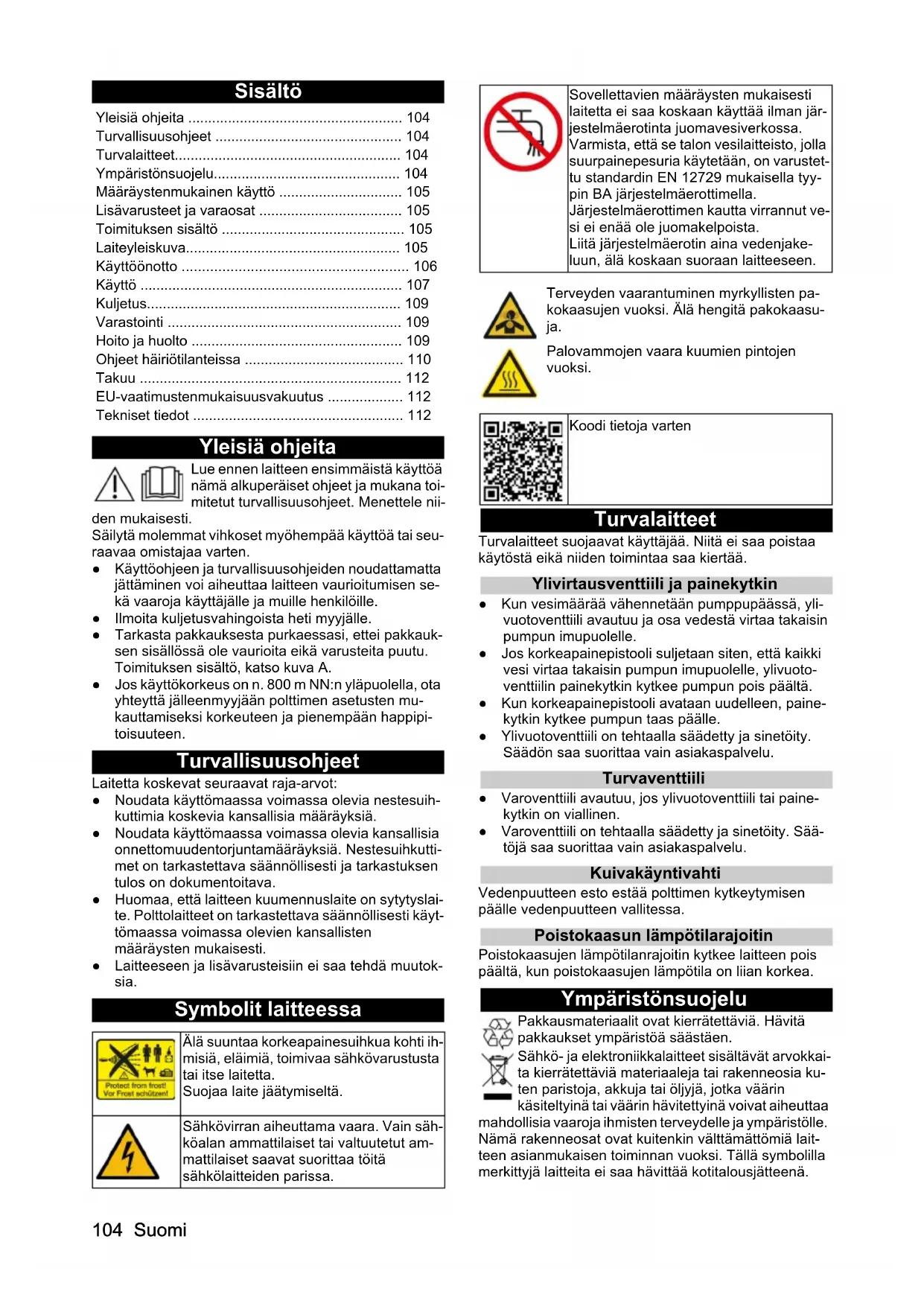 - HDS 7/16 CXA104 Suomi Sisältö Yleisiä ohjeita Lue ennen laitteen ensimmäistä käyttöä nämä alkuperäiset ohjeet ja mukana toi- mitetut turvallisuusohjeet. Menettele nii- den mukaisesti. Säilytä molemmat vihkoset myöhempää käyttöä tai seu- raavaa omistajaa varten. ● Käyttöohjeen ja turvallisuusohjeiden noudattamatta jättäminen voi aiheuttaa laitteen vaurioitumisen se- kä vaaroja käyttäjälle ja muille henkilöille. ● Ilmoita kuljetusvahingoista heti myyjälle. ● Tarkasta pakkauksesta purkaessasi, ettei pakkauk- sen sisällössä ole vaurioita eikä varusteita puutu. Toimituksen sisältö, katso kuva A. ● Jos käyttökorkeus on n. 800 m NN:n yläpuolella, ota yhteyttä jälleenmyyjään polttimen asetusten mu- kauttamiseksi korkeuteen ja pienempään happipi- toisuuteen. Turvallisuusohjeet Laitetta koskevat seuraavat raja-arvot: ● Noudata käyttömaassa voimassa olevia nestesuih- kuttimia koskevia kansallisia määräyksiä. ● Noudata käyttömaassa voimassa olevia kansallisia onnettomuudentorjuntamääräyksiä. Nestesuihkutti- met on tarkastettava säännöllisesti ja tarkastuksen tulos on dokumentoitava. ● Huomaa, että laitteen kuumennuslaite on sytytyslai- te. Polttolaitteet on tarkastettava säännöllisesti käyt- tömaassa voimassa olevien kansallisten määräysten mukaisesti. ● Laitteeseen ja lisävarusteisiin ei saa tehdä muutok- sia. Symbolit laitteessa Turvalaitteet Turvalaitteet suojaavat käyttäjää. Niitä ei saa poistaa käytöstä eikä niiden toimintaa saa kiertää. Ylivirtausventtiili ja painekytkin ● Kun vesimäärää vähennetään pumppupäässä, yli- vuotoventtiili avautuu ja osa vedestä virtaa takaisin pumpun imupuolelle. ● Jos korkeapainepistooli suljetaan siten, että kaikki vesi virtaa takaisin pumpun imupuolelle, ylivuoto- venttiilin painekytkin kytkee pumpun pois päältä. ● Kun korkeapainepistooli avataan uudelleen, paine- kytkin kytkee pumpun taas päälle. ● Ylivuotoventtiili on tehtaalla säädetty ja sinetöity. Säädön saa suorittaa vain asiakaspalvelu. Turvaventtiili ● Varoventtiili avautuu, jos ylivuotoventtiili tai paine- kytkin on viallinen. ● Varoventtiili on tehtaalla säädetty ja sinetöity. Sää- töjä saa suorittaa vain asiakaspalvelu. Kuivakäyntivahti Vedenpuutteen esto estää polttimen kytkeytymisen päälle vedenpuutteen vallitessa. Poistokaasun lämpötilarajoitin Poistokaasujen lämpötilanrajoitin kytkee laitteen pois päältä, kun poistokaasujen lämpötila on liian korkea. Ympäristönsuojelu Pakkausmateriaalit ovat kierrätettäviä. Hävitä pakkaukset ympäristöä säästäen. Sähkö- ja elektroniikkalaitteet sisältävät arvokkai- ta kierrätettäviä materiaaleja tai rakenneosia ku- ten paristoja, akkuja tai öljyjä, jotka väärin käsiteltyinä tai väärin hävitettyinä voivat aiheuttaa mahdollisia vaaroja ihmisten terveydelle ja ympäristölle. Nämä rakenneosat ovat kuitenkin välttämättömiä lait- teen asianmukaisen toiminnan vuoksi. Tällä symbolilla merkittyjä laitteita ei saa hävittää kotitalousjätteenä. Yleisiä ohjeita p. 104