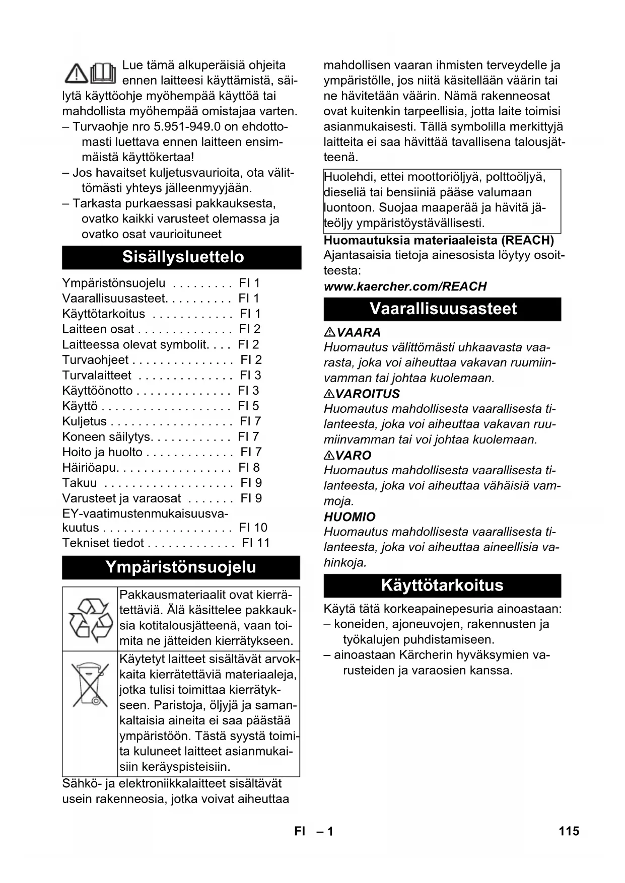 • ainoastaan Kärcherin hyväksymien varusteiden ja varaosien kanssa.