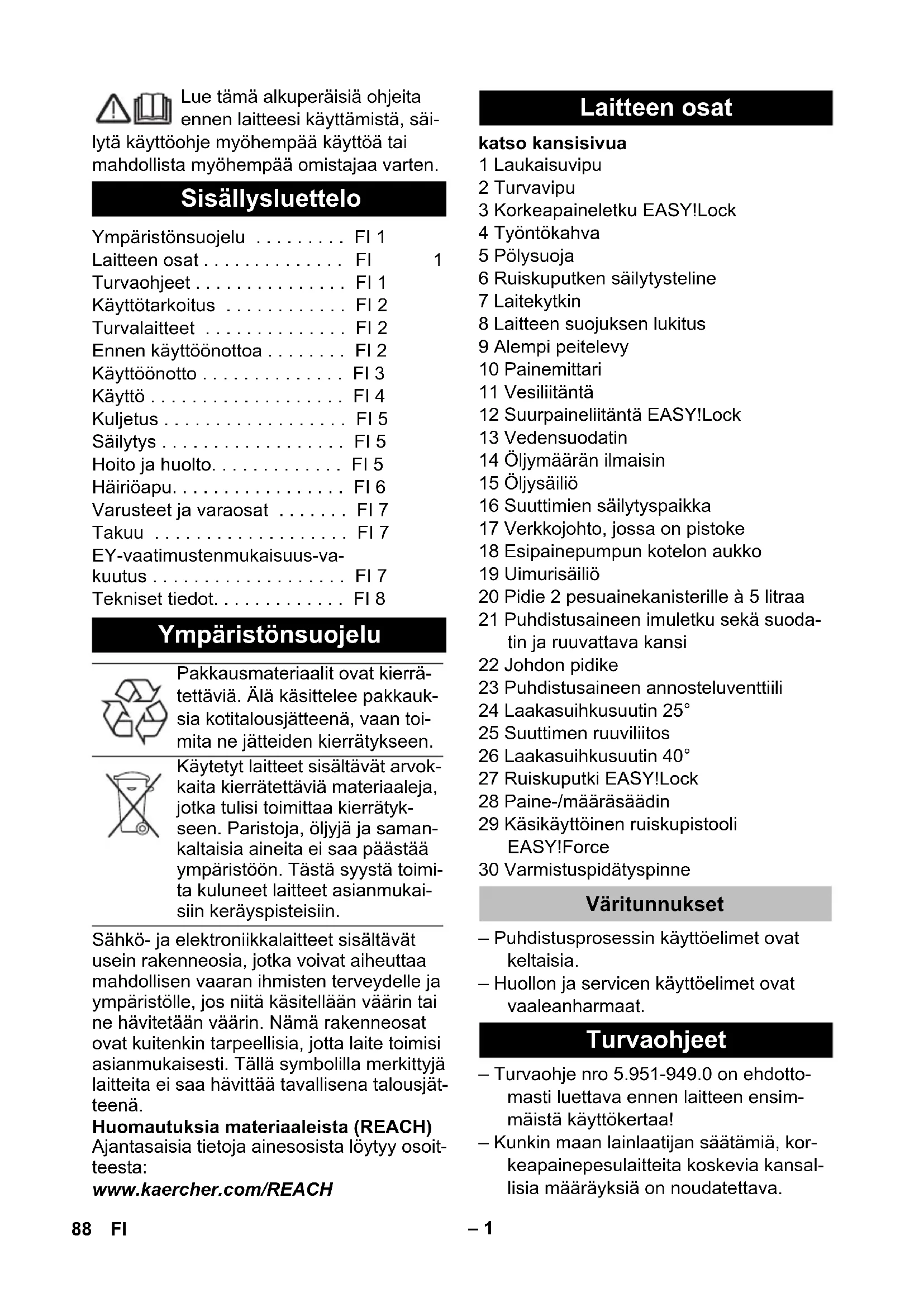 dB(A) 86 Drivmedel Oljemängd l 0,75 Oljesorter -- Hypoid SAE 90 Mått och vikt Längd mm 524 Bredd mm 650 Höjd mm 1100 Typisk driftvikt kg 77 87SV– 1 Lue tämä alkuperäisiä ohjeita ennen laitteesi käyttämistä, säi- lytä käyttöohje myöhempää käyttöä tai mahdollista myöhempää omistajaa varten. Sähkö- ja elektroniikkalaitteet sisältävät usein rakenneosia, jotka voivat aiheuttaa mahdollisen vaaran ihmisten terveydelle ja ympäristölle, jos niitä käsitellään väärin tai ne hävitetään väärin. Nämä rakenneosat ovat kuitenkin tarpeellisia, jotta laite toimisi asianmukaisesti. Tällä symbolilla merkittyjä laitteita ei saa hävittää tavallisena talousjät- teenä. Huomautuksia materiaaleista (REACH) Ajantasaisia tietoja ainesosista löytyy osoit- teesta: www.kaercher.com/REACH katso kansisivua 1 Laukaisuvipu 2 Turvavipu 3 Korkeapaineletku EASY!Lock 4 Työntökahva 5 Pölysuoja 6 Ruiskuputken säilytysteline 7 Laitekytkin 8 Laitteen suojuksen lukitus 9 Alempi peitelevy 10 Painemittari 11 Vesiliitäntä 12 Suurpaineliitäntä EASY!Lock 13 Vedensuodatin 14 Öljymäärän ilmaisin 15 Öljysäiliö 16 Suuttimien säilytyspaikka 17 Verkkojohto, jossa on pistoke 18 Esipainepumpun kotelon aukko 19 Uimurisäiliö 20 Pidie 2 pesuainekanisterille à 5 litraa 21 Puhdistusaineen imuletku sekä suoda- tin ja ruuvattava kansi 22 Johdon pidike 23 Puhdistusaineen annosteluventtiili 24 Laakasuihkusuutin 25° 25 Suuttimen ruuviliitos 26 Laakasuihkusuutin 40° 27 Ruiskuputki EASY!Lock 28 Paine-/määräsäädin 29 Käsikäyttöinen ruiskupistooli EASY!Force 30 Varmistuspidätyspinne – Puhdistusprosessin käyttöelimet ovat keltaisia. – Huollon ja servicen käyttöelimet ovat vaaleanharmaat. – Turvaohje nro 5.951-949.0 on ehdotto- masti luettava ennen laitteen ensim- mäistä käyttökertaa! – Kunkin maan lainlaatijan säätämiä, kor- keapainepesulaitteita koskevia kansal- lisia määräyksiä on noudatettava. Sisällysluettelo Ympäristönsuojelu . . . . . . . . . FI 1 Laitteen osat . . . . . . . . . . . . . . FI 1 Turvaohjeet . . . . . . . . . . . . . . . FI 1 Käyttötarkoitus . . . . . . . . . . . . FI 2 Turvalaitteet . . . . . . . . . . . . . . FI 2 Ennen käyttöönottoa . . . . . . . . FI 2 Käyttöönotto . . . . . . . . . . . . . . FI 3 Käyttö . . . . . . . . . . . . . . . . . . . FI 4 Kuljetus . . . . . . . . . . . . . . . . . . FI 5 Säilytys . . . . . . . . . . . . . . . . . . FI 5 Hoito ja huolto. . . . . . . . . . . . . FI 5 Häiriöapu. . . . . . . . . . . . . . . . . FI 6 Varusteet ja varaosat . . . . . . . FI 7 Takuu . . . . . . . . . . . . . . . . . . . FI 7 EY-vaatimustenmukaisuus-va- kuutus . . . . . . . . . . . . . . . . . . . FI 7 Tekniset tiedot. . . . . . . . . . . . . FI 8 Ympäristönsuojelu Pakkausmateriaalit ovat kierrä- tettäviä. Älä käsittelee pakkauk- sia kotitalousjätteenä, vaan toi- mita ne jätteiden kierrätykseen. Käytetyt laitteet sisältävät arvok- kaita kierrätettäviä materiaaleja, jotka tulisi toimittaa kierrätyk- seen. Paristoja, öljyjä ja saman- kaltaisia aineita ei saa päästää ympäristöön. Tästä syystä toimi- ta kuluneet laitteet asianmukai- siin keräyspisteisiin. Laitteen osat Väritunnukset Turvaohjeet 88 FI– 2 – Kunkin maan lainlaatijan säätämiä, työ- turvallisuutta koskevia kansallisia mää- räyksiä on noudatettava. Korkeapaine- pesulaitteet on tarkastettava säännölli- sin väliajoin ja tarkastuksen tulokset on tallennettava kirjallisesti. – Laitetta/varusteita ei saa muuttaa. VAARA Huomautus välittömästi uhkaavasta vaa- rasta, joka voi aiheuttaa vakavan ruumiin- vamman tai johtaa kuolemaan. 몇 VAROITUS Huomautus mahdollisesta vaarallisesta ti- lanteesta, joka voi aiheuttaa vakavan ruu- miinvamman tai voi johtaa kuolemaan. 몇 VARO Huomautus mahdollisesta vaarallisesta ti- lanteesta, joka voi aiheuttaa vähäisiä vam- moja. HUOMIO Huomautus mahdollisesta vaarallisesta ti- lanteesta, joka voi aiheuttaa aineellisia va- hinkoja. Epäasianmukaisesti käytettyinä suurpainesuihkut voivat olla vaa- rallisia. Suihkua ei saa suunnata ihmisiin, eläimiin, aktiivisiin sähkövarusteisiin tai itse laitteeseen. Voimassa olevien määräysten mu- kaan laitetta ei saa käyttää milloin- kaan juomavesiverkossa ilman jär- jestelmäerotintinta. Tällöin on käy- tettävä KÄRCHER:in soveltuvaa järjestel- mäerotinta tai vaihtoehtoisesti normin EN 12729 tyyppi BA mukaista järjestelmäero- tinta. Vesi, joka on valunut järjestelmäerottimen lävitse, ei ole juomakelpoista. 몇 VARO Liitä järjestelmäerotin aina vedensyöttöön, ei koskaan suoraan laitteeseen. Tätä laitetta käytetään ainoastaan korkeapai- nepesuun pesuaineella tai ilman (esim. elin- tarviketeollisuudessa, teurastamoissa...). Kun vesimäärää vähennetään paine-/mää- räsäätimen avulla, ylivirtausventtiili aukeaa ja osa vedestä virtaa takaisin pumpun puo- lelle. Kun käsiruiskupistoolin liipaisin päästetään irti, painekytkin kytkee pumpun pois päältä, suurpainesuihku pysähtyy. Kun liipaisimes- ta vedetään, pumppu kytkeytyy taas päälle. Varoventtiili avautuu sallitun käyttöylipai- neen ylittyessä; vesi virtaa takaisin pumpun imupuolelle. Ylivirtausventtiili, painekytkin ja varoventtiili on säädetty tehtaalla ja sinetöity lyijyllä. Ainoastaan asiakaspalvelu voi suorittaa säädön. Uimurisäiliön kuivakäyntivahti kytkee moot- torin pois, kun vedentulo ei ole riittävää (ve- denpaine liian matala). Pumppu suojataan kuivakäynniltä. – Tarkasta pakkauksen sisältö sitä puret- taessa. – Jos havaitset kuljetusvaurioita, ota välit- tömästi yhteys jälleenmyyjään. Ruuvaa laitteen kotelon lukituksen risti- ruuvi ulos ja avaa laitteen kotelo. Vedä alempi peitelevy ulos yläsuunnas- sa ja ripusta se alhaalla. Lue öljymäärämittari laitteen ollessa py- säytettynä. Öljyn pinnan tulee olla mo- lempien merkintöjen välissä. Vaarallisuusasteet Laitteessa olevat symbolit K