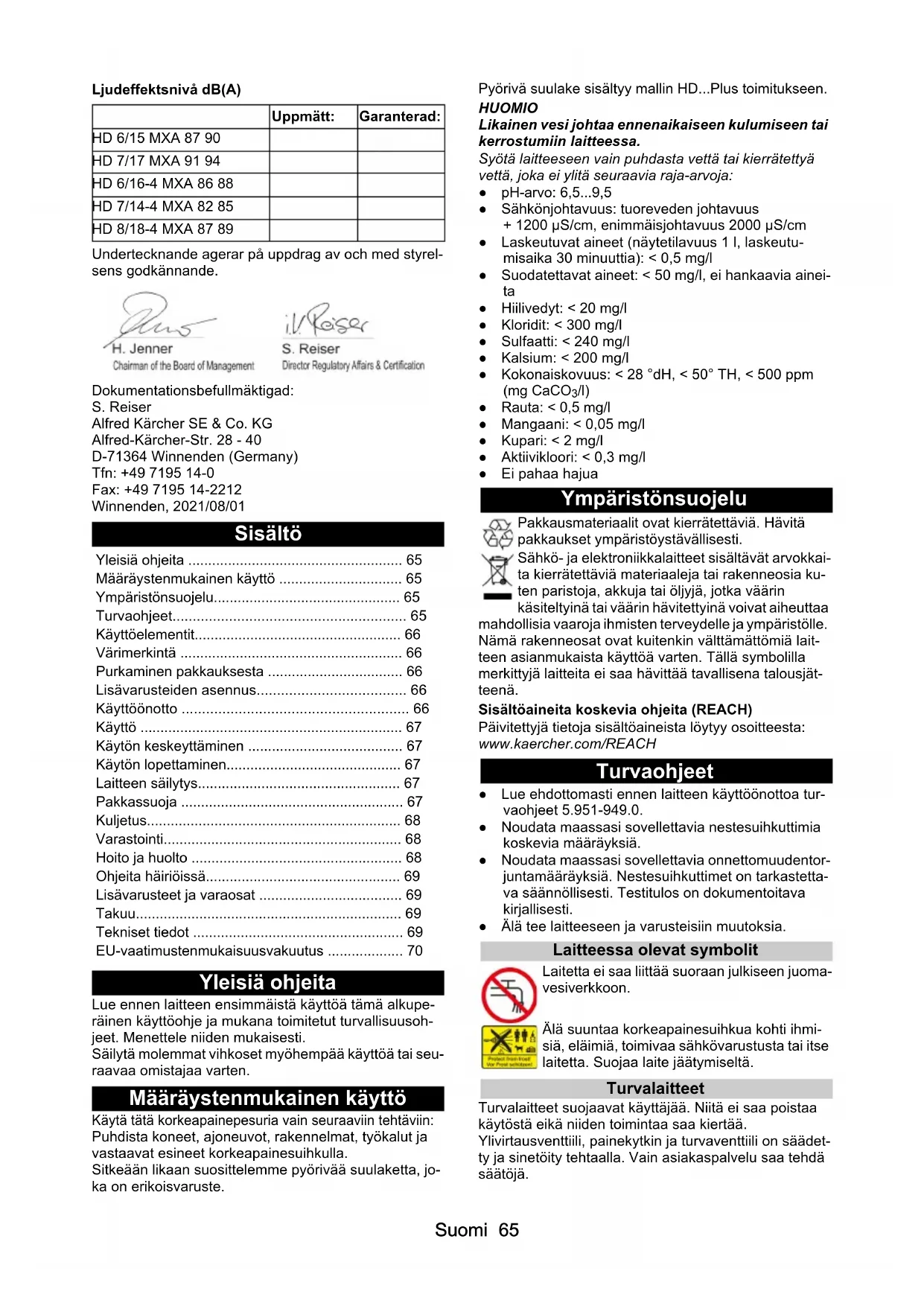 dB(A)90909488858889 HD 6/15 MXA HD 6/15 MXA HD 7/17 MXA HD 6/ 16-4 MXA HD 7/ 14-4 MXA HD 7/ 16-4 MXA HD 8/ 18-4 MXASuomi 65 Ljudeffektsnivå dB(A) Undertecknande agerar på uppdrag av och med styrel- sens godkännande. Dokumentationsbefullmäktigad: S. Reiser Alfred Kärcher SE & Co. KG Alfred-Kärcher-Str. 28 - 40 D-71364 Winnenden (Germany) Tfn: +49 7195 14-0 Fax: +49 7195 14-2212 Winnenden, 2021/08/01 Sisältö Yleisiä ohjeita Lue ennen laitteen ensimmäistä käyttöä tämä alkupe- räinen käyttöohje ja mukana toimitetut turvallisuusoh- jeet. Menettele niiden mukaisesti. Säilytä molemmat vihkoset myöhempää käyttöä tai seu- raavaa omistajaa varten. Määräystenmukainen käyttö Käytä tätä korkeapainepesuria vain seuraaviin tehtäviin: Puhdista koneet, ajoneuvot, rakennelmat, työkalut ja vastaavat esineet korkeapainesuihkulla. Sitkeään likaan suosittelemme pyörivää suulaketta, jo- ka on erikoisvaruste. Pyörivä suulake sisältyy mallin HD...Plus toimitukseen. HUOMIO Likainen vesi johtaa ennenaikaiseen kulumiseen tai kerrostumiin laitteessa. Syötä laitteeseen vain puhdasta vettä tai kierrätettyä vettä, joka ei ylitä seuraavia raja-arvoja: ● pH-arvo: 6,5...9,5 ● Sähkönjohtavuus: tuoreveden johtavuus + 1200 µS/cm, enimmäisjohtavuus 2000 µS/cm ● Laskeutuvat aineet (näytetilavuus 1 l, laskeutu- misaika 30 minuuttia): < 0,5 mg/l ● Suodatettavat aineet: < 50 mg/l, ei hankaavia ainei-