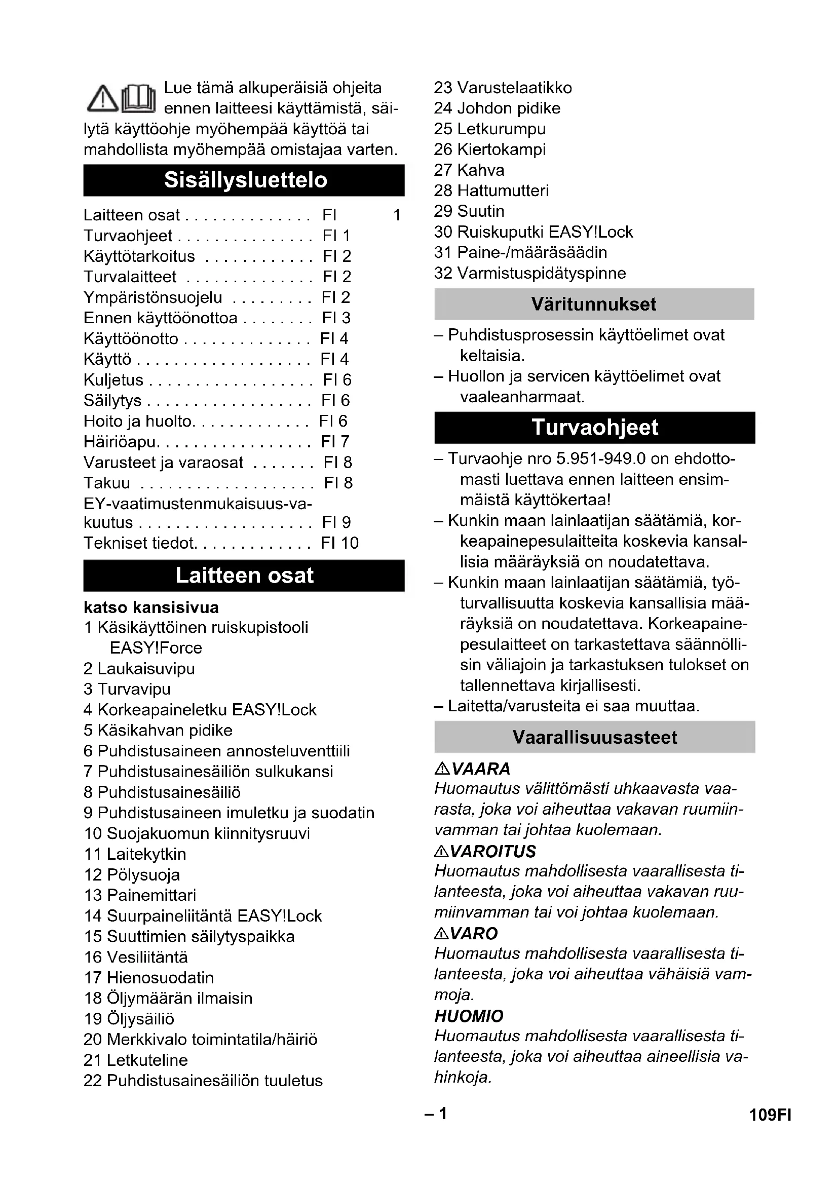- 1.286-902.0: 75,5 kg; 1.286-903.0: 75,7 kg; 1.286-913.0: 69,1 kg; 1.286-927: 82,5 kg ** 1.286-914.0: 77,5 kg; 1.286-928.0: 86 kg 108 SV– 1 Lue tämä alkuperäisiä ohjeita ennen laitteesi käyttämistä, säi- lytä käyttöohje myöhempää käyttöä tai mahdollista myöhempää omistajaa varten. katso kansisivua 1 Käsikäyttöinen ruiskupistooli EASY!Force 2 Laukaisuvipu 3 Turvavipu 4 Korkeapaineletku EASY!Lock 5 Käsikahvan pidike 6 Puhdistusaineen annosteluventtiili 7 Puhdistusainesäiliön sulkukansi 8 Puhdistusainesäiliö 9 Puhdistusaineen imuletku ja suodatin 10 Suojakuomun kiinnitysruuvi 11 Laitekytkin 12 Pölysuoja 13 Painemittari 14 Suurpaineliitäntä EASY!Lock 15 Suuttimien säilytyspaikka 16 Vesiliitäntä 17 Hienosuodatin 18 Öljymäärän ilmaisin 19 Öljysäiliö 20 Merkkivalo toimintatila/häiriö 21 Letkuteline 22 Puhdistusainesäiliön tuuletus 23 Varustelaatikko 24 Johdon pidike 25 Letkurumpu 26 Kiertokampi 27 Kahva 28 Hattumutteri 29 Suutin 30 Ruiskuputki EASY!Lock 31 Paine-/määräsäädin 32 Varmistuspidätyspinne – Puhdistusprosessin käyttöelimet ovat keltaisia. – Huollon ja servicen käyttöelimet ovat vaaleanharmaat. – Turvaohje nro 5.951-949.0 on ehdotto- masti luettava ennen laitteen ensim- mäistä käyttökertaa! – Kunkin maan lainlaatijan säätämiä, kor- keapainepesulaitteita koskevia kansal- lisia määräyksiä on noudatettava. – Kunkin maan lainlaatijan säätämiä, työ- turvallisuutta koskevia kansallisia mää- räyksiä on noudatettava. Korkeapaine- pesulaitteet on tarkastettava säännölli- sin väliajoin ja tarkastuksen tulokset on tallennettava kirjallisesti. – Laitetta/varusteita ei saa muuttaa. VAARA Huomautus välittömästi uhkaavasta vaa- rasta, joka voi aiheuttaa vakavan ruumiin- vamman tai johtaa kuolemaan. 몇 VAROITUS Huomautus mahdollisesta vaarallisesta ti- lanteesta, joka voi aiheuttaa vakavan ruu- miinvamman tai voi johtaa kuolemaan. 몇 VARO Huomautus mahdollisesta vaarallisesta ti- lanteesta, joka voi aiheuttaa vähäisiä vam- moja. HUOMIO Huomautus mahdollisesta vaarallisesta ti- lanteesta, joka voi aiheuttaa aineellisia va- hinkoja. Sisällysluettelo Laitteen osat . . . . . . . . . . . . . . FI 1 Turvaohjeet . . . . . . . . . . . . . . . FI 1 Käyttötarkoitus . . . . . . . . . . . . FI 2 Turvalaitteet . . . . . . . . . . . . . . FI 2 Ympäristönsuojelu . . . . . . . . . FI 2 Ennen käyttöönottoa . . . . . . . . FI 3 Käyttöönotto . . . . . . . . . . . . . . FI 4 Käyttö . . . . . . . . . . . . . . . . . . . FI 4 Kuljetus . . . . . . . . . . . . . . . . . . FI 6 Säilytys . . . . . . . . . . . . . . . . . . FI 6 Hoito ja huolto. . . . . . . . . . . . . FI 6 Häiriöapu. . . . . . . . . . . . . . . . . FI 7 Varusteet ja varaosat . . . . . . . FI 8 Takuu . . . . . . . . . . . . . . . . . . . FI 8 EY-vaatimustenmukaisuus-va- kuutus . . . . . . . . . . . . . . . . . . . FI 9 Tekniset tiedot. . . . . . . . . . . . . FI 10 Laitteen osat Väritunnukset Turvaohjeet Vaarallisuusasteet 109FI– 2 Epäasianmukaisesti käytettyinä suurpainesuihkut voivat olla vaa- rallisia. Suihkua ei saa suunnata ihmisiin, eläimiin, aktiivisiin sähkövarusteisiin tai itse laitteeseen. Voimassa olevien määräysten mu- kaan laitetta ei saa käyttää milloin- kaan juomavesiverkossa ilman jär- jestelmäerotintinta. Tällöin on käy- tettävä KÄRCHER:in soveltuvaa järjestel- mäerotinta tai vaihtoehtoisesti normin EN 12729 tyyppi BA mukaista järjestelmäero- tinta. Vesi, joka on valunut järjestelmäerottimen lävitse, ei ole juomakelpoista. 몇 VARO Liitä järjestelmäerotin aina vedensyöttöön, ei koskaan suoraan laitteeseen. Käytä tätä painepesuria ainoastaan – puhdistamiseen matalapainesuihkulla ja puhdistusaineella (esim. koneet, ajo- neuvot, rakennukset ja työkalut), – puhdistamiseen korkeapainesuihkulla ilman pesuainetta (esim. julkisivut, te- rassit, puutarhalaitteet). Pinttyneen lian puhdistamiseen suositte- lemme erikoisvarusteena saatavaa lianjyr- sintä. Veden laatuvaatimukset: HUOMIO Korkeapainelaitteistossa saa käyttää aino- astaan puhdasta vettä. Epäpuhtaudet joh- tavat ennenaikaiseen kulumiseen tai ker- rostumien muodostumiseen. Jos käytetään recycling-vettä, seuraavia raja-arvoja ei saa ylittää: Turvalaitteet on tarkoitettu käyttäjän suo- jaamiseksi loukkaantumiselta, eikä niitä saa poistaa käytöstä, eikä niiden toimintoa saa ohittaa. Kun vesimäärää vähennetään paine-/mää- räsäätimen avulla, ylivirtausventtiili aukeaa ja osa vedestä virtaa takaisin pumpun puo- lelle. Kun käsiruiskupistoolin liipaisin päästetään irti, painekytkin kytkee pumpun pois päältä, suurpainesuihku pysähtyy. Kun liipaisimes- ta vedetään, pumppu kytkeytyy taas päälle. Ylivirtausventtiili ja painekytkin on tehtaalla säädetty ja varmistettu lyijysinetillä. Aino- astaan asiakaspalvelu voi suorittaa sää- dön. Laitteessa olevat symbolit Käyttötarkoitus pH-arvo 6,5...9,5 sähkönjohtokyky * Tuoreveden sähkönjohta- vuus +1200 µS/cm erotettavissa olevat aineet