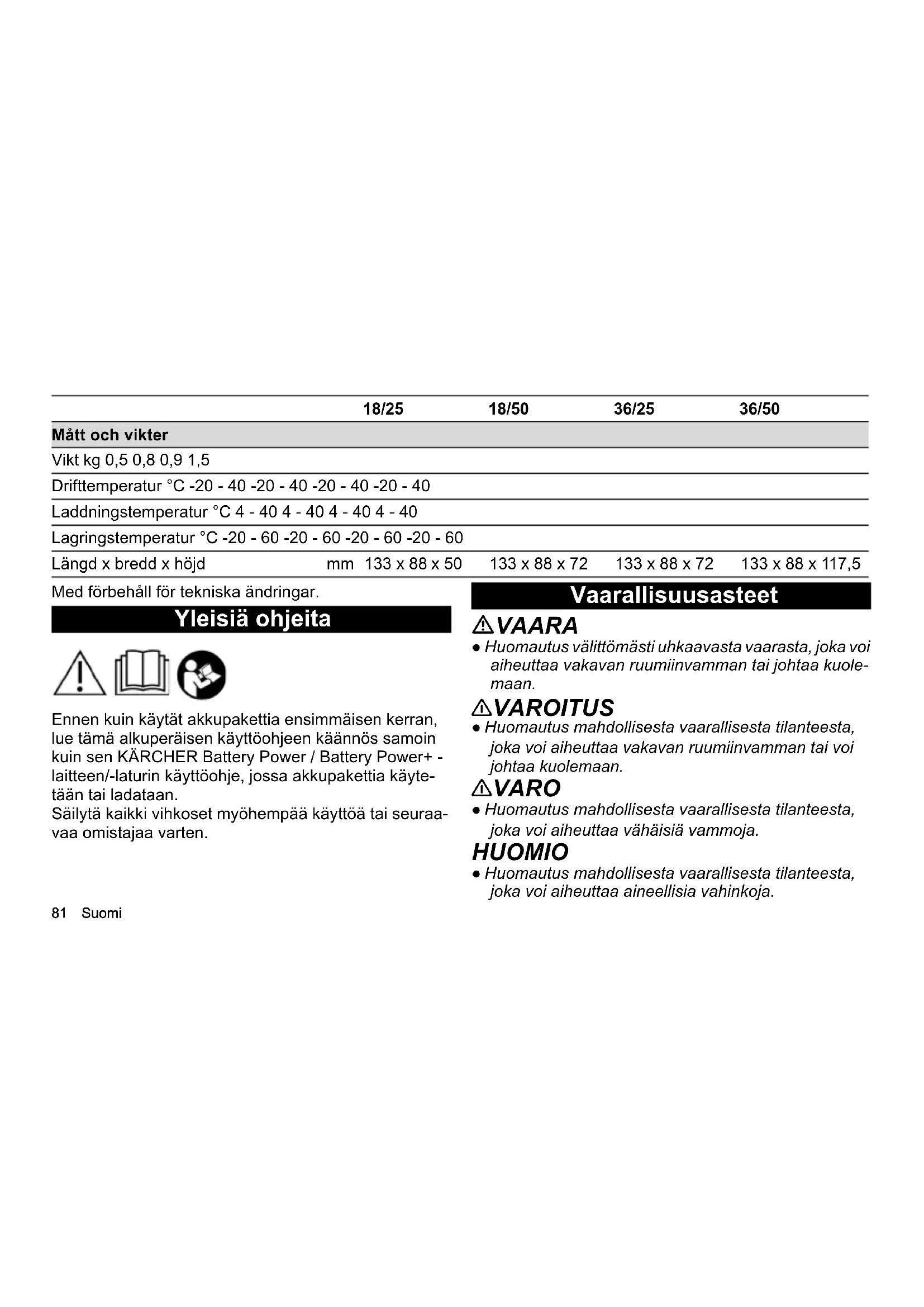 det igen. Tekniska data 18/25 18/50 36/25 36/50 Elanslutning Batteripaketets märkspänning V 18 18 36 36 Batteriplattform Battery Power Battery Power Battery Power Battery Power Kompatibel med batteriplattform Battery Power + Battery Power + Battery Power + Battery Power + Typ av batteripaket Li-ION Li-ION Li-ION Li-ION Märkkapacitet (enligt IEC/EN 61960) Ah 2,5 5,0 2,5 5,0 Nominell storlek Wh 45 90 90 180 Max. laddström A 3,5 7,5 3,5 7,581 Suomi Med förbehåll för tekniska ändringar. Yleisiä ohjeita Ennen kuin käytät akkupakettia ensimmäisen kerran, lue tämä alkuperäisen käyttöohjeen käännös samoin kuin sen KÄRCHER Battery Power / Battery Power+ - laitteen/-laturin käyttöohje, jossa akkupakettia käyte- tään tai ladataan. Säilytä kaikki vihkoset myöhempää käyttöä tai seuraa- vaa omistajaa varten. Vaarallisuusasteet VAARA ● Huomautus välittömästi uhkaavasta vaarasta, joka voi aiheuttaa vakavan ruumiinvamman tai johtaa kuole- maan. 몇 VAROITUS ● Huomautus mahdollisesta vaarallisesta tilanteesta, joka voi aiheuttaa vakavan ruumiinvamman tai voi johtaa kuolemaan. 몇 VARO ● Huomautus mahdollisesta vaarallisesta tilanteesta, joka voi aiheuttaa vähäisiä vammoja. HUOMIO ● Huomautus mahdollisesta vaarallisesta tilanteesta, joka voi aiheuttaa aineellisia vahinkoja. Mått och vikter Vikt kg 0,5 0,8 0,9 1,5 Drifttemperatur °C -20 - 40 -20 - 40 -20 - 40 -20 - 40 Laddningstemperatur °C 4 - 40 4 - 40 4 - 40 4 - 40 Lagringstemperatur °C -20 - 60 -20 - 60 -20 - 60 -20 - 60 Längd x bredd x höjd mm 133 x 88 x 50 133 x 88 x 72 133 x 88 x 72 133 x 88 x 117,5 18/25 18/50 36/25 36/50Suomi 82 Turvallisuusohjeet ● Tarkasta akkupaketti ennen jokaista käyttöä vaurioi- den varalta. Älä käytä vaurioituneita akkupaketteja. ● Poista akkupaketti laitteesta aina ennen huolto- ja hoitotöitä. ● Akkupakettia ei saa kuormittaa mekaanisesti. ● Varo pudottamasta akkua. ● Älä upota akkupakettia veteen tai pidä sitä vesisuih- kun alla. ● Älä käytä, lataa tai varastoi akkupakettia, mikäli se on kostea tai likainen. ● Jos akkupaketti on kastunut, kuivaa se välittömästi. Varmista, että koskettimiin ei jää kosteutta. ● Älä varastoi tai lataa akkupakettia kosteassa tai mä- rässä ympäristössä. ● Lataa akkupaketti vain hyväksyttyjen latauslaittei- den kanssa. ● Älä lataa akkupakettia ilman valvontaa. Tarkasta ak- kupaketin ja laturin tila säännöllisesti latauksen ai- kana. ● Jos toteat lataamisen aikana vikoja, epätavallisia hajuja tai kuumenemista, erota laturi sähköverkosta ja akkupaketti laturista. Hävitä akku ja laturi viipy- mättä. Noudata tällöin sovellettavia kuljetuksesta ja hävittämisestä annettuja ohjeita ja määräyksiä. ● Älä käytä, lataa tai varastoi akkupakettia räjähdys- vaarallisessa ympäristössä tai palonarkojen esinei- den lähellä. ● Älä hävitä akkupaketteja polttamalla. ● Suojaa akkupaketti kuumuudelta, teräviltä reunoilta, öljyltä , liuottimilta, puhdistusaineilta ja liikkuvilta lait- teen osilta. ● Oikosulun vaara. Suojaa akkupaketin koskettimet metalliosilta äläkä säilytä akkupakettia yhdessä me- talliosien kanssa. ● Älä avaa akkupakettia. Vain ammattilaiset saavat tehdä korjauksia. ● Vältä kosketusta viallisista akuista vuotavaan nes- teeseen. Huuhtele neste kosketuksen jälkeen heti vedellä ja ota yhteyttä lääkäriin, jos nestettä on jou- tunut silmiin. ● Hävitä akkupaketti käyttöiän lopussa voimassa ole- vien ohjeiden ja määräysten mukaisesti. Turvaohjeet kuljetusta varten Litiumioniakkuihin sovelletaan vaarallisia aineita koske- van lain vaatimuksia. Käyttäjä voi kuljettaa ehjää ja moitteettomasti toimivaa akkupakettia ilman lisävaatimuksia yleisillä liikennealu- eilla.83 Suomi Lähetettäessä kolmannen osapuolen (kuljetusyrityk- sen) välityksellä on otettava huomioon pakkaamista ja tunnistemerkintöjä koskevat erityisvaatimukset. Lähetä akkupaketti vain kotelossa, joka ei ole vaurioitu- nut. Peitä avoimet koskettimet. Pakkaa akkupaketti tiukasti ja varmasti. Akkupaketti ei saa voida liikkua pakkauksessa. VAARA ● Viallista tai toimimatonta akkupakettia ei saa lähettää, vaan tällainen akkupaketti on hävitettävä paikan päällä asianmukaisesti ja voimassa olevien ohjeiden ja määräysten mukaisesti. Noudata kansallisia säädöksiä. Määräystenmukainen käyttö 몇 VARO Räjähdysvaara! Akkupaketin räjähtämisestä aiheutuvat tapaturmat ja vauriot. Lataa, käytä ja varastoi vain akkupaketteja, jotka ovat ehjiä ja toimivat moitteettomasti. Muutokset, joita valmistaja ei ole hyväksynyt, on kiellet- ty. Kaikki muu käyttö on kielletty. Käyttäjä vastaa vaarati- lanteista, jotka johtuvat kielletystä käytöstä. Lataa ja käytä akkupaketteja vain KÄRCHERin 18 V:n/ 36 V:n Battery Power / Battery Power+ -järjestelmiin kuuluvien laitteiden yhteydessä. HUOMIO Akkupaketteja saa käyttää vain samalla jännitteellä (18 V tai 36 V) toimivissa laitteissa! Älä käytä tai lataa akkupaketteja toisella jännitteellä toimivien laitteiden yhteydessä. Tarkasta ennen käyttöä, että akkupaketin ja laitteen jän- nite (18 V/36 V) sopivat yhteen. Jännitetiedot on ilmoitettu laitteessa, akkupaketissa ja näiden tyyppikilvissä. Ympäristönsuojelu Pakkausmateriaalit ovat kierrätettäviä. Älä laita pakkauksia sekajätteen joukkoon, vaan toimita ne kierrätettäviksi. Käytetyissä laitteissa on arvokkaita, kierrätyk- seen kelpaavia materiaaleja, jotka on toimitettava hyödynnettäväksi. Paristoissa ja akuissa on ai- neita, joita ei saa päästää ympäristöön. Hävitä vanhat laitteet, paristot ja akut siksi soveltuvien keräys- järjestelmien kautta. Ota litium-ioniakkujen käsittelyssä huomioon lainsäätä- jän antamat suositukset. Hävitä käytetyt ja vialliset ak- kupaketit voimassa olevien määräysten mukaisesti.Suomi 84 Sisältöaineita koskevia ohjeita (REACH) Päivitettyjä tietoja