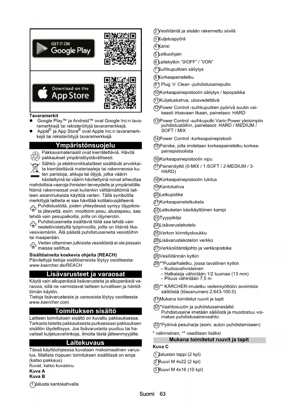 ovat Apple Inc:n tavaramerk- kejä tai rekisteröityjä tavaramerkkejä. Ympäristönsuojelu Pakkausmateriaalit ovat kierrätettäviä. Hävitä pakkaukset ympäristöystävällisesti. Sähkö- ja elektroniikkalaitteet sisältävät arvokkai- ta kierrätettäviä materiaaleja tai rakenneosia ku- ten paristoja, akkuja tai öljyjä, jotka väärin käsiteltyinä tai väärin hävitettyinä voivat aiheuttaa mahdollisia vaaroja ihmisten terveydelle ja ympäristölle. Nämä rakenneosat ovat kuitenkin välttämättömiä lait- teen asianmukaista käyttöä varten. Tällä symbolilla merkittyjä laitteita ei saa hävittää kotitalousjätteenä. Puhdistustöitä, joiden yhteydessä syntyy öljypitois- ta jätevettä, esim. moottorin pesu, alustapesu, saa tehdä vain pesupaikoilla, joilla on öljynerotin. Puhdistusaineita sisältäviä töitä saa tehdä vain nestetiivistetyillä työpinnoilla, joilla on liitäntä lika- vesiviemäriin. Älä päästä puhdistusaineita vesistöihin tai maaperään. Veden ottaminen julkisista vesistöistä ei ole joissain maissa sallittua. Sisältöaineita koskevia ohjeita (REACH) Päivitettyjä tietoja sisältöaineista löytyy osoitteesta: www.kaercher.de/REACH Lisävarusteet ja varaosat Käytä vain alkuperäisiä lisävarusteita ja alkuperäisiä va- raosia, sillä ne varmistavat laitteen turvallisen ja häiriöt- tömän käytön. Tietoja lisävarusteista ja varaosista löytyy osoitteesta www.kaercher.com. Toimituksen sisältö Laitteen toimituksen sisältö on kuvattu pakkauksessa. Tarkasta laitetta pakkauksesta purkaessasi pakkauksen sisällön täydellisyys. Jos lisävarusteita puuttuu tai ha- vaitset kuljetusvahinkoja, ilmoita tästä jälleenmyyjälle. Laitekuvaus Tässä käyttöohjeessa kuvataan maksimaalinen varus- tus. Mallista riippuen toimituksen sisällössä on eroja (katso pakkaus). Kuvat, katso kuvasivu Kuva A Kuva B 1 Jalusta kantokahvalla 2 Vesiliitäntä ja sisään rakennettu siivilä 3 Kuljetuspyörä 4 Kansi 5 Letkuohjain 6 Laitekytkin ”0/OFF” / ”I/ON” 7 Suihkuputkien säilytys 8 Korkeapaineletku 9 * Plug ’n’ Clean -puhdistusainepullo 10 Korkeapainepistoolin säilytys / lepopaikka 11 Kuljetuskahva, ulosvedettävä 12 Power Control -suihkuputken pyörivä suutin vai- keasti irtoavaan likaan, painetaso: HARD 13 Power Control -suihkuputki Vario Power yleisimpiin puhdistustöihin, painetasot: HARD / MEDIUM / SOFT / MIX 14 Power Control -korkeapainepistooli 15 Painike, jolla irrotetaan korkeapaineletku korkea- painepistoolista 16 Korkeapainepistoolin vipu 17 Painenäyttö (0-MIX / 1-SOFT / 2-MEDIUM / 3- HARD) 18 Korkeapainepistoolin lukitus 19 Kantokahva 20 Letkupidike 21 Korkeapaineletkukela 22 Letkukelan käsikäyttöinen kampi 23 Tyyppikilpi 24 Lisävarustekotelo 25 Verkon kiinnityskoukku 26 Lisävarustekotelon verkko 27 Verkkoliitäntäjohto ja verkkopistoke 28 Vesiliitännän kytkin 29 **Puutarhaletku, jossa tavallinen kytkin – Kudosvahvisteinen – Halkaisija vähintään 1/2 tuumaa (13 mm) – Pituus vähintään 7,5 m 30 ** KÄRCHER-imuletku vedensyöttöön avoimista säiliöistä (tilausnumero 2.643-100.0) 31 Mukana toimitetut ruuvit ja tapit 32 *Vaahtosuutin ja puhdistusainesäiliö Puhdistusaine imetään säiliöstä ja muodostuu voi- makas puhdistusainevaahto. 33 *Pyörivä pesuharja (esim. auton puhdistamiseen)