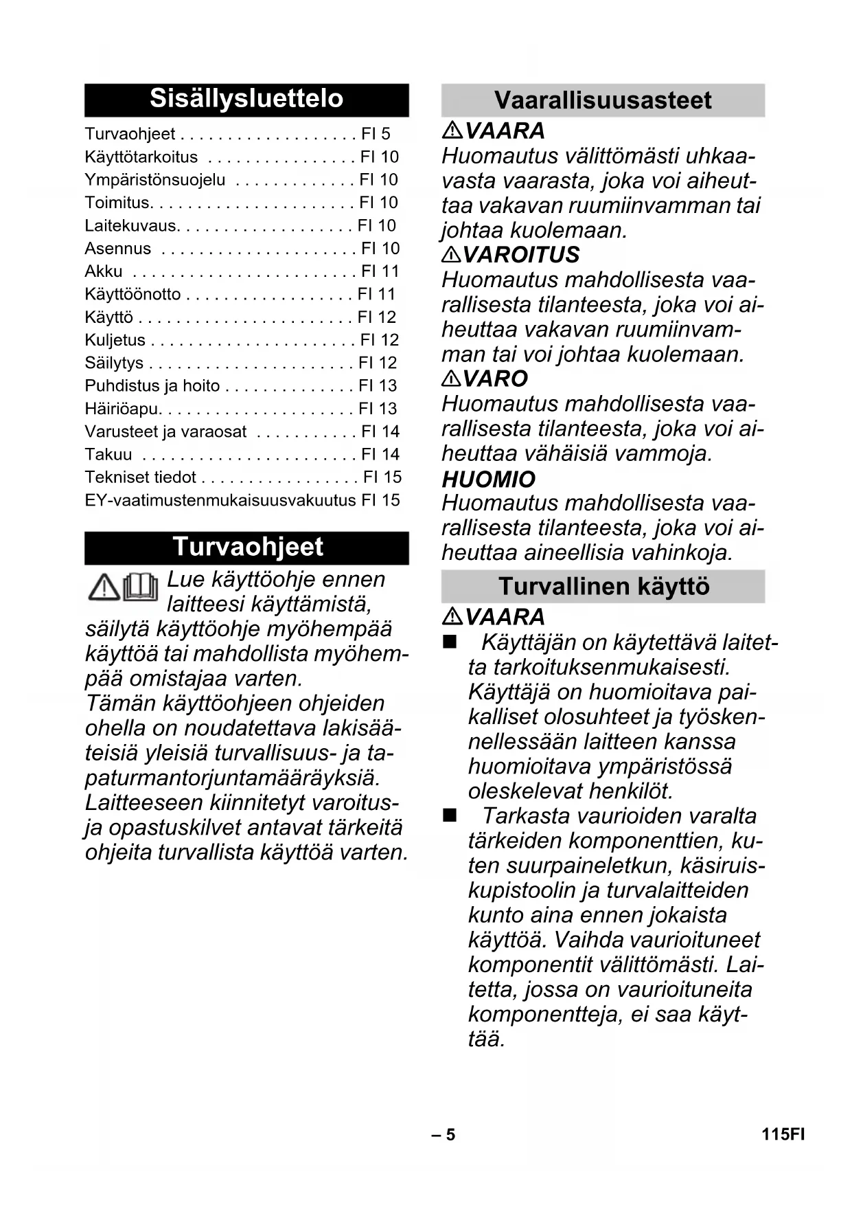 min min Vikt (utan batteri) 0,16 kg Tekniska ändringar förbehålls. EU-försäkran om överensstämmelse Produkt: Högtryckstvätt Typ: 1.117-200 1.117-2xx Tillämpliga EU-direktiv 2006/42/EG (+2009/127/EG) 2014/30/EU 2011/65/EU 2000/14/EG Tillämpade harmoniserade normer EN 60335–1 EN 60335–1 – EN 60335-2-29 EN 60335–2–79 EN 60335–2–79 EN 62233: 2008 EN 62233: 2008 EN 55014–1:2017 EN 55014–1:2017 EN 55014–2: 2015 EN 55014–2: 2015 – EN 61000–3–2: 2014 – EN 61000–3–3: 2013 EN 50581 EN 50581 Tillämpad metod för överensstämmelsevärdering 2000/14/EG: Bilaga V Ljudeffektsnivå dB(A) Upmätt: 85 Garanterad: 88 Chairman of the Board of Management Director Regulatory Affairs & Certification 114 SV– 5 Lue käyttöohje ennen laitteesi käyttämistä, säilytä käyttöohje myöhempää käyttöä tai mahdollista myöhem- pää omistajaa varten. Tämän käyttöohjeen ohjeiden ohella on noudatettava lakisää- teisiä yleisiä turvallisuus- ja ta- paturmantorjuntamääräyksiä. Laitteeseen kiinnitetyt varoitus- ja opastuskilvet antavat tärkeitä ohjeita turvallista käyttöä varten. VAARA Huomautus välittömästi uhkaa- vasta vaarasta, joka voi aiheut- taa vakavan ruumiinvamman tai johtaa kuolemaan. 몇 VAROITUS Huomautus mahdollisesta vaa- rallisesta tilanteesta, joka voi ai- heuttaa vakavan ruumiinvam- man tai voi johtaa kuolemaan. 몇 VARO Huomautus mahdollisesta vaa- rallisesta tilanteesta, joka voi ai- heuttaa vähäisiä vammoja. HUOMIO Huomautus mahdollisesta vaa- rallisesta tilanteesta, joka voi ai- heuttaa aineellisia vahinkoja. VAARA Käyttäjän on käytettävä laitet- ta tarkoituksenmukaisesti. Käyttäjä on huomioitava pai- kalliset olosuhteet ja työsken- nellessään laitteen kanssa huomioitava ympäristössä oleskelevat henkilöt. Tarkasta vaurioiden varalta tärkeiden komponenttien, ku- ten suurpaineletkun, käsiruis- kupistoolin ja turvalaitteiden kunto aina ennen jokaista käyttöä. Vaihda vaurioituneet komponentit välittömästi. Lai- tetta, jossa on vaurioituneita komponentteja, ei saa käyt- tää. Sisällysluettelo Turvaohjeet . . . . . . . . . . . . . . . . . . . FI 5 Käyttötarkoitus . . . . . . . . . . . . . . . . FI 10 Ympäristönsuojelu . . . . . . . . . . . . . FI 10 Toimitus. . . . . . . . . . . . . . . . . . . . . . FI 10 Laitekuvaus. . . . . . . . . . . . . . . . . . . FI 10 Asennus . . . . . . . . . . . . . . . . . . . . . FI 10 Akku . . . . . . . . . . . . . . . . . . . . . . . . FI 11 Käyttöönotto . . . . . . . . . . . . . . . . . . FI 11 Käyttö . . . . . . . . . . . . . . . . . . . . . . . FI 12 Kuljetus . . . . . . . . . . . . . . . . . . . . . . FI 12 Säilytys . . . . . . . . . . . . . . . . . . . . . . FI 12 Puhdistus ja hoito . . . . . . . . . . . . . . FI 13 Häiriöapu. . . . . . . . . . . . . . . . . . . . . FI 13 Varusteet ja varaosat . . . . . . . . . . . FI 14 Takuu . . . . . . . . . . . . . . . . . . . . . . . FI 14 Tekniset tiedot . . . . . . . . . . . . . . . . . FI 15 EY-vaatimustenmukaisuusvakuutus FI 15 Turvaohjeet Vaarallisuusasteet Turvallinen käyttö 115FI– 6 Epäasianmukaisesti käytet- tyinä suurpainesuihkut voivat olla vaarallisia. Suihkua ei saa suunnata ihmisiin, eläi- miin, jännitteellisiin sähköva- rusteisiin tai itse laitteeseen. Älä suuntaa korkeapaine- suihkua muihin ihmisiin tai it- seesi vaatteiden tai kenkien puhdistamiseksi. Korkeapaineinen vesisuihku voi vaurioittaa ajoneuvon ren- kaita/renkaiden venttiilejä, jol- loin ne saattavat puhjeta. En- simmäinen merkki siitä on renkaan värin muuttuminen. Vaurioituneet ajoneuvon ren- kaat/ renkaiden venttiilit ovat hengenvaarallisia. Pidä puh- distuksessa vähintään 30 cm ruiskutusetäisyys! 몇 VAROITUS Älä käytä laitetta, jos suihkun kantomatkan sisällä on muita henkilöitä, jollei heidän pääl- lään ole suojavarustusta. Lapset tai henkilöt, jotka eivät ole saaneet opastusta asi- aan, eivät saa käyttää laitetta. Laitetta eivät saa käyttää sel- laiset henkilöt, joilla on rajoit- tuneet fyysiset, aistimukselli- set tai henkiset kyvyt tai, joilta puuttuu laitteen käyttämiseen tarvittavaa kokemusta ja/tai tietoa, paitsi jos heidän turval- lisuudestaan vastaava henki- lö valvoo heitä tai on antanut heille laitteen käyttämiseen tarvittavat ohjeet. Lapset eivät saa leikkiä lait- teen kanssa. Lapsia on valvottava sen var- mistamiseksi, että he eivät leiki laitteella. 몇 VARO Varmista ennen laitteen jo- kaista käyttämistä tai siihen kohdistuvaa toimenpidettä, että laite seisoo kantavalla alustalla tukevasi paikallaan, jotta vältytään laitteen kaatu- misen aiheuttamilta onnetto- muuksilta tai vaurioilta. Korkeapainesuuttimesta ulostuleva vesisuihku saa ai- kaan käsiruiskupistooliin vai- kuttavan takaiskuvoiman. Ota tukeva asento, pidä käsiruis- kupistoolista ja suihkuputkes- ta hyvin kiinni. Älä koskaan jätä laitetta val- vomatta niin kauan, kun se on käytössä. HUOMIO Kytke laite pitempien työtau- kojen ajaksi laitekytkimellä pois päältä. Laitetta ei saa käyttää alle 0 °C lämpötiloissa. 116 FI– 7 VAARA Käyttö räjähdysalttiilla alueilla on kielletty. Älä ruiskuta esineitä, jotka si- sältävät terveydelle haitallisia aineita (esim. asbesti). Älä suihkuta mitään palavia nesteitä. Älä koskaan ime liuotinpitoi- sia nesteitä tai laimentamat- tomia happoja tai liuottimia! Niihin kuuluvat esim. bensiini, värinohennusaineet tai läm- mitysöljy. Ruiskutussumu on erittäin herkästi syttyvää, hel- posti räjähtävää ja myrkyllis- tä. Älä käytä asetonia, lai- mentamattomia happoja eikä liuottimia, koska ne syövyttä- vät laitteessa käytettyjä mate- riaaleja. Pidä pakkausfoliot lasten ulottumattomissa, tukehtu- misvaara! 몇 VAROITUS Voimassa olevien määräys- ten mukaan laitetta ei saa käyttää milloinkaan juomave- siverkossa ilman järjestelmä- erotintinta. Varmista, että ve- sijohtojärjestelmän se liitäntä, johon painepesu