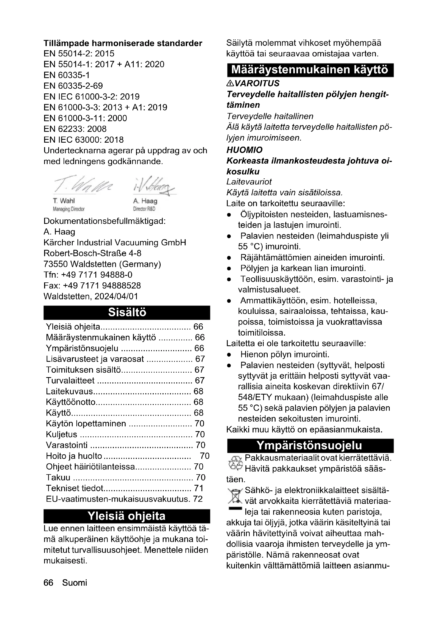 - EN 61000-3-3: 2013 + A1: 2019 EN 61000-3-11: 2000 EN 62233: 2008 EN IEC 63000: 2018 Undertecknarna agerar på uppdrag av och med ledningens godkännande. Dokumentationsbefullmäktigad: A. Haag Kärcher Industrial Vacuuming GmbH Robert-Bosch-Straße 4-8 73550 Waldstetten (Germany) Tfn: +49 7171 94888-0 Fax: +49 7171 94888528 Waldstetten, 2024/04/01 Sisältö Yleisiä ohjeita Lue ennen laitteen ensimmäistä käyttöä tä- mä alkuperäinen käyttöohje ja mukana toi- mitetut turvallisuusohjeet. Menettele niiden mukaisesti. Säilytä molemmat vihkoset myöhempää käyttöä tai seuraavaa omistajaa varten. Määräystenmukainen käyttö 몇 VAROITUS Terveydelle haitallisten pölyjen hengit- täminen Terveydelle haitallinen Älä käytä laitetta terveydelle haitallisten pö- lyjen imuroimiseen. HUOMIO Korkeasta ilmankosteudesta johtuva oi- kosulku Laitevauriot Käytä laitetta vain sisätiloissa. Laite on tarkoitettu seuraaville: ● Öljypitoisten nesteiden, lastuamisnes- teiden ja lastujen imurointi. ● Palavien nesteiden (leimahduspiste yli 55 °C) imurointi. ● Räjähtämättömien aineiden imurointi. ● Pölyjen ja karkean lian imurointi. ● Teollisuuskäyttöön, esim. varastointi- ja valmistusalueet. ● Ammattikäyttöön, esim. hotelleissa, kouluissa, sairaaloissa, tehtaissa, kau- poissa, toimistoissa ja vuokrattavissa toimitiloissa. Laitetta ei ole tarkoitettu seuraaville: ● Hienon pölyn imurointi. ● Palavien nesteiden (syttyvät, helposti syttyvät ja erittäin helposti syttyvät vaa- rallisia aineita koskevan direktiivin 67/ 548/ETY mukaan) (leimahduspiste alle 55 °C) sekä palavien pölyjen ja palavien nesteiden sekoitusten imurointi. Kaikki muu käyttö on epäasianmukaista. Ympäristönsuojelu Pakkausmateriaalit ovat kierrätettäviä. Hävitä pakkaukset ympäristöä sääs- täen. Sähkö- ja elektroniikkalaitteet sisältä- vät arvokkaita kierrätettäviä materiaa- leja tai rakenneosia kuten paristoja, akkuja tai öljyjä, jotka väärin käsiteltyinä tai väärin hävitettyinä voivat aiheuttaa mah- dollisia vaaroja ihmisten terveydelle ja ym- päristölle. Nämä rakenneosat ovat kuitenkin välttämättömiä laitteen asianmu- Yleisiä ohjeita p. 66