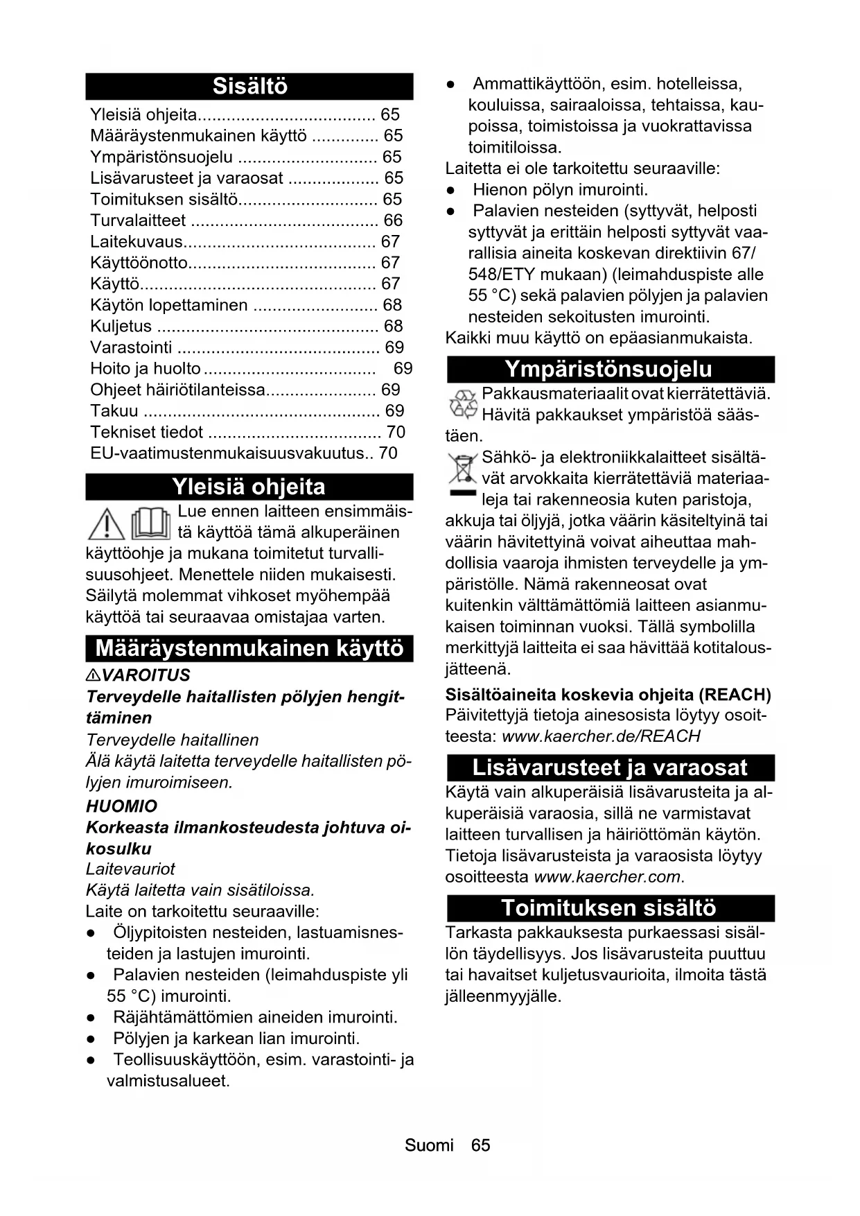 - IVR-L 65/12- 1 Tc IVR-L 65/20- 2 TcSuomi 65 Sisältö Yleisiä ohjeita Lue ennen laitteen ensimmäis- tä käyttöä tämä alkuperäinen käyttöohje ja mukana toimitetut turvalli- suusohjeet. Menettele niiden mukaisesti. Säilytä molemmat vihkoset myöhempää käyttöä tai seuraavaa omistajaa varten. Määräystenmukainen käyttö 몇 VAROITUS Terveydelle haitallisten pölyjen hengit- täminen Terveydelle haitallinen Älä käytä laitetta terveydelle haitallisten pö- lyjen imuroimiseen. HUOMIO Korkeasta ilmankosteudesta johtuva oi- kosulku Laitevauriot Käytä laitetta vain sisätiloissa. Laite on tarkoitettu seuraaville: ● Öljypitoisten nesteiden, lastuamisnes- teiden ja lastujen imurointi. ● Palavien nesteiden (leimahduspiste yli 55 °C) imurointi. ● Räjähtämättömien aineiden imurointi. ● Pölyjen ja karkean lian imurointi. ● Teollisuuskäyttöön, esim. varastointi- ja valmistusalueet. ● Ammattikäyttöön, esim. hotelleissa, kouluissa, sairaaloissa, tehtaissa, kau- poissa, toimistoissa ja vuokrattavissa toimitiloissa. Laitetta ei ole tarkoitettu seuraaville: ● Hienon pölyn imurointi. ● Palavien nesteiden (syttyvät, helposti syttyvät ja erittäin helposti syttyvät vaa- rallisia aineita koskevan direktiivin 67/ 548/ETY mukaan) (leimahduspiste alle 55 °C) sekä palavien pölyjen ja palavien nesteiden sekoitusten imurointi. Kaikki muu käyttö on epäasianmukaista. Ympäristönsuojelu Pakkausmateriaalit ovat kierrätettäviä. Hävitä pakkaukset ympäristöä sääs- täen. Sähkö- ja elektroniikkalaitteet sisältä- vät arvokkaita kierrätettäviä materiaa- leja tai rakenneosia kuten paristoja, akkuja tai öljyjä, jotka väärin käsiteltyinä tai väärin hävitettyinä voivat aiheuttaa mah- dollisia vaaroja ihmisten terveydelle ja ym- päristölle. Nämä rakenneosat ovat kuitenkin välttämättömiä laitteen asianmu- kaisen toiminnan vuoksi. Tällä symbolilla merkittyjä laitteita ei saa hävittää kotitalous- jätteenä. Sisältöaineita koskevia ohjeita (REACH) Päivitettyjä tietoja ainesosista löytyy osoit- teesta: www.kaercher.de/REACH Lisävarusteet ja varaosat Käytä vain alkuperäisiä lisävarusteita ja al- kuperäisiä varaosia, sillä ne varmistavat laitteen turvallisen ja häiriöttömän käytön. Tietoja lisävarusteista ja varaosista löytyy osoitteesta www.kaercher.com. Toimituksen sisältö Tarkasta pakkauksesta purkaessasi sisäl- lön täydellisyys. Jos lisävarusteita puuttuu tai havaitset kuljetusvaurioita, ilmoita tästä jälleenmyyjälle. Yleisiä ohjeita p. 65