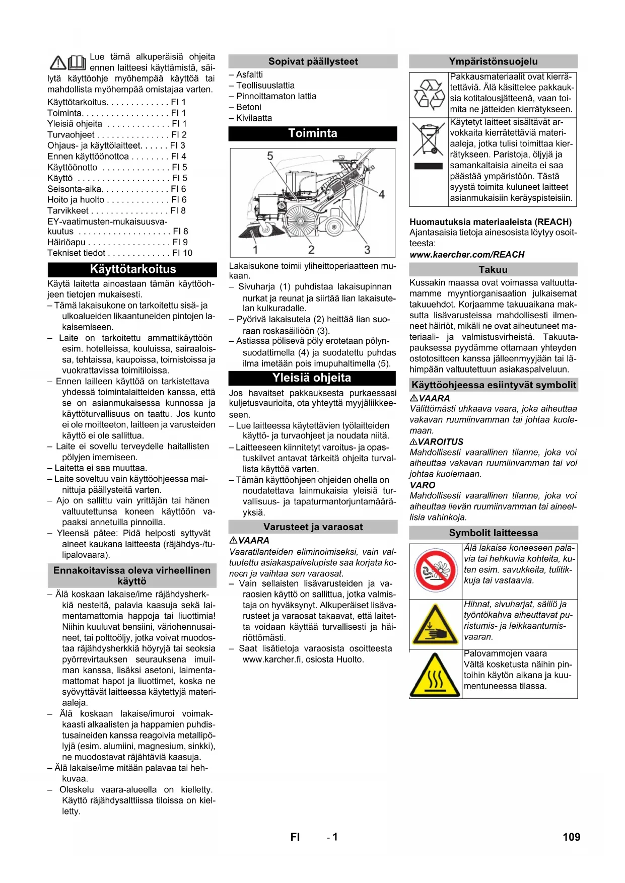 0,2 0,2 108 SV- 1 Lue tämä alkuperäisiä ohjeita ennen laitteesi käyttämistä, säi- lytä käyttöohje myöhempää käyttöä tai mahdollista myöhempää omistajaa varten. Käytä laitetta ainoastaan tämän käyttöoh- jeen tietojen mukaisesti. – Tämä lakaisukone on tarkoitettu sisä- ja ulkoalueiden likaantuneiden pintojen la- kaisemiseen. – Laite on tarkoitettu ammattikäyttöön esim. hotelleissa, kouluissa, sairaalois- sa, tehtaissa, kaupoissa, toimistoissa ja vuokrattavissa toimitiloissa. – Ennen lailleen käyttöä on tarkistettava yhdessä toimintalaitteiden kanssa, että se on asianmukaisessa kunnossa ja käyttöturvallisuus on taattu. Jos kunto ei ole moitteeton, laitteen ja varusteiden käyttö ei ole sallittua. – Laite ei sovellu terveydelle haitallisten pölyjen imemiseen. – Laitetta ei saa muuttaa. – Laite soveltuu vain käyttöohjeessa mai- nittuja päällysteitä varten. – Ajo on sallittu vain yrittäjän tai hänen valtuutettunsa koneen käyttöön va- paaksi annetuilla pinnoilla. – Yleensä pätee: Pidä helposti syttyvät aineet kaukana laitteesta (räjähdys-/tu- lipalovaara). – Älä koskaan lakaise/ime räjähdysherk- kiä nesteitä, palavia kaasuja sekä lai- mentamattomia happoja tai liuottimia! Niihin kuuluvat bensiini, väriohennusai- neet, tai polttoöljy, jotka voivat muodos- taa räjähdysherkkiä höyryjä tai seoksia pyörrevirtauksen seurauksena imuil- man kanssa, lisäksi asetoni, laimenta- mattomat hapot ja liuottimet, koska ne syövyttävät laitteessa käytettyjä materi- aaleja. – Älä koskaan lakaise/imuroi voimak- kaasti alkaalisten ja happamien puhdis- tusaineiden kanssa reagoivia metallipö- lyjä (esim. alumiini, magnesium, sinkki), ne muodostavat räjähtäviä kaasuja. – Älä lakaise/ime mitään palavaa tai heh- kuvaa. – Oleskelu vaara-alueella on kielletty. Käyttö räjähdysalttiissa tiloissa on kiel- letty. – Asfaltti – Teollisuuslattia – Pinnoittamaton lattia – Betoni – Kivilaatta Lakaisukone toimii yliheittoperiaatteen mu- kaan. – Sivuharja (1) puhdistaa lakaisupinnan nurkat ja reunat ja siirtää lian lakaisute- lan kulkuradalle. – Pyörivä lakaisutela (2) heittää lian suo- raan roskasäiliöön (3). – Astiassa pölisevä pöly erotetaan pölyn- suodattimella (4) ja suodatettu puhdas ilma imetään pois imupuhaltimella (5). Jos havaitset pakkauksesta purkaessasi kuljetusvaurioita, ota yhteyttä myyjäliikkee- seen. – Lue laitteessa käytettävien työlaitteiden käyttö- ja turvaohjeet ja noudata niitä. – Laitteeseen kiinnitetyt varoitus- ja opas- tuskilvet antavat tärkeitä ohjeita turval- lista käyttöä varten. – Tämän käyttöohjeen ohjeiden ohella on noudatettava lainmukaisia yleisiä tur- vallisuus- ja tapaturmantorjuntamäärä- yksiä. VAARA Vaaratilanteiden eliminoimiseksi, vain val- tuutettu asiakaspalvelupiste saa korjata ko- nee n ja vaihtaa sen varaosat. – Vain sellaisten lisävarusteiden ja va- raosien käyttö on sallittua, jotka valmis- taja on hyväksynyt. Alkuperäiset lisäva- rusteet ja varaosat takaavat, että laitet- ta voidaan käyttää turvallisesti ja häi- riöttömästi. – Saat lisätietoja varaosista osoitteesta www.karcher.fi, osiosta Huolto. Huomautuksia materiaaleista (REACH) Ajantasaisia tietoja ainesosista löytyy osoit- teesta: www.kaercher.com/REACH Kussakin maassa ovat voimassa valtuutta- mamme myyntiorganisaation julkaisemat takuuehdot. Korjaamme takuuaikana mak- sutta lisävarusteissa mahdollisesti ilmen- neet häiriöt, mikäli ne ovat aiheutuneet ma- teriaali- ja valmistusvirheistä. Takuuta- pauksessa pyydämme ottamaan yhteyden ostotositteen kanssa jälleenmyyjään tai lä- himpään valtuutettuun asiakaspalveluun. VAARA Välittömästi uhkaava vaara, joka aiheuttaa vakavan ruumiinvamman tai johtaa kuole- maan. 몇 VAROITUS Mahdollisesti vaarallinen tilanne, joka voi aiheuttaa vakavan ruumiinvamman tai voi johtaa kuolemaan. VARO Mahdollisesti vaarallinen tilanne, joka voi aiheuttaa lievän ruumiinvamman tai aineel- lisia vahinkoja. Käyttötarkoitus. . . . . . . . . . . . . FI 1 Toiminta. . . . . . . . . . . . . . . . . . FI 1 Yleisiä ohjeita . . . . . . . . . . . . . FI 1 Turvaohjeet . . . . . . . . . . . . . . . FI 2 Ohjaus- ja käyttölaitteet. . . . . . FI 3 Ennen käyttöönottoa . . . . . . . . FI 4 Käyttöönotto . . . . . . . . . . . . . . FI 5 Käyttö . . . . . . . . . . . . . . . . . . . FI 5 Seisonta-aika. . . . . . . . . . . . . . FI 6 Hoito ja huolto . . . . . . . . . . . . . FI 6 Tarvikkeet . . . . . . . . . . . . . . . . FI 8 EY-vaatimusten-mukaisuusva- kuutus . . . . . . . . . . . . . . . . . . . FI 8 Häiriöapu . . . . . . . . . . . . . . . . . FI 9 Tekniset tiedot . . . . . . . . . . . . . FI 10 Käyttötarkoitus Ennakoitavissa oleva virheellinen käyttö Sopivat päällysteet Toiminta Yleisiä ohjeita Varusteet ja varaosat Ympäristönsuojelu Pakkausmateriaalit ovat kierrä- tettäviä. Älä käsittelee pakkauk- sia kotitalousjätteenä, vaan toi- mita ne jätteiden kierrätykseen. Käytetyt laitteet sisältävät ar- vokkaita kierrätettäviä materi- aaleja, jotka tulisi toimittaa kier- rätykseen. Paristoja, öljyjä ja samankaltaisia aineita ei saa päästää ympäristöön. Tästä syystä toimita kuluneet laitteet asianmukaisiin keräyspisteisiin. Takuu Käyttöohjeessa esiintyvät symbolit Symbolit laitteessa Älä lakaise koneeseen pala- via tai hehkuvia kohteita, ku- ten esim. savukkeita, tulitik- kuja tai vastaavia. Hihnat, sivuharjat, säiliö ja työntökahva aiheuttavat pu- ristumis- ja leikkaantumis- vaaran. Palovammojen vaara Vältä kosketusta näihin pin- toihin käytön aikana ja kuu- mentuneessa tilassa. 109FI- 2 – Ennen lailleen käyttöä on tarkistettava yhdessä toimintalaitteiden kanssa, että se on asianmukaisessa kunnossa ja käyttöturvallisuus on taattu. Jos kunto ei ole moitteeton, laitteen ja varusteiden käyttö ei ole sallittua. – Käytettäessä laitetta vaara-alu