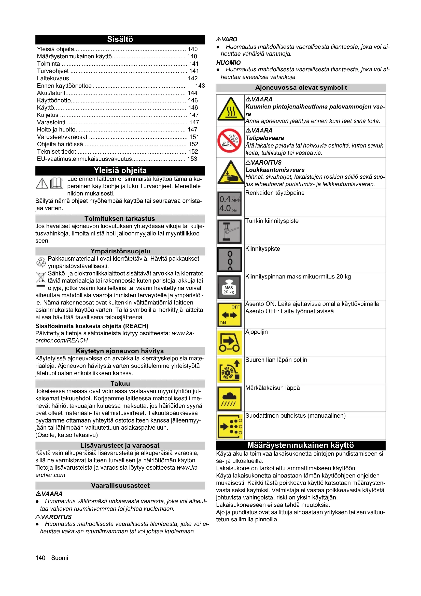 - dB(A)333 KM 85/50 R Bp 1.351-126.0 KM 85/50 R Bp Pack 1.351-127.0 KM 85/50 R Bp Pack 2SB 1.351-128.0 Radiomodul Frekvens MHz Utsändningsef- fekt Watt GSM 824,2-848,8 1510 1850,2-1909,8 870 WLAN 2400-2483 96 Chairman of the Board of Management Director Regulatory Affairs & Certification H. Jenner S. Reiser140 Suomi Sisältö Yleisiä ohjeita Lue ennen laitteen ensimmäistä käyttöä tämä alku- peräinen käyttöohje ja luku Turvaohjeet. Menettele niiden mukaisesti. Säilytä nämä ohjeet myöhempää käyttöä tai seuraavaa omista- jaa varten. Toimituksen tarkastus Jos havaitset ajoneuvon luovutuksen yhteydessä vikoja tai kulje- tusvahinkoja, ilmoita niistä heti jälleenmyyjälle tai myyntiliikkee- seen. Ympäristönsuojelu Pakkausmateriaalit ovat kierrätettäviä. Hävitä pakkaukset ympäristöystävällisesti. Sähkö- ja elektroniikkalaitteet sisältävät arvokkaita kierrätet- täviä materiaaleja tai rakenneosia kuten paristoja, akkuja tai öljyjä, jotka väärin käsiteltyinä tai väärin hävitettyinä voivat aiheuttaa mahdollisia vaaroja ihmisten terveydelle ja ympäristöl- le. Nämä rakenneosat ovat kuitenkin välttämättömiä laitteen asianmukaista käyttöä varten. Tällä symbolilla merkittyjä laitteita ei saa hävittää tavallisena talousjätteenä. Sisältöaineita koskevia ohjeita (REACH) Päivitettyjä tietoja sisältöaineista löytyy osoitteesta: www.ka- ercher.com/REACH Käytetyn ajoneuvon hävitys Käytetyissä ajoneuvoissa on arvokkaita kierrätyskelpoisia mate- riaaleja. Ajoneuvon hävitystä varten suosittelemme yhteistyötä jätehuoltoalan erikoisliikkeen kanssa. Takuu Jokaisessa maassa ovat voimassa vastaavan myyntiyhtiön jul- kaisemat takuuehdot. Korjaamme laitteessa mahdollisesti ilme- nevät häiriöt takuuajan kuluessa maksutta, jos häiriöiden syynä ovat olleet materiaali- tai valmistusvirheet. Takuutapauksessa pyydämme ottamaan yhteyttä ostotositteen kanssa jälleenmyy- jään tai lähimpään valtuutettuun asiakaspalveluun. (Osoite, katso takasivu) Lisävarusteet ja varaosat Käytä vain alkuperäisiä lisävarusteita ja alkuperäisiä varaosia, sillä ne varmistavat laitteen turvallisen ja häiriöttömän käytön. Tietoja lisävarusteista ja varaosista löytyy osoitteesta www.ka- ercher.com. Vaarallisuusasteet VAARA ● Huomautus välittömästi uhkaavasta vaarasta, joka voi aiheut- taa vakavan ruumiinvamman tai johtaa kuolemaan. 몇 VAROITUS ● Huomautus mahdollisesta vaarallisesta tilanteesta, joka voi ai- heuttaa vakavan ruumiinvamman tai voi johtaa kuolemaan. 몇 VARO ● Huomautus mahdollisesta vaarallisesta tilanteesta, joka voi ai- heuttaa vähäisiä vammoja. HUOMIO ● Huomautus mahdollisesta vaarallisesta tilanteesta, joka voi ai- heuttaa aineellisia vahinkoja. Ajoneuvossa olevat symbolit Määräystenmukainen käyttö Käytä akulla toimivaa lakaisukonetta pintojen puhdistamiseen si- sä- ja ulkoalueilla. Lakaisukone on tarkoitettu ammattimaiseen käyttöön. Käytä lakaisukonetta ainoastaan tämän käyttöohjeen ohjeiden mukaisesti. Kaikki tästä poikkeava käyttö katsotaan määräysten- vastaiseksi käytöksi. Valmistaja ei vastaa poikkeavasta käytöstä johtuvista vahingoista, riski on yksin käyttäjän. Lakaisukoneeseen ei saa tehdä muutoksia. Ajo ja puhdistus ovat sallittuja ainoastaan yrityksen tai sen valtuu- tetun sallimilla pinnoilla. Yleisiä ohjeita p. 140