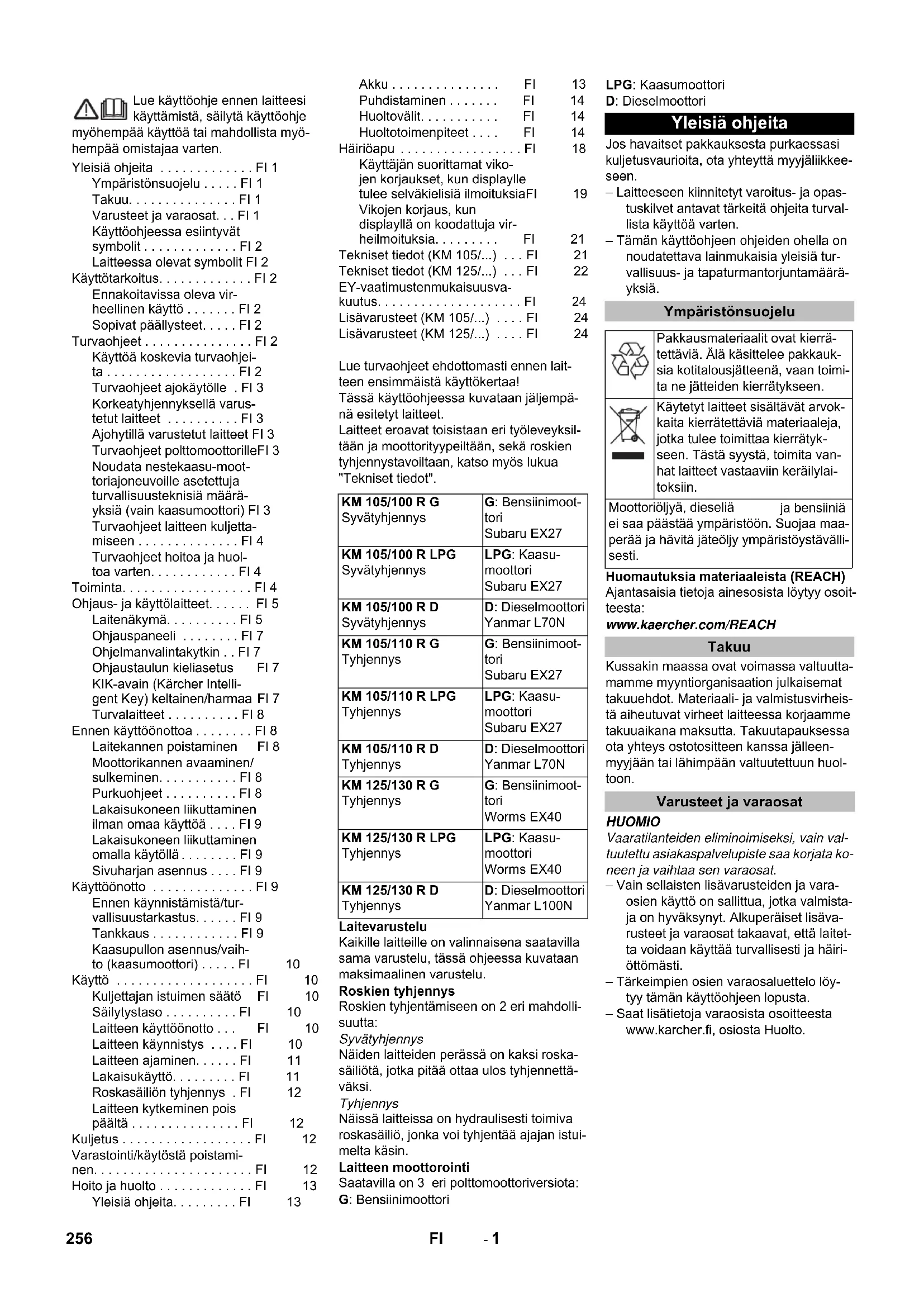 nt Key) keltainen/harmaa FI 7 Turvalaitteet . . . . . . . . . . FI 8 Ennen käyttöönottoa . . . . . . . . FI 8 Laitekannen poistaminen FI 8 Moottorikannen avaaminen/ sulkeminen. . . . . . . . . . . FI 8 Purkuohjeet . . . . . . . . . . FI 8 Lakaisukoneen liikuttaminen ilman omaa käyttöä . . . . FI 9 Lakaisukoneen liikuttaminen omalla käytöllä . . . . . . . . FI 9 Sivuharjan asennus . . . . FI 9 Käyttöönotto . . . . . . . . . . . . . . FI 9 Ennen käynnistämistä/tur- vallisuustarkastus. . . . . . FI 9 Tankkaus . . . . . . . . . . . . FI 9 Kaasupullon asennus/vaih- to (kaasumoottori) . . . . . FI 10 Käyttö . . . . . . . . . . . . . . . . . . . FI 10 Kuljettajan istuimen säätö FI 10 Säilytystaso . . . . . . . . . . FI 10 Laitteen käyttöönotto . . . FI 10 Laitteen käynnistys . . . . FI 10 Laitteen ajaminen. . . . . . FI 11 Lakaisukäyttö. . . . . . . . . FI 11 Roskasäiliön tyhjennys . FI 12 Laitteen kytkeminen pois päältä . . . . . . . . . . . . . . . FI 12 Kuljetus . . . . . . . . . . . . . . . . . . FI 12 Varastointi/käytöstä poistami- nen. . . . . . . . . . . . . . . . . . . . . . FI 12 Hoito ja huolto . . . . . . . . . . . . . FI 13 Yleisiä ohjeita. . . . . . . . . FI 13 Akku . . . . . . . . . . . . . . . FI 13 Puhdistaminen . . . . . . . FI 14 Huoltovälit. . . . . . . . . . . FI 14 Huoltotoimenpiteet . . . . FI 14 Häiriöapu . . . . . . . . . . . . . . . . . FI 18 Käyttäjän suorittamat viko- jen korjaukset, kun displaylle tulee selväkielisiä ilmoituksiaFI 19 Vikojen korjaus, kun displayllä on koodattuja vir- heilmoituksia. . . . . . . . . FI 21 Tekniset tiedot (KM 105/...) . . . FI 21 Tekniset tiedot (KM 125/...) . . . FI 22 EY-vaatimustenmukaisuusva- kuutus. . . . . . . . . . . . . . . . . . . . FI 24 Lisävarusteet (KM 105/...) . . . . FI 24 Lisävarusteet (KM 125/...) . . . . FI 24 KM 105/100 R G Syvätyhjennys G: Bensiinimoot- tori Subaru EX27