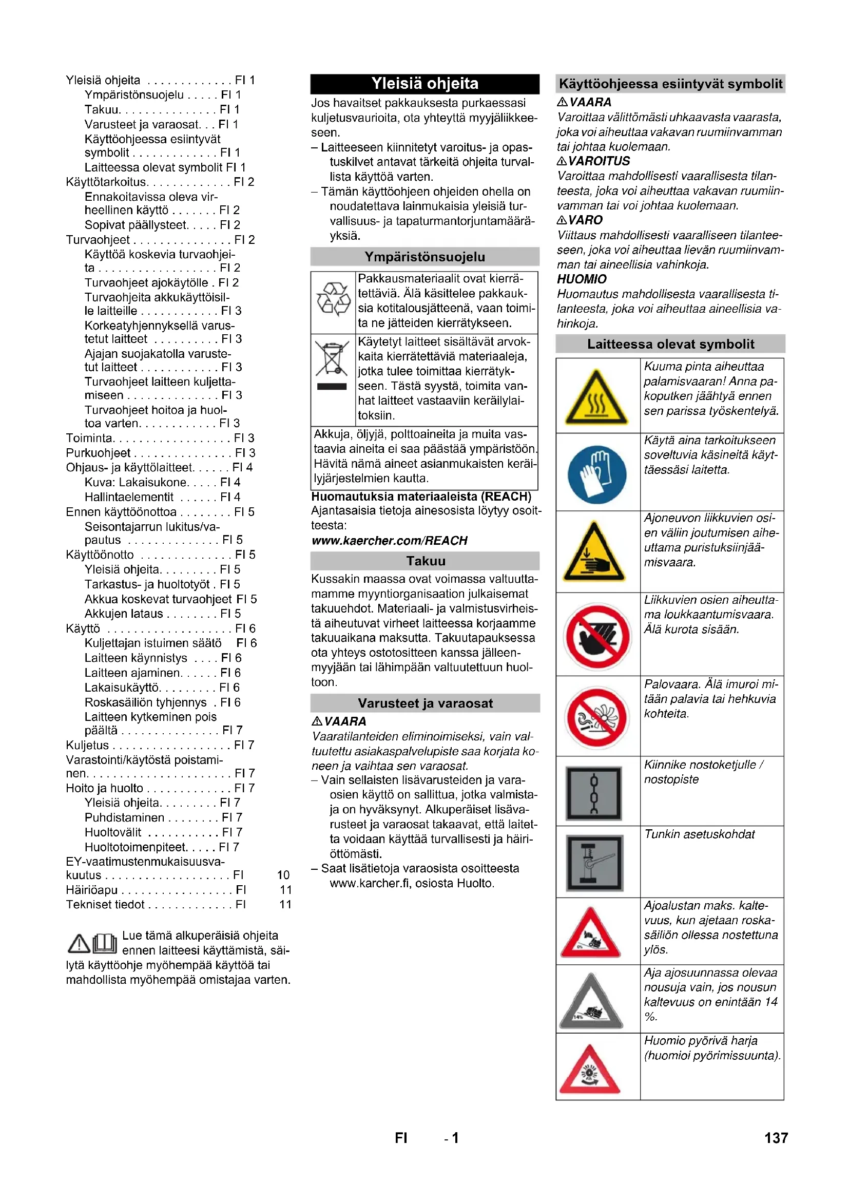 0,1 0,1 Mått och vikt Längd x Bredd x Höjd mm 1847 x 1065 x 1388 1847 x 1065 x 1388 Vändningsradie höger mm 2470 2470 Vändningsradie vänster mm 2470 2470 Vikt (med/utan batteri) kg 560/860 560/860 Tillåten totalvikt kg 1224 1224 Tillåten axelbelastning fram kg 734 734 Tillåten axelbelastning bak kg 490 490 Med reservation för tekniska ändringar! 136 SV- 1 Lue tämä alkuperäisiä ohjeita ennen laitteesi käyttämistä, säi- lytä käyttöohje myöhempää käyttöä tai mahdollista myöhempää omistajaa varten. Jos havaitset pakkauksesta purkaessasi kuljetusvaurioita, ota yhteyttä myyjäliikkee- seen. – Laitteeseen kiinnitetyt varoitus- ja opas- tuskilvet antavat tärkeitä ohjeita turval- lista käyttöä varten. – Tämän käyttöohjeen ohjeiden ohella on noudatettava lainmukaisia yleisiä tur- vallisuus- ja tapaturmantorjuntamäärä- yksiä. Huomautuksia materiaaleista (REACH) Ajantasaisia tietoja ainesosista löytyy osoit- teesta: www.kaercher.com/REACH Kussakin maassa ovat voimassa valtuutta- mamme myyntiorganisaation julkaisemat takuuehdot. Materiaali- ja valmistusvirheis- tä aiheutuvat virheet laitteessa korjaamme takuuaikana maksutta. Takuutapauksessa ota yhteys ostotositteen kanssa jälleen- myyjään tai lähimpään valtuutettuun huol- toon. VAARA Vaaratilanteiden eliminoimiseksi, vain val- tuutettu asiakaspalvelupiste saa korjata ko- neen ja vaihtaa sen varaosat. – Vain sellaisten lisävarusteiden ja vara- osien käyttö on sallittua, jotka valmista- ja on hyväksynyt. Alkuperäiset lisäva- rusteet ja varaosat takaavat, että laitet- ta voidaan käyttää turvallisesti ja häiri- öttömästi. – Saat lisätietoja varaosista osoitteesta www.karcher.fi, osiosta Huolto. VAARA Varoittaa välittömästi uhkaavasta vaarasta, joka voi aiheuttaa vakavan ruumiinvamman tai johtaa kuolemaan. 몇 VAROITUS Varoittaa mahdollisesti vaarallisesta tilan- teesta, joka voi aiheuttaa vakavan ruumiin- vamman tai voi johtaa kuolemaan. 몇 VARO Viittaus mahdollisesti vaaralliseen tilantee- seen, joka voi aiheuttaa lievän ruumiinvam- man tai aineellisia vahinkoja. HUOMIO Huomautus mahdollisesta vaarallisesta ti- lanteesta, joka voi aiheuttaa aineellisia va- hinkoja. Yleisiä ohjeita . . . . . . . . . . . . . FI 1 Ympäristönsuojelu . . . . . FI 1 Takuu. . . . . . . . . . . . . . . FI 1 Varusteet ja varaosat. . . FI 1 Käyttöohjeessa esiintyvät symbolit . . . . . . . . . . . . . FI 1 Laitteessa olevat symbolit FI 1 Käyttötarkoitus. . . . . . . . . . . . . FI 2 Ennakoitavissa oleva vir- heellinen käyttö . . . . . . . FI 2 Sopivat päällysteet. . . . . FI 2 Turvaohjeet . . . . . . . . . . . . . . . FI 2 Käyttöä koskevia turvaohjei- ta . . . . . . . . . . . . . . . . . . FI 2 Turvaohjeet ajokäytölle . FI 2 Turvaohjeita akkukäyttöisil- le laitteille . . . . . . . . . . . . FI 3 Korkeatyhjennyksellä varus- tetut laitteet . . . . . . . . . . FI 3 Ajajan suojakatolla varuste- tut laitteet . . . . . . . . . . . . FI 3 Turvaohjeet laitteen kuljetta- miseen . . . . . . . . . . . . . . FI 3 Turvaohjeet hoitoa ja huol- toa varten. . . . . . . . . . . . FI 3 Toiminta. . . . . . . . . . . . . . . . . . FI 3 Purkuohjeet . . . . . . . . . . . . . . . FI 3 Ohjaus- ja käyttölaitteet. . . . . . FI 4 Kuva: Lakaisukone. . . . . FI 4 Hallintaelementit . . . . . . FI 4 Ennen käyttöönottoa . . . . . . . . FI 5 Seisontajarrun lukitus/va- pautus . . . . . . . . . . . . . . FI 5 Käyttöönotto . . . . . . . . . . . . . . FI 5 Yleisiä ohjeita. . . . . . . . . FI 5 Tarkastus- ja huoltotyöt . FI 5 Akkua koskevat turvaohjeet FI 5 Akkujen lataus . . . . . . . . FI 5 Käyttö . . . . . . . . . . . . . . . . . . . FI 6 Kuljettajan istuimen säätö FI 6 Laitteen käynnistys . . . . FI 6 Laitt een ajaminen. . . . . . FI 6 Lakaisukäyttö. . . . . . . . . FI 6 Roskasäiliön tyhjennys . FI 6 Laitteen kytkeminen pois päältä . . . . . . . . . . . . . . . FI 7 Kuljetus . . . . . . . . . . . . . . . . . . FI 7 Varastointi/käytöstä poistami- nen. . . . . . . . . . . . . . . . . . . . . . FI 7 Hoito ja huolto . . . . . . . . . . . . . FI 7 Yleisiä ohjeita. . . . . . . . . FI 7 Puhdistaminen . . . . . . . . FI 7 Huoltovälit . . . . . . . . . . . FI 7 Huoltotoimenpiteet. . . . . FI 7 EY-vaatimustenmukaisuusva- kuutus . . . . . . . . . . . . . . . . . . . FI 10 Häiriöapu . . . . . . . . . . . . . . . . . FI 11 Tekniset tiedot . . . . . . . . . . . . . FI 11 Yleisiä ohjeita Ympäristönsuojelu Pakkausmateriaalit ovat kierrä- tettäviä. Älä käsittelee pakkauk- sia kotitalousjätteenä, vaan toimi- ta ne jätteiden kierrätykseen. Käytetyt laitteet sisältävät arvok- kaita kierrätettäviä materiaaleja, jotka tulee toimittaa kierrätyk- seen. Tästä syystä, toimita van- hat laitteet vastaaviin keräilylai- toksiin. Akkuja, öljyjä, polttoaineita ja muita vas- taavia aineita ei saa päästää ympäristöön. Hävitä nämä aineet asianmukaisten keräi- lyjärjestelmien kautta. Takuu Varusteet ja varaosat Käyttöohjeessa esiintyvät symbolit Laitteessa olevat symbolit Kuuma pinta aiheuttaa palamisvaaran! Anna pa- koputken jäähtyä ennen sen parissa työskentelyä. Käytä aina tarkoitukseen soveltuvia käsineitä käyt- täessäsi laitetta. Ajoneuvon liikkuvien osi- en väliin joutumisen aihe- uttama puristuksiinjää- misvaara. Liikkuvien osien aiheutta- ma loukkaantumisvaara. Älä kurota sisään. Palovaara. Älä imuroi mi- tään palavia tai hehkuvia kohteita. Kiinnike nostoketjulle / nostopiste Tunkin asetuskohdat Ajoalustan maks. kalte- vuus, kun ajetaan roska- säiliön ollessa nostettuna ylös. Aja ajosuunnassa olevaa nousuja vain, jos nousun kaltevuus on enintään 14