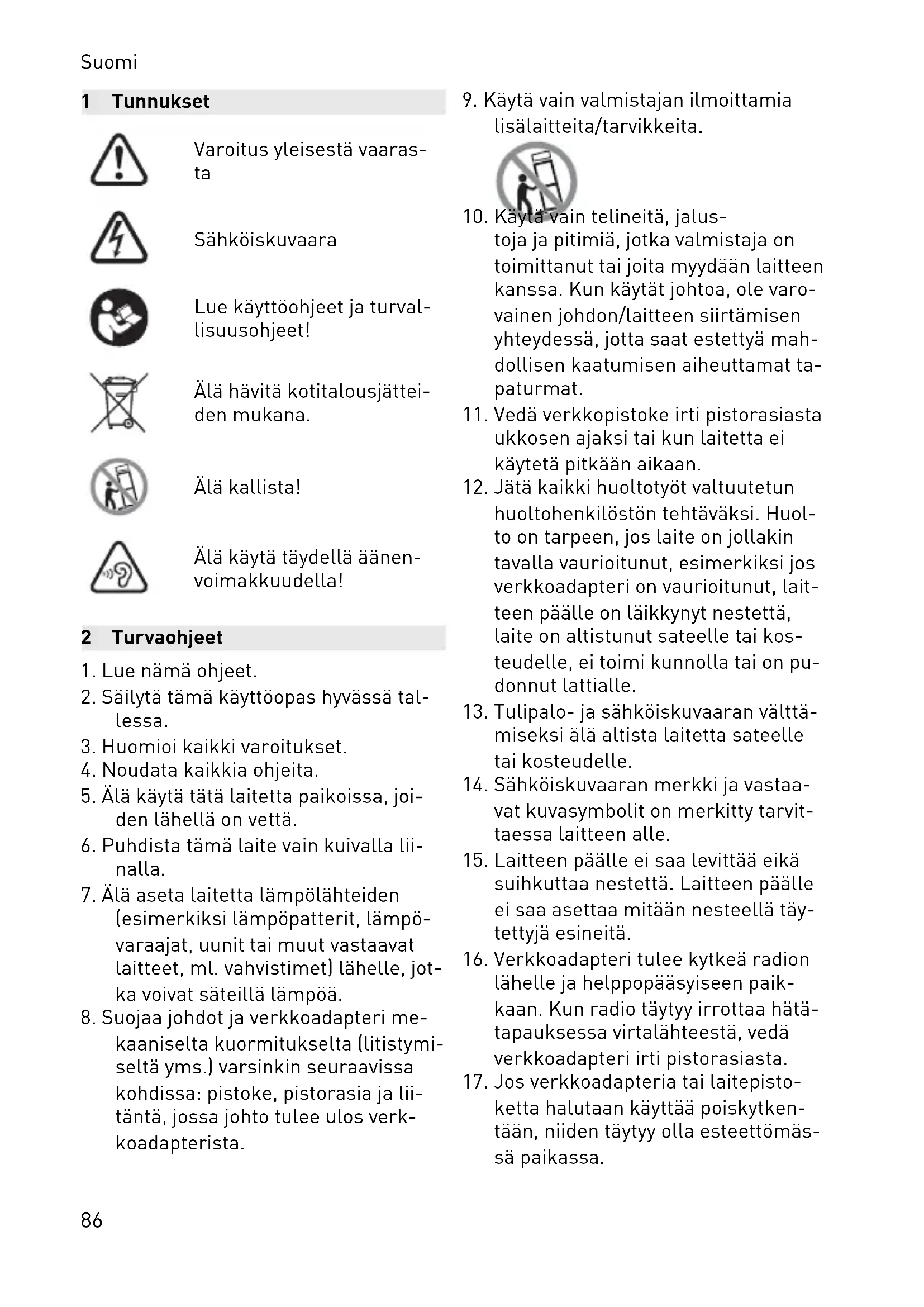 Sähköiskuvaara Lue käyttöohjeet ja turval lisuusohjeet! Älä hävitä kotitalousjättei den mukana. Älä kallista! Älä käytä täydellä äänen voimakkuudella! 2 Turvaohjeet