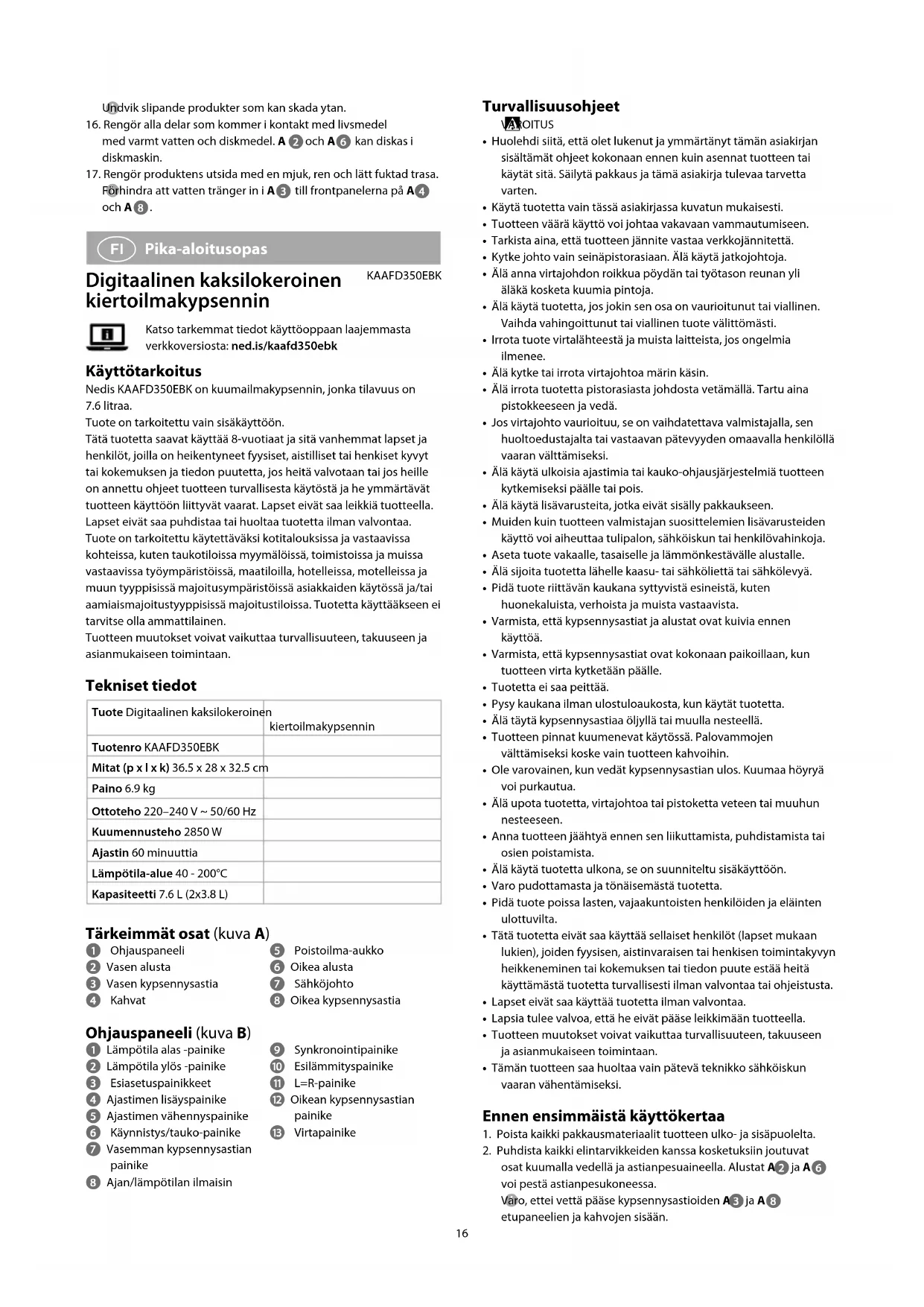 Pika-aloitusopas Digitaalinen kaksilokeroinen kiertoilmakypsennin KAAFD350EBKKatso tarkemmat tiedot käyttöoppaan laajemmasta verkkoversiosta: ned.is/kaafd350ebk Käyttötarkoitus Nedis KAAFD350EBK on kuumailmakypsennin, jonka tilavuus on 7.6 litraa.Tuote on tarkoitettu vain sisäkäyttöön.Tätä tuotetta saavat käyttää 8-vuotiaat ja sitä vanhemmat lapset ja henkilöt, joilla on heikentyneet fyysiset, aistilliset tai henkiset kyvyt tai kokemuksen ja tiedon puutetta, jos heitä valvotaan tai jos heille on annettu ohjeet tuotteen turvallisesta käytöstä ja he ymmärtävät tuotteen käyttöön liittyvät vaarat. Lapset eivät saa leikkiä tuotteella. Lapset eivät saa puhdistaa tai huoltaa tuotetta ilman valvontaa.Tuote on tarkoitettu käytettäväksi kotitalouksissa ja vastaavissa kohteissa, kuten taukotiloissa myymälöissä, toimistoissa ja muissa vastaavissa työympäristöissä, maatiloilla, hotelleissa, motelleissa ja muun tyyppisissä majoitusympäristöissä asiakkaiden käytössä ja/tai aamiaismajoitustyyppisissä majoitustiloissa. Tuotetta käyttääkseen ei tarvitse olla ammattilainen.Tuotteen muutokset voivat vaikuttaa turvallisuuteen, takuuseen ja asianmukaiseen toimintaan. Tekniset tiedot Tuote Digitaalinen kaksilokeroinen kiertoilmakypsenninTuotenro KAAFD350EBKMitat (p x l x k) 36.5 x 28 x 32.5 cmPaino 6.9 kgOttoteho 220–240 V ~ 50/60 HzKuumennusteho 2850 WAjastin 60 minuuttiaLämpötila-alue 40 - 200°CKapasiteetti 7.6 L (2x3.8 L) Tärkeimmät osat (kuva A) 1 Ohjauspaneeli2 Vasen alusta3 Vasen kypsennysastia4 Kahvat5 Poistoilma-aukko6 Oikea alusta7 Sähköjohto8 Oikea kypsennysastia Ohjauspaneeli (kuva B) 1 Lämpötila alas -painike2 Lämpötila ylös -painike3 Esiasetuspainikkeet4 Ajastimen lisäyspainike5 Ajastimen vähennyspainike6 Käynnistys/tauko-painike7 Vasemman kypsennysastian painike8 Ajan/lämpötilan ilmaisin9 Synkronointipainikeq Esilämmityspainikew L=R-painikee Oikean kypsennysastian painiker Virtapainike17