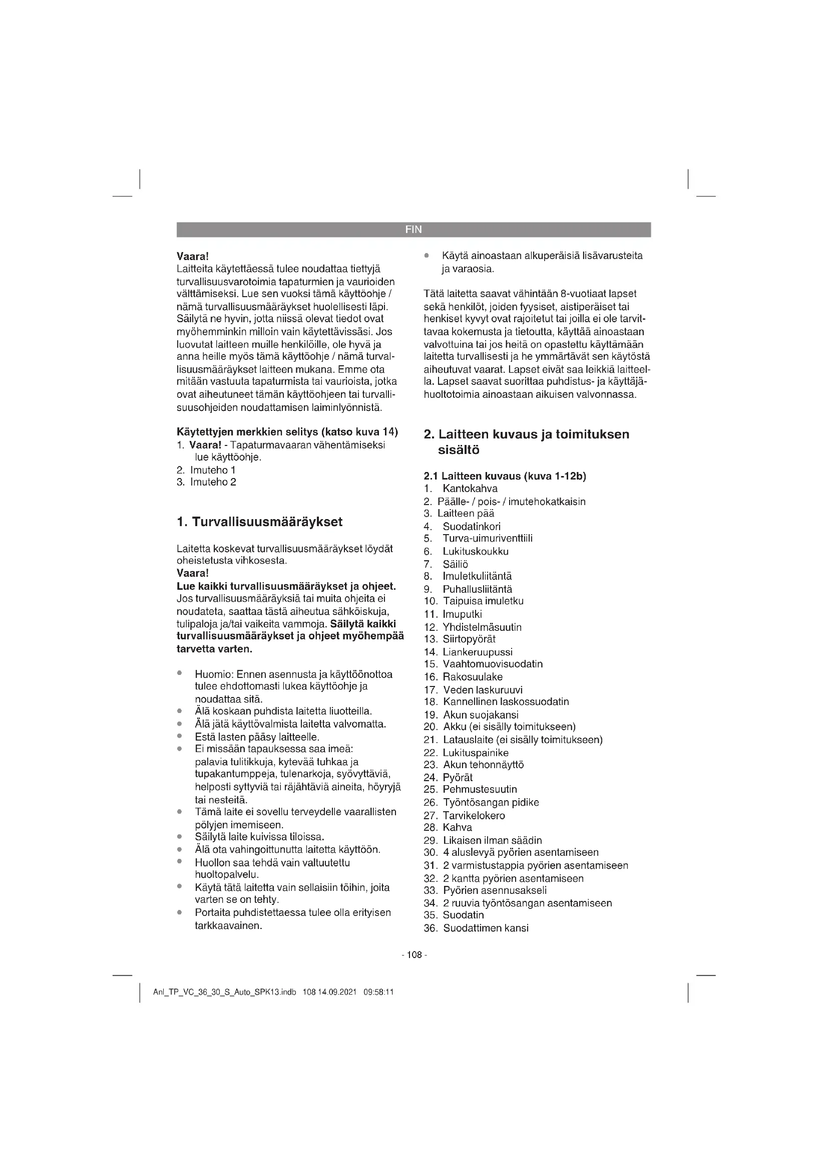 sekä akkusarjan tekniseen asiakaspalveluumme. Pyydämme ottamaan yhteyttä asiakaspalve- luumme tai myyntipisteeseen, josta laite on ostettu, saadaksesi ohjeet asianmukaista lähettämistä varten. Huolehdi akkujen tai akkukäyttöisen laitteen lähettämisessä ja hävittämisessä siitä, että ne on pakattu erikseen muovipusseihin, jotta vältetään oikosulut ja tulipalo! Anl_TP_VC_36_30_S_Auto_SPK13.indb 110 14.09.2021 09:58:12FIN