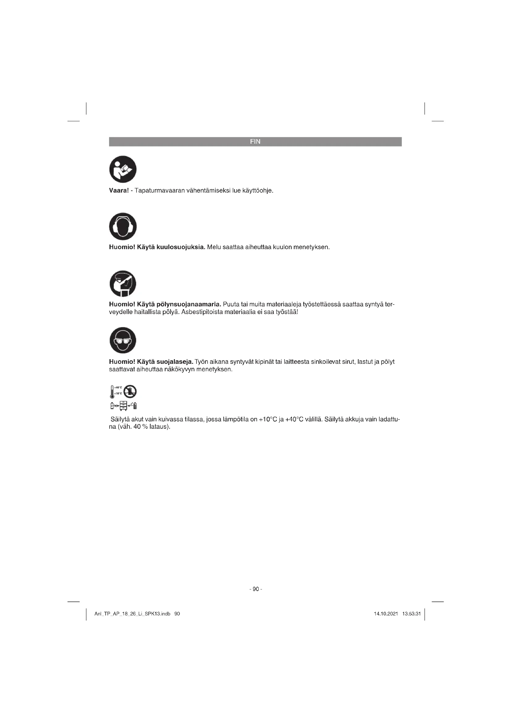 Vaara! - Tapaturmavaaran vähentämiseksi lue käyttöohje. Huomio! Käytä kuulosuojuksia. Melu saattaa aiheuttaa kuulon menetyksen. Huomio! Käytä suojalaseja. Työn aikana syntyvät kipinät tai laitteesta sinkoilevat sirut, lastut ja pölyt saattavat aiheuttaa näkökyvyn menetyksen. Huomio! Käytä pölynsuojanaamaria. Puuta tai muita materiaaleja työstettäessä saattaa syntyä ter- veydelle haitallista pölyä. Asbestipitoista materiaalia ei saa työstää! Säilytä akut vain kuivassa tilassa, jossa lämpötila on +10°C ja +40°C välillä. Säilytä akkuja vain ladattu- na (väh. 40 % lataus). Anl_TP_AP_18_26_Li_SPK13.indb 90Anl_TP_AP_18_26_Li_SPK13.indb 90 14.10.2021 13:53:3114.10.2021 13:53:31FIN