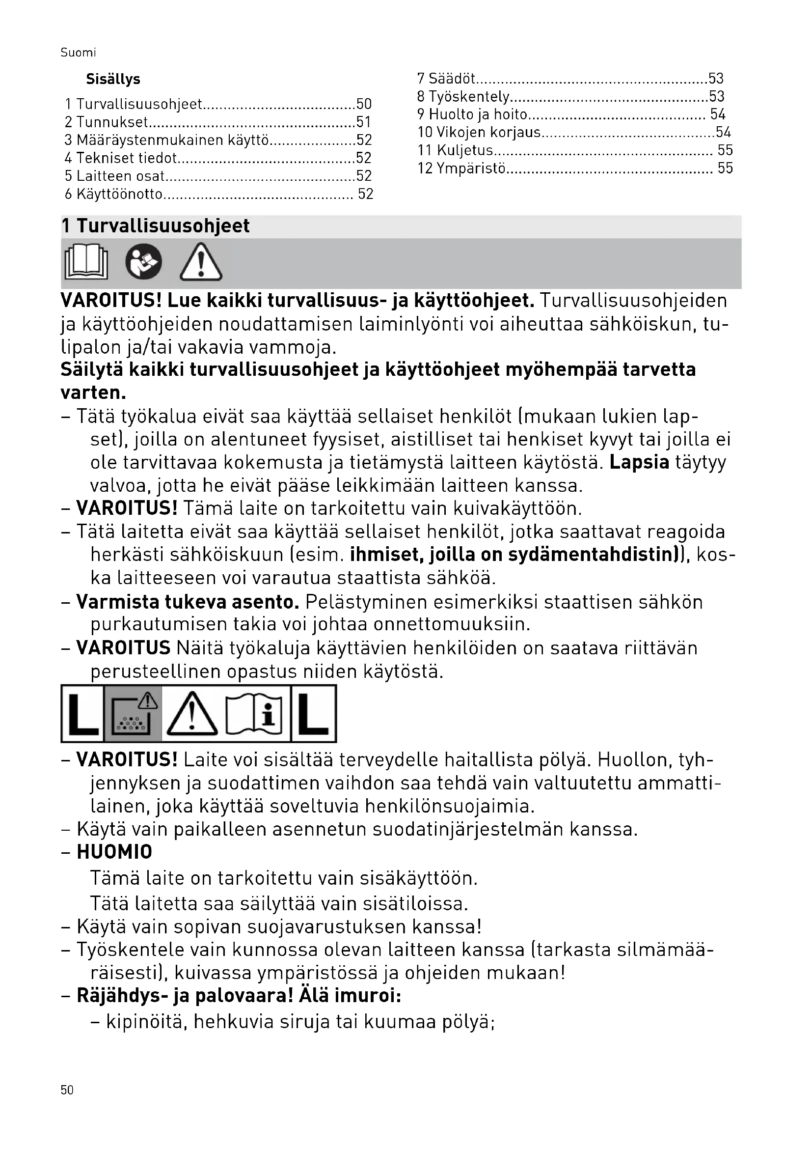 - 12 Ympäristö 1 Turvallisuusohjeet VAROITUS! Lue kaikki turvallisuus- ja käyttöohjeet. Turvallisuusohjeiden ja käyttöohjeiden noudattamisen laiminlyönti voi aiheuttaa sähköiskun, tu lipalon ja/tai vakavia vammoja. Säilytä kaikki turvallisuusohjeet ja käyttöohjeet myöhempää tarvetta varten. – Tätä työkalua eivät saa käyttää sellaiset henkilöt (mukaan lukien lap set), joilla on alentuneet fyysiset, aistilliset tai henkiset kyvyt tai joilla ei ole tarvittavaa kokemusta ja tietämystä laitteen käytöstä. Lapsia täytyy valvoa, jotta he eivät pääse leikkimään laitteen kanssa. – VAROITUS! Tämä laite on tarkoitettu vain kuivakäyttöön. – Tätä laitetta eivät saa käyttää sellaiset henkilöt, jotka saattavat reagoida herkästi sähköiskuun (esim. ihmiset, joilla on sydämentahdistin)), kos ka laitteeseen voi varautua staattista sähköä. – Varmista tukeva asento. Pelästyminen esimerkiksi staattisen sähkön purkautumisen takia voi johtaa onnettomuuksiin. – VAROITUS Näitä työkaluja käyttävien henkilöiden on saatava riittävän perusteellinen opastus niiden käytöstä. – VAROITUS! Laite voi sisältää terveydelle haitallista pölyä. Huollon, tyh jennyksen ja suodattimen vaihdon saa tehdä vain valtuutettu ammatti lainen, joka käyttää soveltuvia henkilönsuojaimia. – Käytä vain paikalleen asennetun suodatinjärjestelmän kanssa. – HUOMIO Tämä laite on tarkoitettu vain sisäkäyttöön. Tätä laitetta saa säilyttää vain sisätiloissa. – Käytä vain sopivan suojavarustuksen kanssa! – Työskentele vain kunnossa olevan laitteen kanssa (tarkasta silmämää räisesti), kuivassa ympäristössä ja ohjeiden mukaan! – Räjähdys- ja palovaara! Älä imuroi: – kipinöitä, hehkuvia siruja tai kuumaa pölyä; Suomi 50– palonarkoja tai räjähdysalttiita aineita (esim. magnesium, alumiini, bensiini, ohenne); – syövyttäviä aineita (esim. hapot, emäsliuokset, liuottimet); – kemiallisesti reaktiivisia aineita, jotka aiheuttavat lämpöä, happo ja/emäksiä, kaasuja yms. (esim. reaktiiviset 2K-materiaalit, alumiini ja vesi). – Noudata kansallisia turvallisuusmääräyksiä sekä materiaalin valmista jan antamia ohjeita! – Varoitus Käytä koneen pistorasiaa vain ohjeiden ilmoittamiin tarkoituk siin. – Vaaran välttämiseksi tarkasta pistoke, pistorasia, johto ja suodatin säännöllisin väliajoin. Vaihdata vialliset sähkökomponentit vain valtuu tetussa huoltokorjaamossa. – Verkkosähköpistoke täytyy aina vetää irti pistorasiasta ennen puhdis tusta, huoltoa, käyttötarvikkeiden vaihtoa tai laitteen muutostoimenpi teitä. – Käytä vain alkuperäistä Festool-imuletkua. – Huomioi työskentelyalueen olosuhteet ja varmista oma ja sivullisten turvallisuus laitteen kujetuksen ja käytön aikana. Tällä tavalla estät esim. imuletkun tai verkkovirtavirtajohdon aiheutta mat kompastumiset. – Kanna laitetta vain sen asianmukaisen kahvan varassa. – Älä nosta äläkä kuljeta nosturikoukun tai nostolaitteen varassa. – Kaatumisvaara, älä aseta kalteville pinnoille! – Pidä pakkauskalvot poissa lasten ulottuvilta. Tukehtumisvaara. 2 Tunnukset Varoitus yleisestä vaarasta Sähköiskuvaara Lue käyttöohjeet ja turvallisuusohjeet! Lue käyttöohjeet ja turvallisuusohjeet. Käytä hengityssuojainta. Soveltuu altistuksen raja-arvol taan yli 1mg/m p. 55