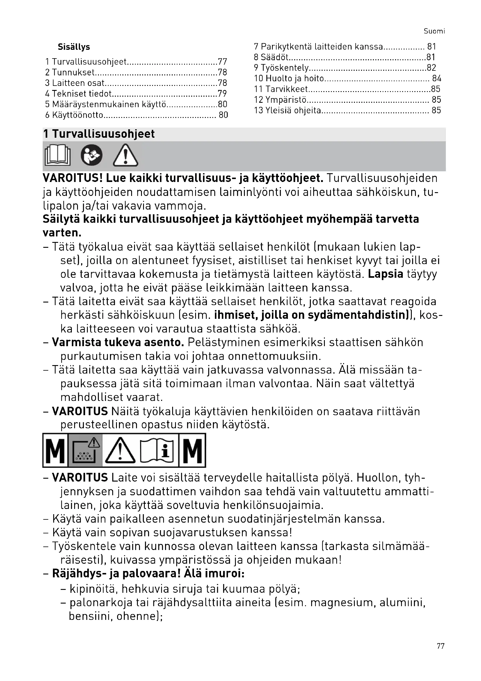 - 13 Yleisiä ohjeita 1 Turvallisuusohjeet VAROITUS! Lue kaikki turvallisuus- ja käyttöohjeet. Turvallisuusohjeiden ja käyttöohjeiden noudattamisen laiminlyönti voi aiheuttaa sähköiskun, tu lipalon ja/tai vakavia vammoja. Säilytä kaikki turvallisuusohjeet ja käyttöohjeet myöhempää tarvetta varten. – Tätä työkalua eivät saa käyttää sellaiset henkilöt (mukaan lukien lap set), joilla on alentuneet fyysiset, aistilliset tai henkiset kyvyt tai joilla ei ole tarvittavaa kokemusta ja tietämystä laitteen käytöstä. Lapsia täytyy valvoa, jotta he eivät pääse leikkimään laitteen kanssa. – Tätä laitetta eivät saa käyttää sellaiset henkilöt, jotka saattavat reagoida herkästi sähköiskuun (esim. ihmiset, joilla on sydämentahdistin)), kos ka laitteeseen voi varautua staattista sähköä. – Varmista tukeva asento. Pelästyminen esimerkiksi staattisen sähkön purkautumisen takia voi johtaa onnettomuuksiin. – Tätä laitetta saa käyttää vain jatkuvassa valvonnassa. Älä missään ta pauksessa jätä sitä toimimaan ilman valvontaa. Näin saat vältettyä mahdolliset vaarat. – VAROITUS Näitä työkaluja käyttävien henkilöiden on saatava riittävän perusteellinen opastus niiden käytöstä. – VAROITUS Laite voi sisältää terveydelle haitallista pölyä. Huollon, tyh jennyksen ja suodattimen vaihdon saa tehdä vain valtuutettu ammatti lainen, joka käyttää soveltuvia henkilönsuojaimia. – Käytä vain paikalleen asennetun suodatinjärjestelmän kanssa. – Käytä vain sopivan suojavarustuksen kanssa! – Työskentele vain kunnossa olevan laitteen kanssa (tarkasta silmämää räisesti), kuivassa ympäristössä ja ohjeiden mukaan! – Räjähdys- ja palovaara! Älä imuroi: – kipinöitä, hehkuvia siruja tai kuumaa pölyä; – palonarkoja tai räjähdysalttiita aineita (esim. magnesium, alumiini, bensiini, ohenne); Suomi 77– syövyttäviä aineita (esim. hapot, emäsliuokset, liuottimet); – kemiallisesti reaktiivisia aineita, jotka aiheuttavat lämpöä, happo ja/emäksiä, kaasuja yms. (esim. reaktiiviset 2K-materiaalit, alumiini ja vesi). – Noudata kansallisia turvallisuusmääräyksiä sekä materiaalin valmista jan antamia ohjeita! – Varoitus Käytä koneen pistorasiaa vain ohjeiden ilmoittamiin tarkoituk siin. – Vaaran välttämiseksi tarkasta pistoke, pistorasia, johto ja suodatin säännöllisin väliajoin. Vaihdata vialliset sähkökomponentit vain valtuu tetussa huoltokorjaamossa. – Verkkosähköpistoke täytyy aina vetää irti pistorasiasta ennen puhdis tusta, huoltoa, käyttötarvikkeiden vaihtoa tai laitteen muutostoimenpi teitä. – VARO Puhdista vesimäärän rajoituslaite säännöllisin väliajoin ja tarkista se vaurioiden varalta. – VAROITUS Sammuta kone heti, jos siitä valuu ulos vaahtoa tai nestettä. – Käytä vain alkuperäistä Festool-imuletkua. – Huomioi työskentelyalueen olosuhteet ja varmista oma ja sivullisten turvallisuus laitteen kujetuksen ja käytön aikana. Tällä tavalla estät esim. imuletkun tai verkkovirtavirtajohdon aiheutta mat kompastumiset. – Kanna laitetta vain sen asianmukaisen kahvan varassa. – Älä nosta äläkä kuljeta nosturikoukun tai nostolaitteen varassa. – Pidä pakkauskalvot poissa lasten ulottuvilta. Tukehtumisvaara. 2 Tunnukset Varoitus yleisestä vaarasta Sähköiskuvaara Lue käyttöohjeet ja turvallisuusohjeet! Käytä hengityssuojainta. Ohje, vihje Käsittelyohje Varoitus! Laite voi sisältää terveydelle haitallista pölyä! Soveltuu altistuksen raja-arvol taan yli 0,1mg/m p. 85