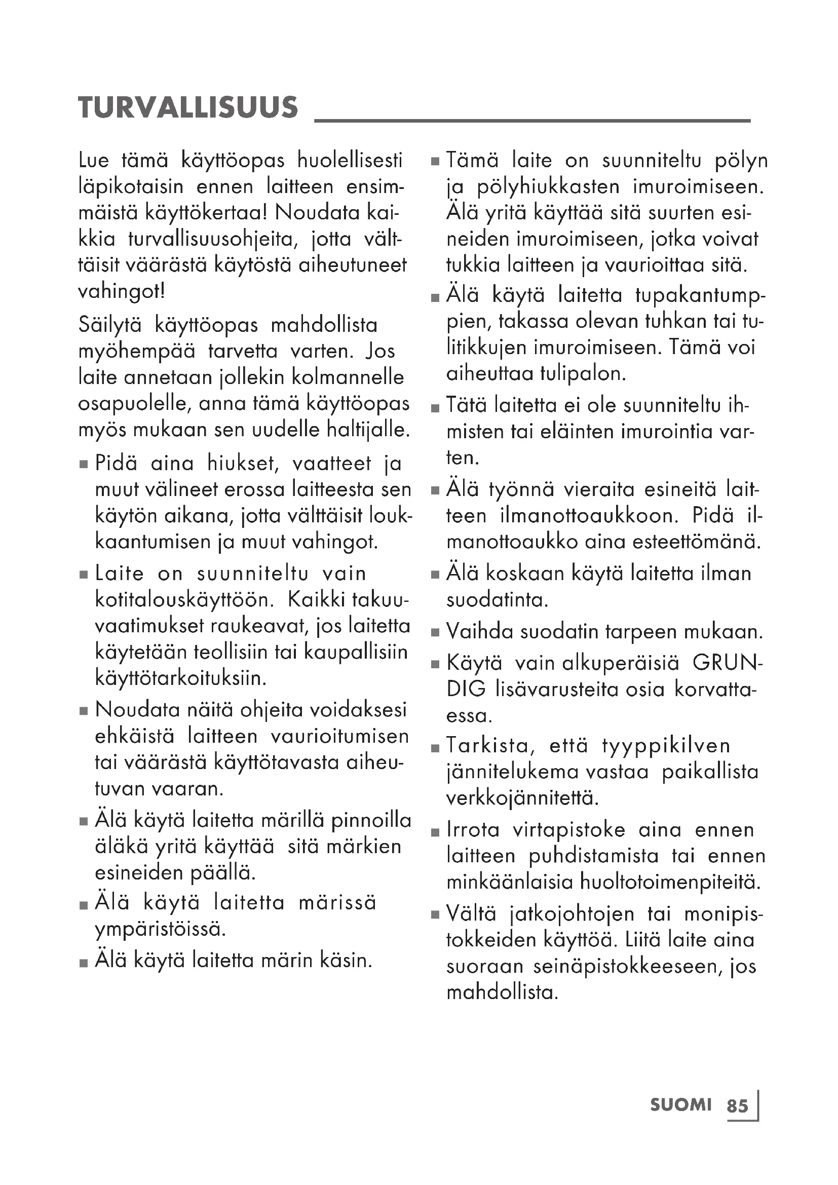 SUOMI Käyttöönotossa, tavanomaisessa käytössä ja puhdis- tuksessa tulee noudattaa tämän käyttöoppaan sivuilla 5-6-7esitettyjä ohjeita. VIANMÄÄRITYS
