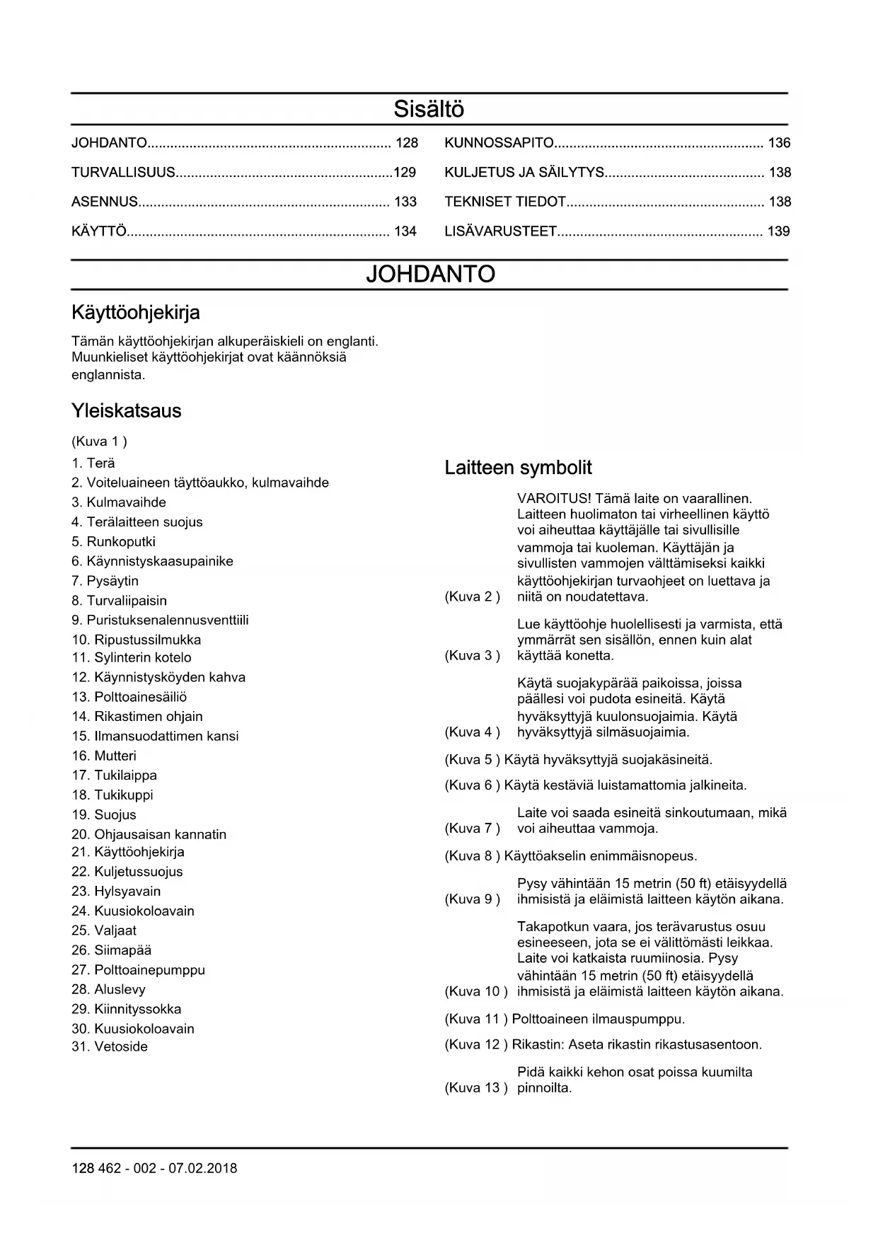 Laitteen symbolit (Kuva 2 ) VAROITUS! Tämä laite on vaarallinen. Laitteen huolimaton tai virheellinen käyttö voi aiheuttaa käyttäjälle tai sivullisille vammoja tai kuoleman. Käyttäjän ja sivullisten vammojen välttämiseksi kaikki käyttöohjekirjan turvaohjeet on luettava ja niitä on noudatettava. (Kuva 3 ) Lue käyttöohje huolellisesti ja varmista, että ymmärrät sen sisällön, ennen kuin alat käyttää konetta. (Kuva 4 ) Käytä suojakypärää paikoissa, joissa päällesi voi pudota esineitä. Käytä hyväksyttyjä kuulonsuojaimia. Käytä hyväksyttyjä silmäsuojaimia. (Kuva 5 ) Käytä hyväksyttyjä suojakäsineitä. (Kuva 6 ) Käytä kestäviä luistamattomia jalkineita. (Kuva 7 ) Laite voi saada esineitä sinkoutumaan, mikä voi aiheuttaa vammoja. (Kuva 8 ) Käyttöakselin enimmäisnopeus. (Kuva 9 ) Pysy vähintään 15 metrin (50 ft) etäisyydellä ihmisistä ja eläimistä laitteen käytön aikana. (Kuva 10 ) Takapotkun vaara, jos terävarustus osuu esineeseen, jota se ei välittömästi leikkaa. Laite voi katkaista ruumiinosia. Pysy vähintään 15 metrin (50 ft) etäisyydellä ihmisistä ja eläimistä laitteen käytön aikana. (Kuva 11 ) Polttoaineen ilmauspumppu. (Kuva 12 ) Rikastin: Aseta rikastin rikastusasentoon. (Kuva 13 ) Pidä kaikki kehon osat poissa kuumilta pinnoilta. 128 462 - 002 - 07.02.2018(Kuva 14 ) Melupäästöt ympäristöön ovat Euroopan yhteisön direktiivin mukaiset. Tuotteen päästöt ilmoitetaan luvussa Tekniset tiedot ja arvokilvessä. (Kuva 15 ) Laite täyttää voimassa olevien EY- direktiivien vaatimukset. Huomautus: Muita laitteen symboleita/tarroja tarvitaan muilla markkina-alueilla ilmaisemaan sertifiointivaatimuksia. Tuotevastuu Tuotevastuulain mukaisesti emme ole vastuussa tuotteen aiheuttamasta vaurioista, jos