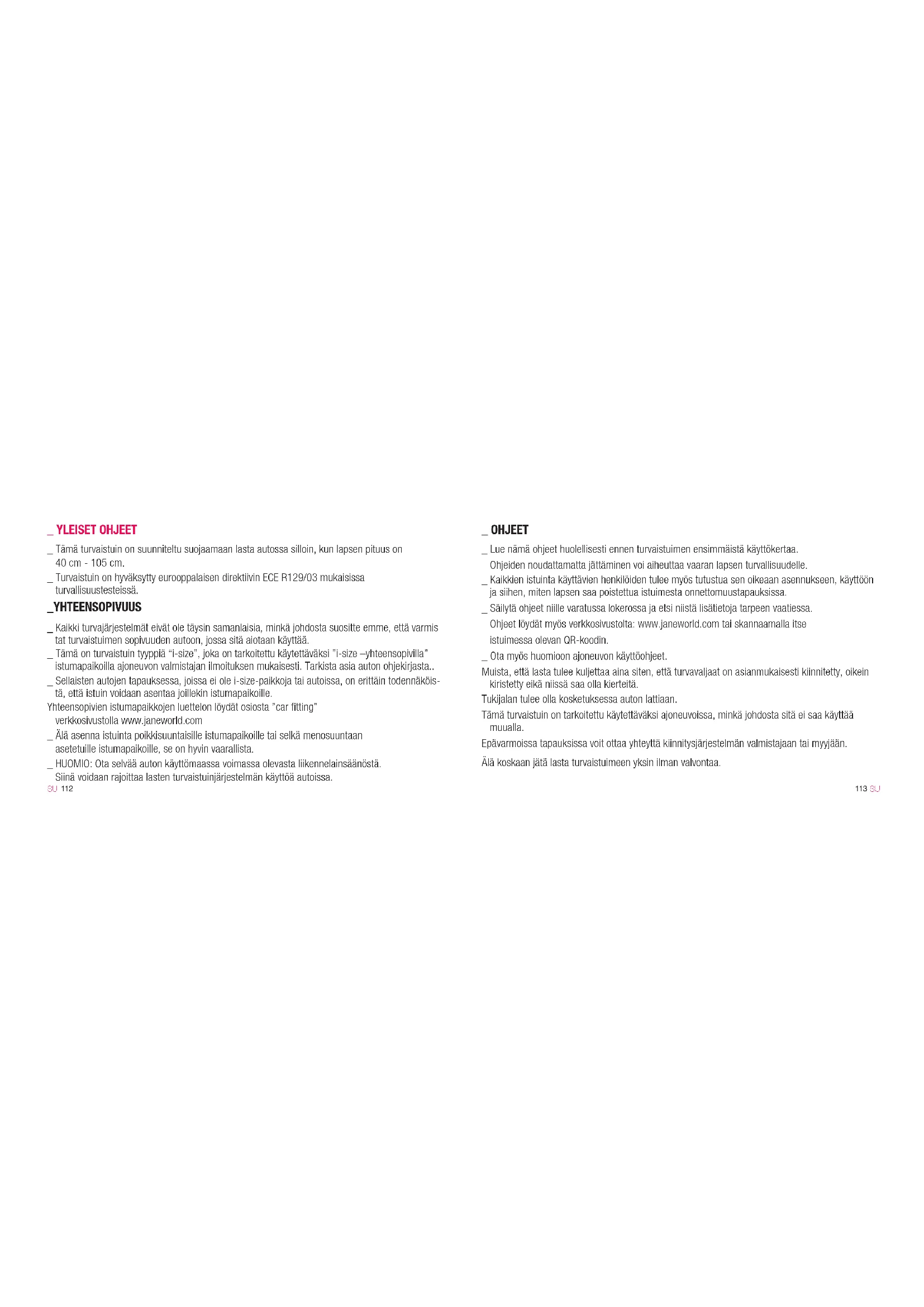 _ YLEISET OHJEET _ Tämä turvaistuin on suunniteltu suojaamaan lasta autossa silloin, kun lapsen pituus on 40 cm - 105 cm. _ Turvaistuin on hyväksytty eurooppalaisen direktiivin ECE R129/03 mukaisissa turvallisuustesteissä. _YHTEENSOPIVUUS _ Kaikki turvajärjestelmät eivät ole täysin samanlaisia, minkä johdosta suositte emme, että varmis tat turvaistuimen sopivuuden autoon, jossa sitä aiotaan käyttää. _ Tämä on turvaistuin tyyppiä “i-size”, joka on tarkoitettu käytettäväksi ”i-size –yhteensopivilla” istumapaikoilla ajoneuvon valmistajan ilmoituksen mukaisesti. Tarkista asia auton ohjekirjasta.. _ Sellaisten autojen tapauksessa, joissa ei ole i-size-paikkoja tai autoissa, on erittäin todennäköis- tä, että istuin voidaan asentaa joillekin istumapaikoille. Yhteensopivien istumapaikkojen luettelon löydät osiosta ”car fitting” verkkosivustolla www.janeworld.com _ Älä asenna istuinta poikkisuuntaisille istumapaikoille tai selkä menosuuntaan asetetuille istumapaikoille, se on hyvin vaarallista. _ HUOMIO: Ota selvää auton käyttömaassa voimassa olevasta liikennelainsäänöstä. Siinä voidaan rajoittaa lasten turvaistuinjärjestelmän käyttöä autoissa. _ OHJEET _ Lue nämä ohjeet huolellisesti ennen turvaistuimen ensimmäistä käyttökertaa. Ohjeiden noudattamatta jättäminen voi aiheuttaa vaaran lapsen turvallisuudelle. _ Kaikkien istuinta käyttävien henkilöiden tulee myös tutustua sen oikeaan asennukseen, käyttöön ja siihen, miten lapsen saa poistettua istuimesta onnettomuustapauksissa. _ Säilytä ohjeet niille varatussa lokerossa ja etsi niistä lisätietoja tarpeen vaatiessa. Ohjeet löydät myös verkkosivustolta: www.janeworld.com tai skannaamalla itse istuimessa olevan QR-koodin. _ Ota myös huomioon ajoneuvon käyttöohjeet. Muista, että lasta tulee kuljettaa aina siten, että turvavaljaat on asianmukaisesti kiinnitetty, oikein kiristetty eikä niissä saa olla kierteitä. Tukijalan tulee olla kosketuksessa auton lattiaan. Tämä turvaistuin on tarkoitettu käytettäväksi ajoneuvoissa, minkä johdosta sitä ei saa käyttää muualla. Epävarmoissa tapauksissa voit ottaa yhteyttä kiinnitysjärjestelmän valmistajaan tai myyjään. Älä koskaan jätä lasta turvaistuimeen yksin ilman valvontaa.115