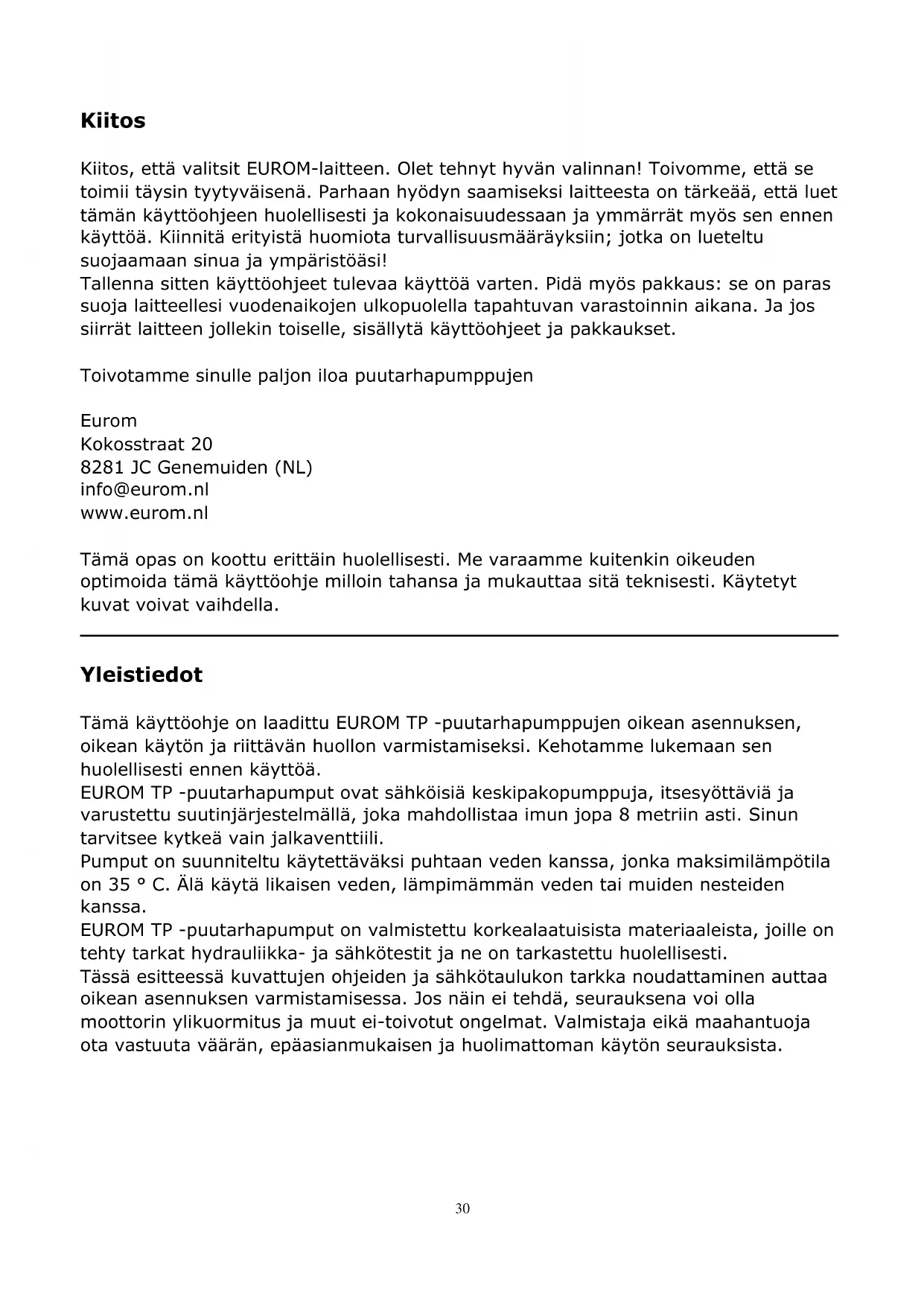 CE-erklæring Se side 34.30 Kiitos Kiitos, että valitsit EUROM-laitteen. Olet tehnyt hyvän valinnan! Toivomme, että se toimii täysin tyytyväisenä. Parhaan hyödyn saamiseksi laitteesta on tärkeää, että luet tämän käyttöohjeen huolellisesti ja kokonaisuudessaan ja ymmärrät myös sen ennen käyttöä. Kiinnitä erityistä huomiota turvallisuusmääräyksiin; jotka on lueteltu suojaamaan sinua ja ympäristöäsi! Tallenna sitten käyttöohjeet tulevaa käyttöä varten. Pidä myös pakkaus: se on paras suoja laitteellesi vuodenaikojen ulkopuolella tapahtuvan varastoinnin aikana. Ja jos siirrät laitteen jollekin toiselle, sisällytä käyttöohjeet ja pakkaukset. Toivotamme sinulle paljon iloa puutarhapumppujen Eurom Kokosstraat 20 8281 JC Genemuiden (NL) info@eurom.nl www.eurom.nl Tämä opas on koottu erittäin huolellisesti. Me varaamme kuitenkin oikeuden optimoida tämä käyttöohje milloin tahansa ja mukauttaa sitä teknisesti. Käytetyt kuvat voivat vaihdella.