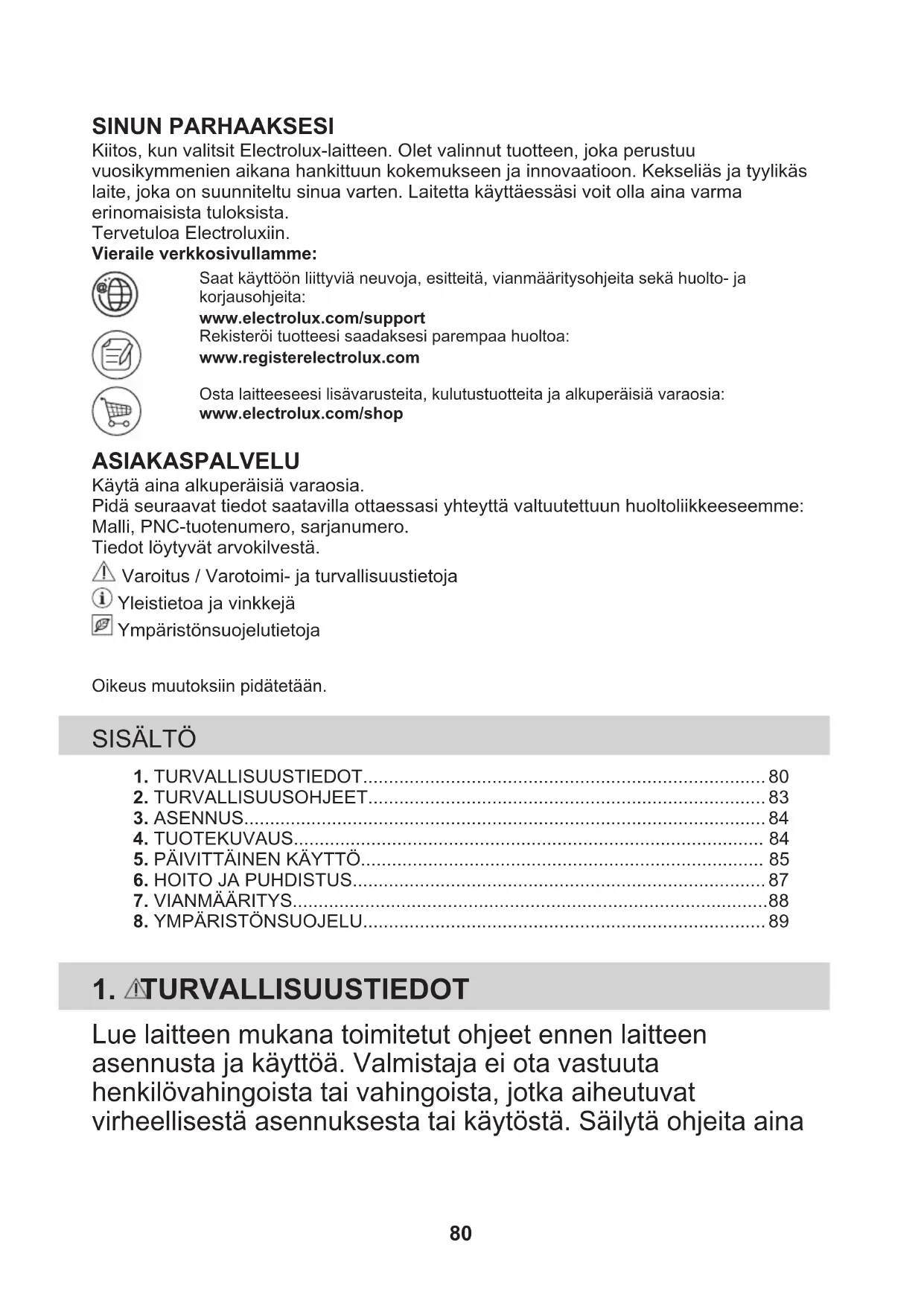 Sümboliga tähistatud materjalid võib ringlusse suunata. Selleks viige pakendid vastavatesse konteineritesse. Aidake hoida keskkonda ja inimeste tervist ja suunake elektri- ja elektroonilised jäätmed ringlusse. Ärge visake sümboliga tähistatud seadmeid muude majapidamisjäätmete hulka. Viige seade kohalikku ringluspunkti või pöörduge abi saamiseks kohalikku omavalitsusse. 79SINUN PARHAAKSESI Kiitos, kun valitsit Electrolux-laitteen. Olet valinnut tuotteen, joka perustuuvuosikymmenien aikana hankittuun kokemukseen ja innovaatioon. Kekseliäs ja tyylikäslaite, joka on suunniteltu sinua varten. Laitetta käyttäessäsi voit olla aina varmaerinomaisista tuloksista.Tervetuloa Electroluxiin.Vieraile verkkosivullamme:Saat käyttöön liittyviä neuvoja, esitteitä, vianmääritysohjeita sekä huolto- jakorjausohjeita:www.electrolux.com/supportRekisteröi tuotteesi saadaksesi parempaa huoltoa:www.registerelectrolux.comOsta laitteeseesi lisävarusteita, kulutustuotteita ja alkuperäisiä varaosia:www.electrolux.com/shop ASIAKASPALVELU Käytä aina alkuperäisiä varaosia.Pidä seuraavat tiedot saatavilla ottaessasi yhteyttä valtuutettuun huoltoliikkeeseemme:Malli, PNC-tuotenumero, sarjanumero.Tiedot löytyvät arvokilvestä. Varoitus / Varotoimi- ja turvallisuustietoja Yleistietoa ja vinkkejä YmpäristönsuojelutietojaOikeus muutoksiin pidätetään. SISÄLTÖ