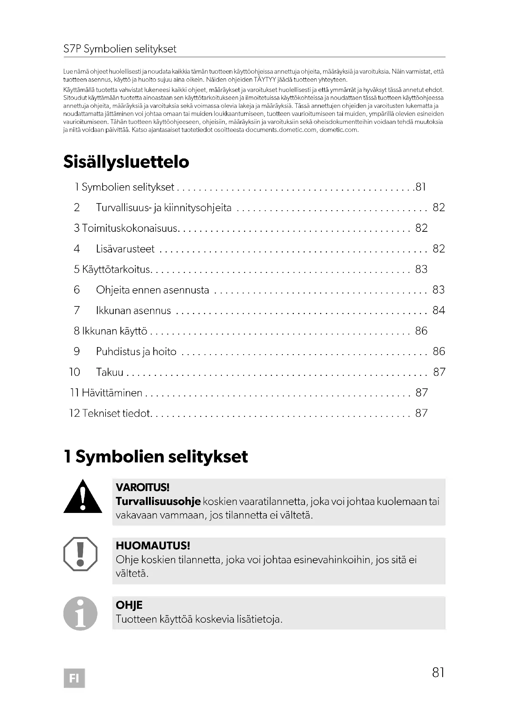 - Lue nämä ohjeet huolellisesti ja noudata kaikkia tämän tuotteen käyttöohjeissa annettuja ohjeita, määräyksiä ja varoituksia. Näin varmistat, että tuotteen asennus, käyttö ja huolto sujuu aina oikein. Näiden ohjeiden TÄYTYY jäädä tuotteen yhteyteen. Käyttämällä tuotetta vahvistat lukeneesi kaikki ohjeet, määräykset ja varoitukset huolellisesti ja että ymmärrät ja hyväksyt tässä annetut ehdot. Sitoudut käyttämään tuotetta ainoastaan sen käyttötarkoitukseen ja ilmoitetuissa käyttökohteissa ja noudattaen tässä tuotteen käyttöohjeessa annettuja ohjeita, määräyksiä ja varoituksia sekä voimassa olevia lakeja ja määräyksiä. Tässä annettujen ohjeiden ja varoitusten lukematta ja noudattamatta jättäminen voi johtaa omaan tai muiden loukkaantumiseen, tuotteen vaurioitumiseen tai muiden, ympärillä olevien esineiden vaurioitumiseen. Tähän tuotteen käyttöohjeeseen, ohjeisiin, määräyksiin ja varoituksiin sekä oheisdokumentteihin voidaan tehdä muutoksia ja niitä voidaan päivittää. Katso ajantasaiset tuotetiedot osoitteesta documents.dometic.com, dometic.com. Sisällysluettelo 1 Symbolien selitykset p. 81