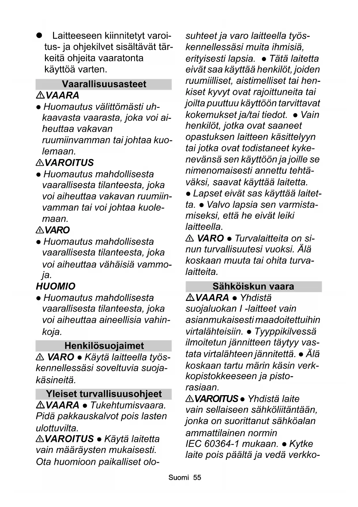 . ● Den- na apparat innehåller hälsovåd- ligt damm. Tömning och underhåll, inklusive borttagning av dammpåsen, får endast utfö- ras av kompetenta personer som bär lämplig skyddsutrust- ning. ● Använd inte apparatenSvenska 53 utan hela filtrationssystemet. ● Observera de tillämpliga sä- kerhetsbestämmelser som gäl- ler för de material som ska behandlas. ● Aktivera spärren på styrvalsen så att apparaten står stadigt. Om spärren är öp- pen kan apparaten börja röra sig okontrollerat. ● Vid underhåll ska användaren demontera, rengöra och underhålla appara- ten utan framkallande av fara för underhållspersonal eller andra personer. Lämpliga försiktig- hetsåtgärder omfattar avgiftning före demonteringen. Vidta åtgär- der för lokalt filtrerad tvångsven- tilering där enheten demonteras samt vid rengöring av under- hållsområden och som lämpligt skydd för personalen. ● Appara- tens utsida ska saneras med hjälp av dammsugning och tor- kas ren eller behandlas med tät- ningsmedel innan den flyttas ut från farligt område. Alla apparat- delar ska kontrolleras avseende föroreningar när de flyttas ut från farligt område. Lämpliga åtgär- der måste vidtas för att undvika dammspridning. ● Vid under- hålls- och reparationsarbeten måste alla förorenade föremål som inte kan rengöras tillräckligt kasseras. Sådana föremål mås- te hanteras i ogenomträngliga påsar i enlighet med gällande bestämmelser för bortskaffning av denna avfallstyp. ● Endast dammklass M och H: Stäng sugöppningen med tätnings- pluggen vid transport och under- håll av enheten. ● Endast dammklass H: Effektiviteten hos enhetens filtrering kan testas enligt testmetoden som specifi- ceras i EN 60 335-2-69 22.AA.201.2. Testet måste utfö- ras minst en gång om året eller oftare om det anges i nationella krav. Om testresultatet är nega- tivt ska testet upprepas med ett nytt planfilter. 몇 VARNING ● Den säkerhets- tekniska funktionen hos säker- hetsanordningar för förebyggande av faror, t.ex. en- hetens täthet, skador på filtret eller kontrollutrustningens funk- tion, måste kontrolleras minst en gång om året av tillverkaren eller av en instruerad person (endast dammklass M och H). Enheter med roterande borstar FARA ● Risk för elektriska stötar. Kör aldrig över strömka- beln eller förlängningskabeln med sughuvudets roterande borstar. 몇 FÖRSIKTIGHET ● Olämpliga borstar äventyrar din säkerhet. Använd endast de borstar som medföljer enheten eller som re- kommenderas i bruksanvisning- en.54 Suomi Maskiner med luftringutrustning 몇 FÖRSIKTIGHET ● Överskrid aldrig det maximalt tillåtna ring- trycket. Ringtrycket måste avlä- sas på däcket och eventuellt på fälgen. Om värdena är olika måste det lägre värdet iakttas. ● Kontrollera att tryckreducera- ren på kompressorn är korrekt inställd innan ringtrycket ställs in. ● För maskiner med fastskru- vade fälgar: Kontrollera att fäl- gens alla skruvar är ordentligt åtdragna innan ringtrycket ställs in. Skötsel och underhåll 몇 VARNING ● Inför rengöring, underhåll och byte av delar mås- te enheten stängas av och nät- kontakten dras ur eller batteripaketet plockas bort. Stäng av enheten före byte till en annan funktion. 몇 FÖRSIKTIGHET ● Låt en- dast kundtjänst eller yrkesutöva- re med relevant behörighet, väl förtrogna med alla tillämpliga sä- kerhetsföreskrifter, genomföra reparationer. ● Rengör begräns- ningsanordningen för vattenni- vån regelbundet och kontrollera om det finns tecken på skador. OBSERVERA ● Iaktta säker- hetskontrollen för mobila, yrkes- mässigt använda maskiner enligt lokalt gällande föreskrifter ● Kortslutningar eller andra skador. Rengör inte maskinen med slang- eller högtrycksvat- tenstråle. Enheter med elektriska anslutningar i sugslangen FARA ● Risk för elektriska stötar. Sänk aldrig ner slangen i vattnet för rengöring. Tillbehör och reservdelar 몇 FÖRSIKTIGHET ● Använd endast tillbehör och reservdelar som har godkänts av tillverka- ren. Originaltillbehör och origi- nalreservdelar garanterar en säker och störningsfri drift av maskinen. Transport 몇 FÖRSIKTIGHET ● Stäng av motorn före transport. Gör fast maskinen med hänsyn till vikten, se kapitlet Tekniska data i bruks- anvisningen. Turvallisuusohjeet Märkä-/ kuivaimuri Lue ennen laitteen en- simmäistä käyttöä nä- mä turvallisuusohjeet ja alkuperäinen käyttöohje. Menet- tele niiden mukaisesti. Säilytä molemmat ohjeet myöhempää käyttöä tai laitteen seuraavaa omistajaa varten. Käyttöohjeen ohjeiden lisäksi sinun on noudatettava laki- määräisiä yleisiä turvallisuus- ja tapaturmantorjuntamäärä- yksiä.Suomi 55 Laitteeseen kiinnitetyt varoi- tus- ja ohjekilvet sisältävät tär- keitä ohjeita vaaratonta käyttöä varten. Vaarallisuusasteet VAARA ● Huomautus välittömästi uh- kaavasta vaarasta, joka voi ai- heuttaa vakavan ruumiinvamman tai johtaa kuo- lemaan. 몇 VAROITUS ● Huomautus mahdollisesta vaarallisesta tilanteesta, joka voi aiheuttaa vakavan ruumiin- vamman tai voi johtaa kuole- maan. 몇 VARO ● Huomautus mahdollisesta vaarallisesta tilanteesta, joka voi aiheuttaa vähäisiä vammo- ja. HUOMIO ● Huomautus mahdollisesta vaarallisesta tilanteesta, joka voi aiheuttaa aineellisia vahin- koja. Henkilösuojaimet 몇 VARO ● Käytä laitteella työs- kennellessäsi soveltuvia suoja- käsineitä. Yleiset turvallisuusohjeet VAARA ● Tukehtumisvaara. Pidä pakkauskalvot pois lasten ulottuvilta. 몇 VAROITUS ● Käytä laitetta vain määräysten mukaisesti. Ota huomioon paikalliset olo- suhteet ja varo laitteella työs- kennellessäsi muita ihmisiä, erityisesti lapsia. ● Tätä laitetta eivät saa käyttää henkilöt, joiden ruumiilliset, aistimelliset tai hen- kiset kyvyt ovat rajoittuneita tai joilta puuttuu käyttöön tarvittavat kokemukset ja/tai tiedot. ● Vain h