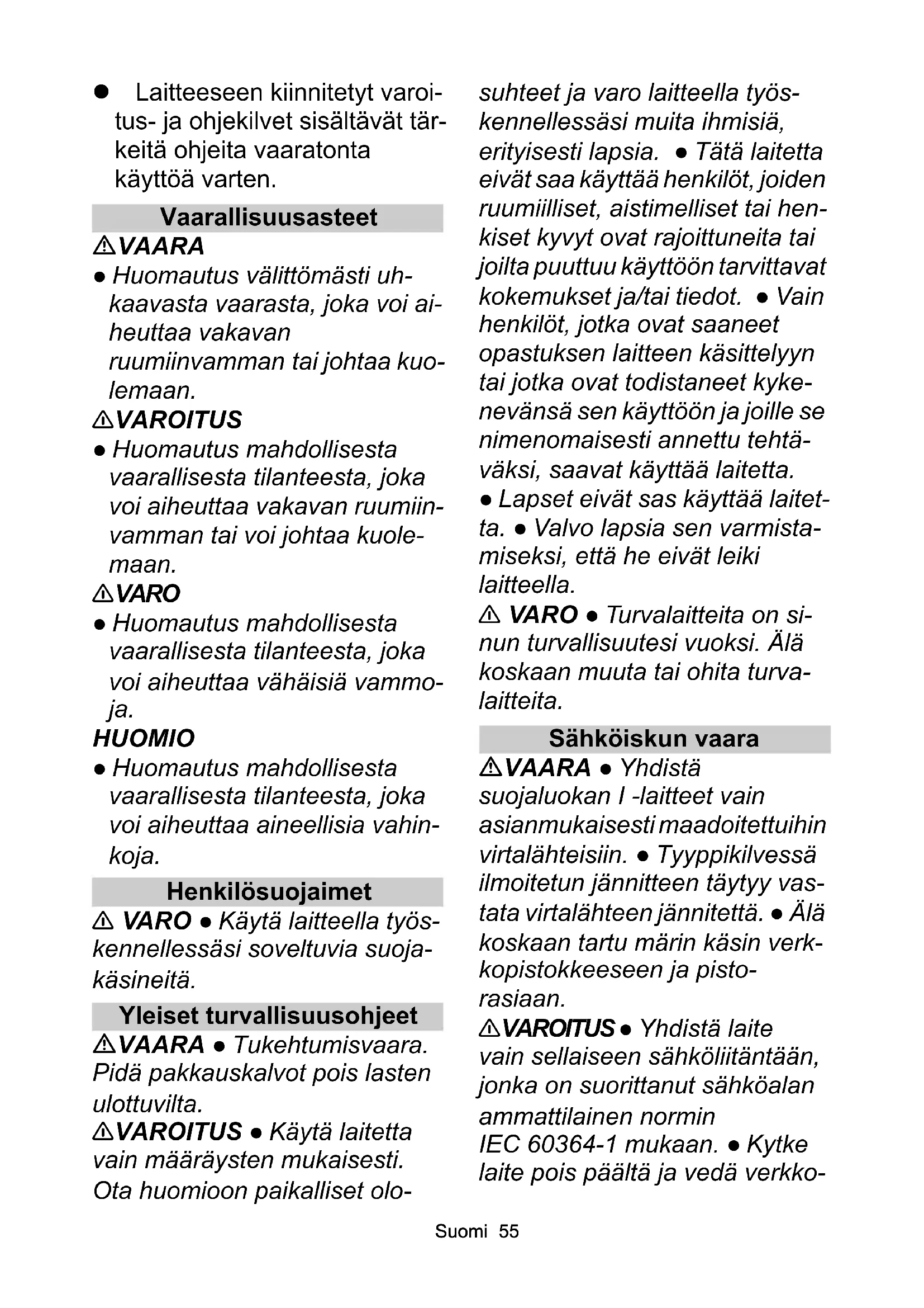 . ● Den- na apparat innehåller hälsovåd- ligt damm. Tömning och underhåll, inklusive borttagning av dammpåsen, får endast utfö- ras av kompetenta personer som bär lämplig skyddsutrust- ning. ● Använd inte apparatenSvenska 53 utan hela filtrationssystemet. ● Observera de tillämpliga sä- kerhetsbestämmelser som gäl- ler för de material som ska behandlas. ● Aktivera spärren på styrvalsen så att apparaten står stadigt. Om spärren är öp- pen kan apparaten börja röra sig okontrollerat. ● Vid underhåll ska användaren demontera, rengöra och underhålla appara- ten utan framkallande av fara för underhållspersonal eller andra personer. Lämpliga försiktig- hetsåtgärder omfattar avgiftning före demonteringen. Vidta åtgär- der för lokalt filtrerad tvångsven- tilering där enheten demonteras samt vid rengöring av under- hållsområden och som lämpligt skydd för personalen. ● Appara- tens utsida ska saneras med hjälp av dammsugning och tor- kas ren eller behandlas med tät- ningsmedel innan den flyttas ut från farligt område. Alla apparat- delar ska kontrolleras avseende föroreningar när de flyttas ut från farligt område. Lämpliga åtgär- der måste vidtas för att undvika dammspridning. ● Vid under- hålls- och reparationsarbeten måste alla förorenade föremål som inte kan rengöras tillräckligt kasseras. Sådana föremål mås- te hanteras i ogenomträngliga påsar i enlighet med gällande bestämmelser för bortskaffning av denna avfallstyp. ● Endast dammklass M och H: Stäng sugöppningen med tätnings- pluggen vid transport och under- håll av enheten. ● Endast dammklass H: Effektiviteten hos enhetens filtrering kan testas enligt testmetoden som specifi- ceras i EN 60 335-2-69 22.AA.201.2. Testet måste utfö- ras minst en gång om året eller oftare om det anges i nationella krav. Om testresultatet är nega- tivt ska testet upprepas med ett nytt planfilter. 몇 VARNING ● Den säkerhets- tekniska funktionen hos säker- hetsanordningar för förebyggande av faror, t.ex. en- hetens täthet, skador på filtret eller kontrollutrustningens funk- tion, måste kontrolleras minst en gång om året av tillverkaren eller av en instruerad person (endast dammklass M och H). Enheter med roterande borstar FARA ● Risk för elektriska stötar. Kör aldrig över strömka- beln eller förlängningskabeln med sughuvudets roterande borstar. 몇 FÖRSIKTIGHET ● Olämpliga borstar äventyrar din säkerhet. Använd endast de borstar som medföljer enheten eller som re- kommenderas i bruksanvisning- en.54 Suomi Maskiner med luftringutrustning 몇 FÖRSIKTIGHET ● Överskrid aldrig det maximalt tillåtna ring- trycket. Ringtrycket måste avlä- sas på däcket och eventuellt på fälgen. Om värdena är olika måste det lägre värdet iakttas. ● Kontrollera att tryckreducera- ren på kompressorn är korrekt inställd innan ringtrycket ställs in. ● För maskiner med fastskru- vade fälgar: Kontrollera att fäl- gens alla skruvar är ordentligt åtdragna innan ringtrycket ställs in. Skötsel och underhåll 몇 VARNING ● Inför rengöring, underhåll och byte av delar mås- te enheten stängas av och nät- kontakten dras ur eller batteripaketet plockas bort. Stäng av enheten före byte till en annan funktion. 몇 FÖRSIKTIGHET ● Låt en- dast kundtjänst eller yrkesutöva- re med relevant behörighet, väl förtrogna med alla tillämpliga sä- kerhetsföreskrifter, genomföra reparationer. ● Rengör begräns- ningsanordningen för vattenni- vån regelbundet och kontrollera om det finns tecken på skador. OBSERVERA ● Iaktta säker- hetskontrollen för mobila, yrkes- mässigt använda maskiner enligt lokalt gällande föreskrifter ● Kortslutningar eller andra skador. Rengör inte maskinen med slang- eller högtrycksvat- tenstråle. Enheter med elektriska anslutningar i sugslangen FARA ● Risk för elektriska stötar. Sänk aldrig ner slangen i vattnet för rengöring. Tillbehör och reservdelar 몇 FÖRSIKTIGHET ● Använd endast tillbehör och reservdelar som har godkänts av tillverka- ren. Originaltillbehör och origi- nalreservdelar garanterar en säker och störningsfri drift av maskinen. Transport 몇 FÖRSIKTIGHET ● Stäng av motorn före transport. Gör fast maskinen med hänsyn till vikten, se kapitlet Tekniska data i bruks- anvisningen. Turvallisuusohjeet Märkä-/ kuivaimuri Lue ennen laitteen en- simmäistä käyttöä nä- mä turvallisuusohjeet ja alkuperäinen käyttöohje. Menet- tele niiden mukaisesti. Säilytä molemmat ohjeet myöhempää käyttöä tai laitteen seuraavaa omistajaa varten. Käyttöohjeen ohjeiden lisäksi sinun on noudatettava laki- määräisiä yleisiä turvallisuus- ja tapaturmantorjuntamäärä- yksiä.Suomi 55 Laitteeseen kiinnitetyt varoi- tus- ja ohjekilvet sisältävät tär- keitä ohjeita vaaratonta käyttöä varten. Vaarallisuusasteet VAARA ● Huomautus välittömästi uh- kaavasta vaarasta, joka voi ai- heuttaa vakavan ruumiinvamman tai johtaa kuo- lemaan. 몇 VAROITUS ● Huomautus mahdollisesta vaarallisesta tilanteesta, joka voi aiheuttaa vakavan ruumiin- vamman tai voi johtaa kuole- maan. 몇 VARO ● Huomautus mahdollisesta vaarallisesta tilanteesta, joka voi aiheuttaa vähäisiä vammo- ja. HUOMIO ● Huomautus mahdollisesta vaarallisesta tilanteesta, joka voi aiheuttaa aineellisia vahin- koja. Henkilösuojaimet 몇 VARO ● Käytä laitteella työs- kennellessäsi soveltuvia suoja- käsineitä. Yleiset turvallisuusohjeet VAARA ● Tukehtumisvaara. Pidä pakkauskalvot pois lasten ulottuvilta. 몇 VAROITUS ● Käytä laitetta vain määräysten mukaisesti. Ota huomioon paikalliset olo- suhteet ja varo laitteella työs- kennellessäsi muita ihmisiä, erityisesti lapsia. ● Tätä laitetta eivät saa käyttää henkilöt, joiden ruumiilliset, aistimelliset tai hen- kiset kyvyt ovat rajoittuneita tai joilta puuttu