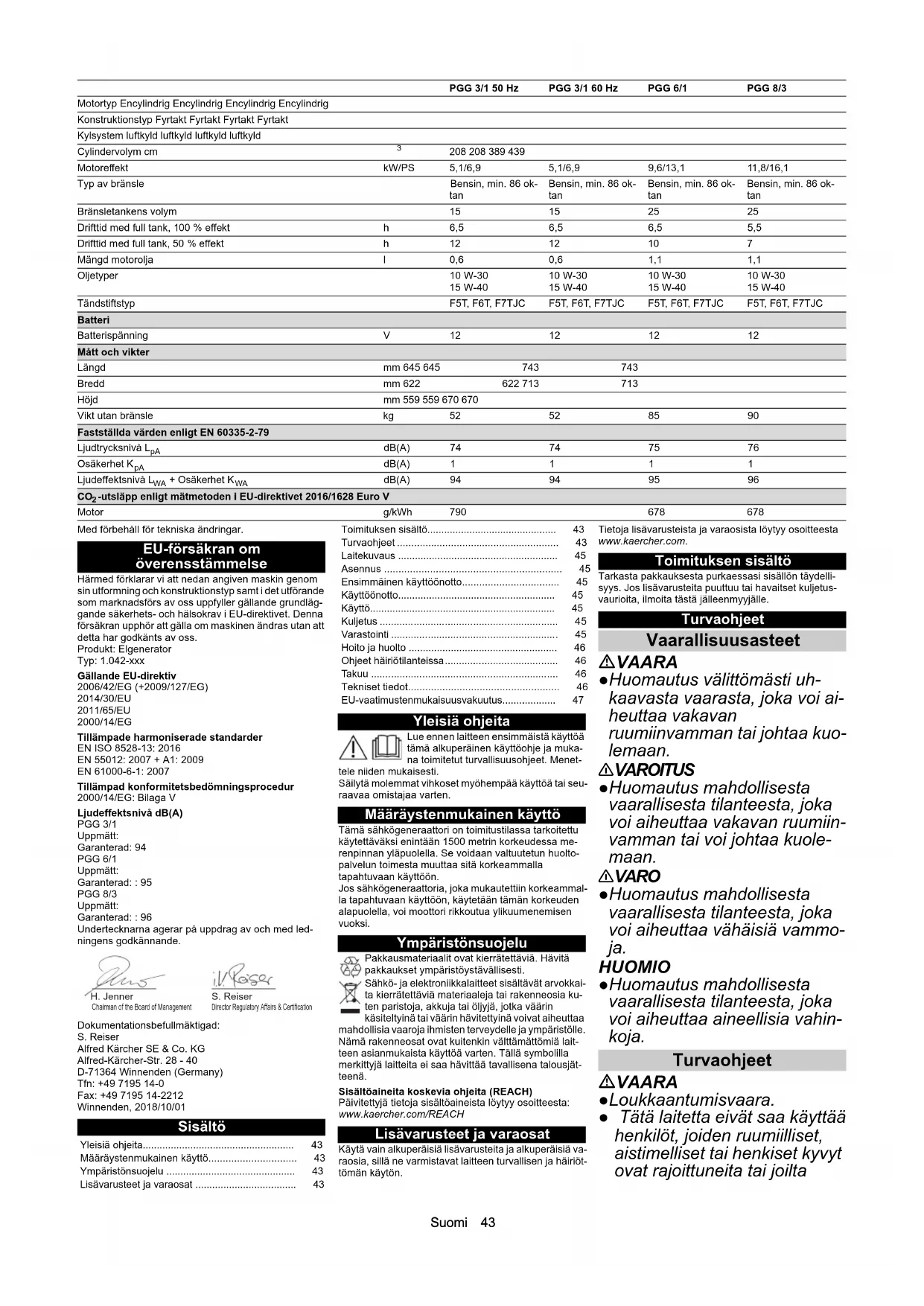 EN 55012: 2007 + A1: 2009 EN 61000-6-1: 2007 Tillämpad konformitetsbedömningsprocedur 2000/14/EG: Bilaga V Ljudeffektsnivå dB(A) PGG 3/1 Uppmätt: Garanterad: 94 PGG 6/1 Uppmätt: Garanterad: : 95 PGG 8/3 Uppmätt: Garanterad: : 96 Undertecknarna agerar på uppdrag av och med led- ningens godkännande. Dokumentationsbefullmäktigad: S. Reiser Alfred Kärcher SE & Co. KG Alfred-Kärcher-Str. 28 - 40 D-71364 Winnenden (Germany) Tfn: +49 7195 14-0 Fax: +49 7195 14-2212 Winnenden, 2018/10/01 Sisältö Yleisiä ohjeita Lue ennen laitteen ensimmäistä käyttöä tämä alkuperäinen käyttöohje ja muka- na toimitetut turvallisuusohjeet. Menet- tele niiden mukaisesti. Säilytä molemmat vihkoset myöhempää käyttöä tai seu- raavaa omistajaa varten. Määräystenmukainen käyttö Tämä sähkögeneraattori on toimitustilassa tarkoitettu käytettäväksi enintään 1500 metrin korkeudessa me- renpinnan yläpuolella. Se voidaan valtuutetun huolto- palvelun toimesta muuttaa sitä korkeammalla tapahtuvaan käyttöön. Jos sähkögeneraattoria, joka mukautettiin korkeammal- la tapahtuvaan käyttöön, käytetään tämän korkeuden alapuolella, voi moottori rikkoutua ylikuumenemisen vuoksi. Ympäristönsuojelu Pakkausmateriaalit ovat kierrätettäviä. Hävitä pakkaukset ympäristöystävällisesti. Sähkö- ja elektroniikkalaitteet sisältävät arvokkai- ta kierrätettäviä materiaaleja tai rakenneosia ku- ten paristoja, akkuja tai öljyjä, jotka väärin käsiteltyinä tai väärin hävitettyinä voivat aiheuttaa mahdollisia vaaroja ihmisten terveydelle ja ympäristölle. Nämä rakenneosat ovat kuitenkin välttämättömiä lait- teen asianmukaista käyttöä varten. Tällä symbolilla merkittyjä laitteita ei saa hävittää tavallisena talousjät- teenä. Sisältöaineita koskevia ohjeita (REACH) Päivitettyjä tietoja sisältöaineista löytyy osoitteesta: www.kaercher.com/REACH Lisävarusteet ja varaosat Käytä vain alkuperäisiä lisävarusteita ja alkuperäisiä va- raosia, sillä ne varmistavat laitteen turvallisen ja häiriöt- tömän käytön. Tietoja lisävarusteista ja varaosista löytyy osoitteesta www.kaercher.com. Toimituksen sisältö Tarkasta pakkauksesta purkaessasi sisällön täydelli- syys. Jos lisävarusteita puuttuu tai havaitset kuljetus- vaurioita, ilmoita tästä jälleenmyyjälle. Turvaohjeet Vaarallisuusasteet VAARA ●Huomautus välittömästi uh- kaavasta vaarasta, joka voi ai- heuttaa vakavan ruumiinvamman tai johtaa kuo- lemaan. 몇 VAROITUS ●Huomautus mahdollisesta vaarallisesta tilanteesta, joka voi aiheuttaa vakavan ruumiin- vamman tai voi johtaa kuole- maan. 몇 VARO ●Huomautus mahdollisesta vaarallisesta tilanteesta, joka voi aiheuttaa vähäisiä vammo- ja. HUOMIO ●Huomautus mahdollisesta vaarallisesta tilanteesta, joka voi aiheuttaa aineellisia vahin- koja. Turvaohjeet VAARA ●Loukkaantumisvaara. ● Tätä laitetta eivät saa käyttää henkilöt, joiden ruumiilliset, aistimelliset tai henkiset kyvyt ovat rajoittuneita tai joilta Motortyp Encylindrig Encylindrig Encylindrig Encylindrig Konstruktionstyp Fyrtakt Fyrtakt Fyrtakt Fyrtakt Kylsystem luftkyld luftkyld luftkyld luftkyld Cylindervolym cm