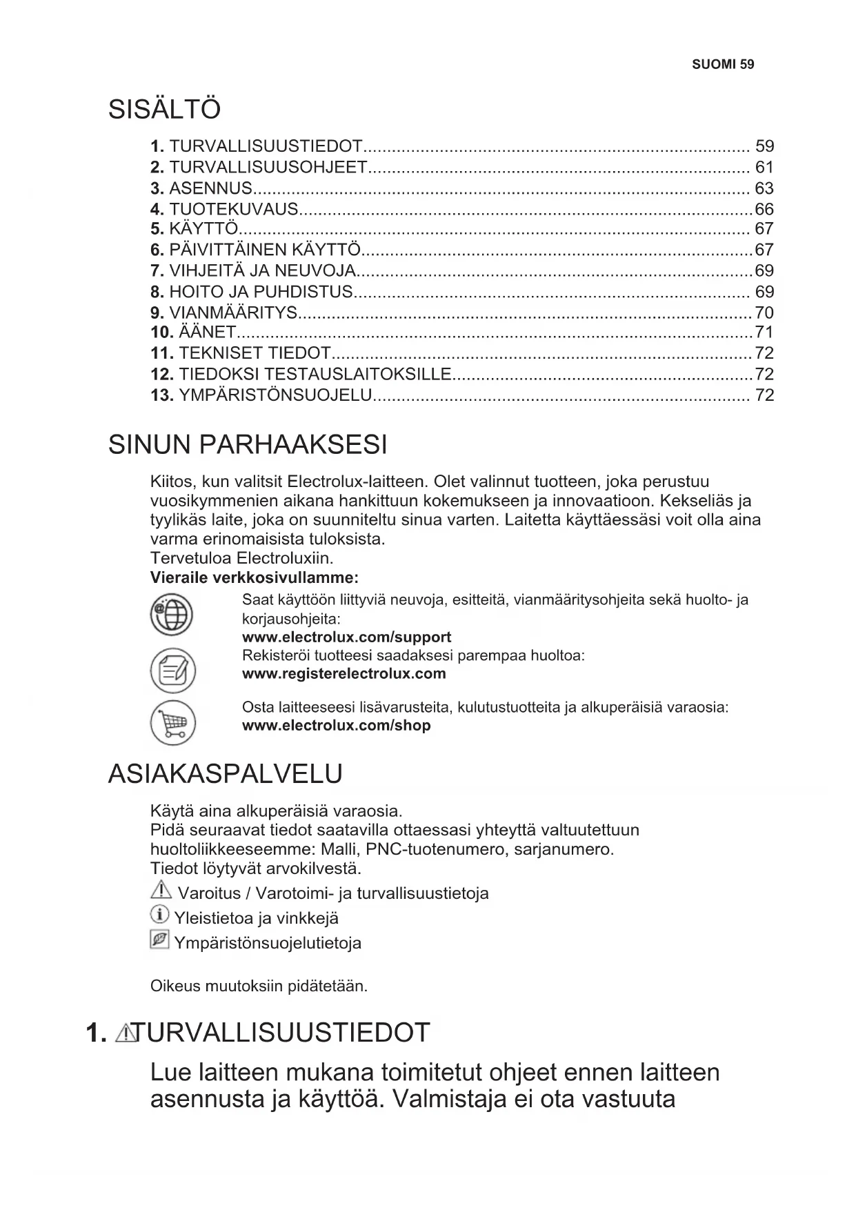 SINUN PARHAAKSESI Kiitos, kun valitsit Electrolux-laitteen. Olet valinnut tuotteen, joka perustuu vuosikymmenien aikana hankittuun kokemukseen ja innovaatioon. Kekseliäs ja tyylikäs laite, joka on suunniteltu sinua varten. Laitetta käyttäessäsi voit olla aina varma erinomaisista tuloksista. Tervetuloa Electroluxiin. Vieraile verkkosivullamme: Saat käyttöön liittyviä neuvoja, esitteitä, vianmääritysohjeita sekä huolto- ja korjausohjeita: www.electrolux.com/support Rekisteröi tuotteesi saadaksesi parempaa huoltoa: www.registerelectrolux.com Osta laitteeseesi lisävarusteita, kulutustuotteita ja alkuperäisiä varaosia: www.electrolux.com/shop ASIAKASPALVELU Käytä aina alkuperäisiä varaosia. Pidä seuraavat tiedot saatavilla ottaessasi yhteyttä valtuutettuun huoltoliikkeeseemme: Malli, PNC-tuotenumero, sarjanumero. Tiedot löytyvät arvokilvestä. Varoitus / Varotoimi- ja turvallisuustietoja Yleistietoa ja vinkkejä Ympäristönsuojelutietoja Oikeus muutoksiin pidätetään.