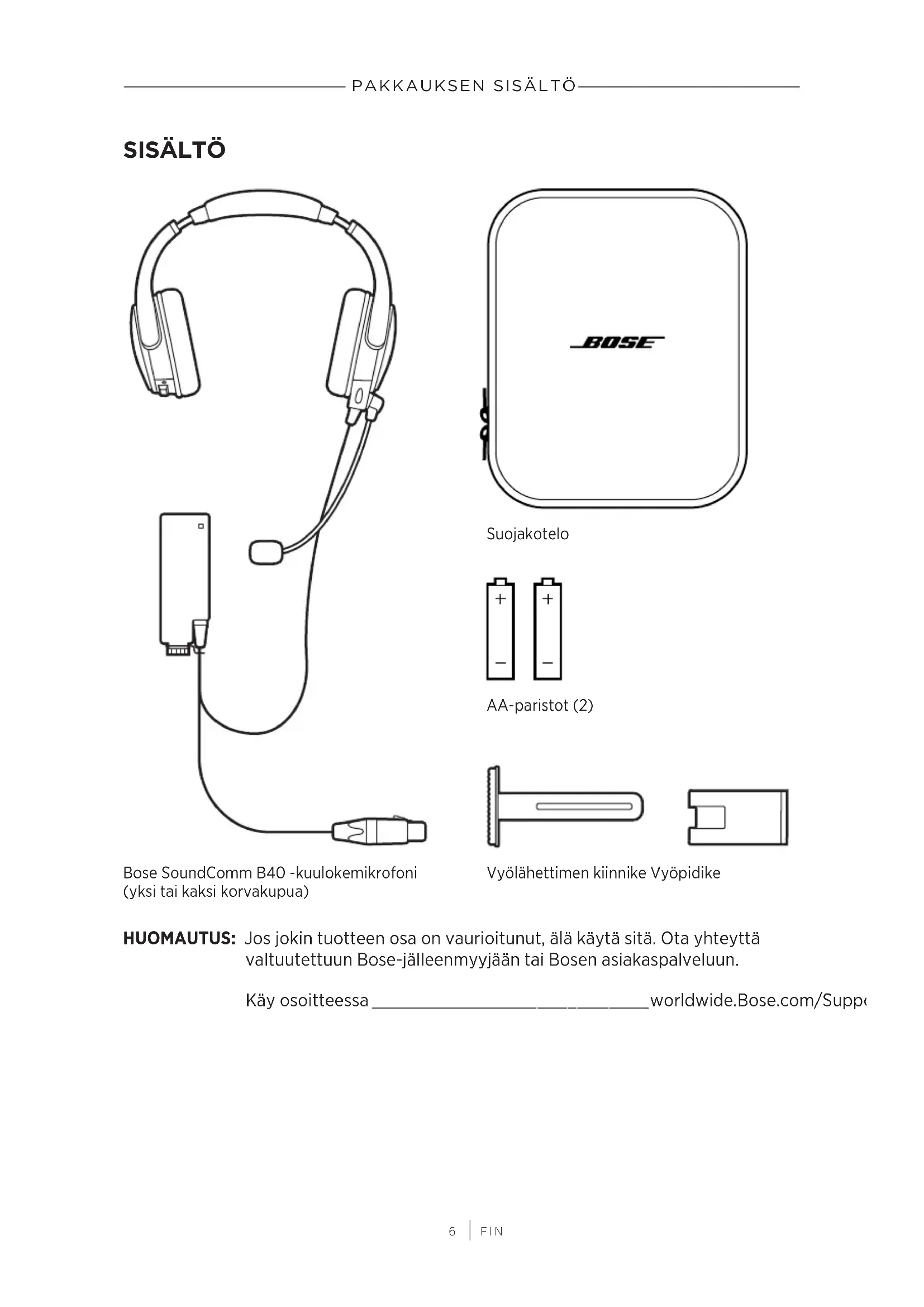 SISÄLTÖ Suojakotelo AA-paristot (2) Bose SoundComm B40 -kuulokemikrofoni (yksi tai kaksi korvakupua) Vyölähettimen kiinnike Vyöpidike HUOMAUTUS: Jos jokin tuotteen osa on vaurioitunut, älä käytä sitä. Ota yhteyttä valtuutettuun Bose-jälleenmyyjään tai Bosen asiakaspalveluun. Käy osoitteessa worldwide.Bose.com/Support/B40worldwide.Bose.com/Support/B40.7