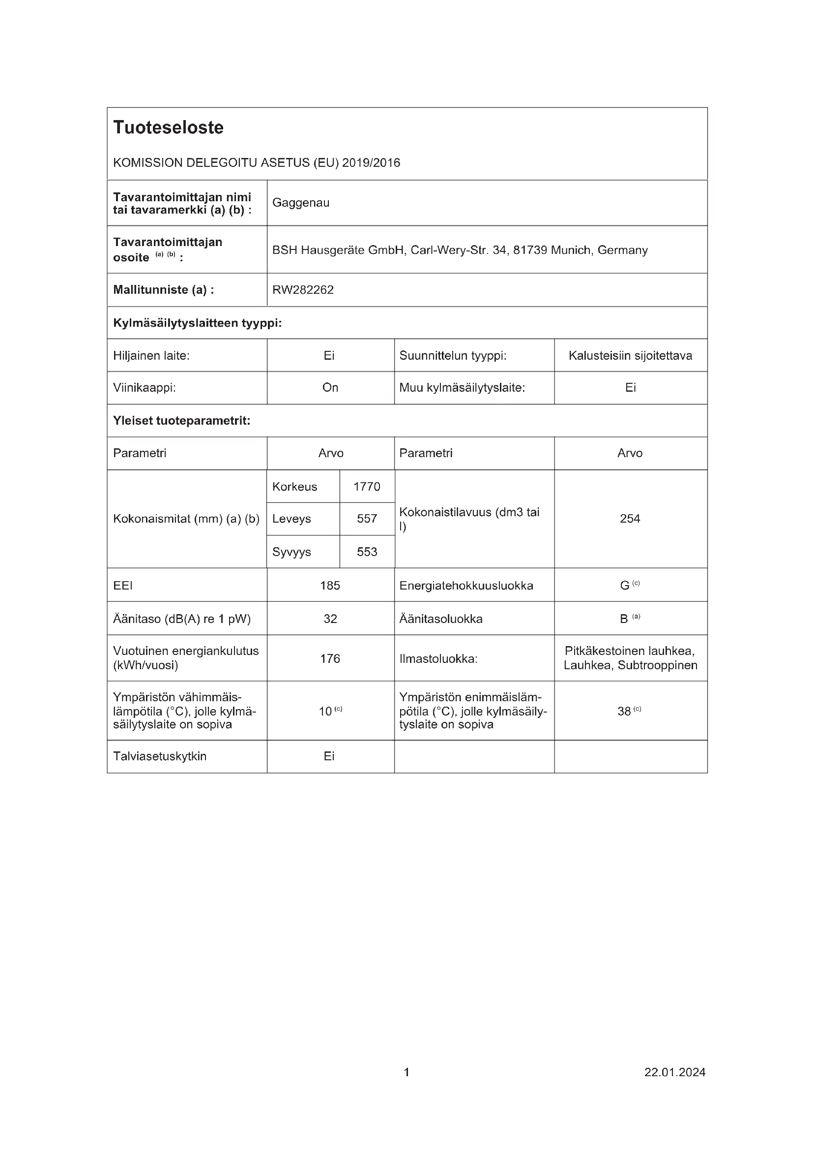 BSH Hausgeräte GmbH, Carl-Wery-Str. 34, 81739 Munich, Germany Mallitunniste (a) : RW282262 Kylmäsäilytyslaitteen tyyppi: Hiljainen laite:
