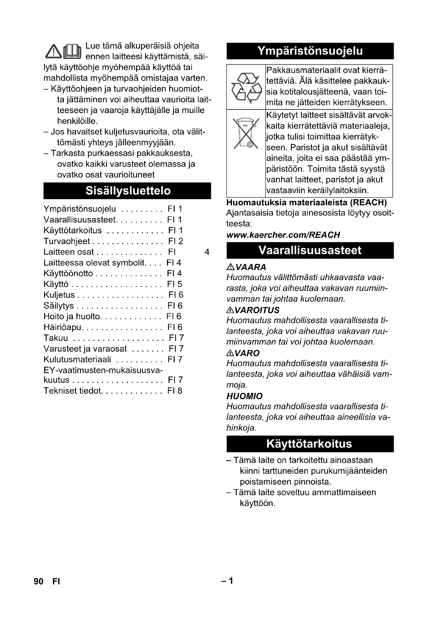 dB(A) ≤70 89SV– 1 Lue tämä alkuperäisiä ohjeita ennen laitteesi käyttämistä, säi- lytä käyttöohje myöhempää käyttöä tai mahdollista myöhempää omistajaa varten. – Käyttöohjeen ja turvaohjeiden huomiot- ta jättäminen voi aiheuttaa vaurioita lait- teeseen ja vaaroja käyttäjälle ja muille henkilöille. – Jos havaitset kuljetusvaurioita, ota välit- tömästi yhteys jälleenmyyjään. – Tarkasta purkaessasi pakkauksesta, ovatko kaikki varusteet olemassa ja ovatko osat vaurioituneet Huomautuksia materiaaleista (REACH) Ajantasaisia tietoja ainesosista löytyy osoit- teesta: www.kaercher.com/REACH VAARA Huomautus välittömästi uhkaavasta vaa- rasta, joka voi aiheuttaa vakavan ruumiin- vamman tai johtaa kuolemaan. 몇 VAROITUS Huomautus mahdollisesta vaarallisesta ti- lanteesta, joka voi aiheuttaa vakavan ruu- miinvamman tai voi johtaa kuolemaan. 몇 VARO Huomautus mahdollisesta vaarallisesta ti- lanteesta, joka voi aiheuttaa vähäisiä vam- moja. HUOMIO Huomautus mahdollisesta vaarallisesta ti- lanteesta, joka voi aiheuttaa aineellisia va- hinkoja. – Tämä laite on tarkoitettu ainoastaan kiinni tarttuneiden purukumijäänteiden poistamiseen pinnoista. – Tämä laite soveltuu ammattimaiseen käyttöön. Sisällysluettelo Ympäristönsuojelu . . . . . . . . . FI 1 Vaarallisuusasteet. . . . . . . . . . FI 1 Käyttötarkoitus . . . . . . . . . . . . FI 1 Turvaohjeet . . . . . . . . . . . . . . . FI 2 Laitteen osat . . . . . . . . . . . . . . FI 4 Laitteessa olevat symbolit. . . . FI 4 Käyttöönotto . . . . . . . . . . . . . . FI 4 Käyttö . . . . . . . . . . . . . . . . . . . FI 5 Kuljetus . . . . . . . . . . . . . . . . . . FI 6 Säilytys . . . . . . . . . . . . . . . . . . FI 6 Hoito ja huolto. . . . . . . . . . . . . FI 6 Häiriöapu. . . . . . . . . . . . . . . . . FI 6 Takuu . . . . . . . . . . . . . . . . . . . FI 7 Varusteet ja varaosat . . . . . . . FI 7 Kulutusmateriaali . . . . . . . . . . FI 7 EY-vaatimusten-mukaisuusva- kuutus . . . . . . . . . . . . . . . . . . . FI 7 Tekniset tiedot. . . . . . . . . . . . . FI 8 Ympäristönsuojelu Pakkausmateriaalit ovat kierrä- tettäviä. Älä käsittelee pakkauk- sia kotitalousjätteenä, vaan toi- mita ne jätteiden kierrätykseen. Käytetyt laitteet sisältävät arvok- kaita kierrätettäviä materiaaleja, jotka tulisi toimittaa kierrätyk- seen. Paristot ja akut sisältävät aineita, joita ei saa päästää ym- päristöön. Toimita tästä syystä vanhat laitteet, paristot ja akut vastaaviin keräilylaitoksiin. Vaarallisuusasteet Käyttötarkoitus 90 FI– 2 – Tämän käyttöohjeen ohjeiden ohella on noudatettava lainmukaisia yleisiä tur- vallisuus- ja tapaturmantorjuntamäärä- yksiä. – Laitteeseen kiinnitetyt varoitus- ja opas- tuskilvet antavat tärkeitä ohjeita turval- lista käyttöä varten. VAARA Loukkaantumisvaara! – Käyttäjän on käytettävä laitetta tarkoi- tuksenmukaisesti. Käyttäjän on huomi- oitava paikalliset olosuhteet ja työsken- nellessään laitteella kiinnitettävä huo- miota muihin henkilöihin, erityisesti lap- siin. – Älä koskaan jätä laitetta ilman valvon- taa silloin, kun se on käynnissä. – Laitetta saavat käyttää vain koulutuk- sen saaneet henkilöt tai sellaiset henki- löt, jotka ovat osoittaneet kykenevänsä käyttämään laitetta ja, jotka ovat erityi- sesti saaneet tehtäväkseen laitteen käyttämisen. Lapset tai alaikäiset eivät saa käyttää laitetta. – Tätä laitetta ei ole tarkoitettu sellaisten henkilöiden käytettäväksi, joilla on ra- joittuneet fyysiset, aistilliset tai henkiset kyvyt. – Lapsia on valvottava sen varmistami- seksi, että he eivät leiki laitteen kanssa. – Käytä aina tarkoitukseen soveltuvia kä- sineitä työskennellelläsi laitteella. – Laitetta/varusteita ei saa muuttaa. – Vaaratilanteiden eliminoimiseksi, vain valtuutettu asiakaspalvelupiste saa kor- jata koneen ja vaihtaa sen varaosat. – Pidä pakkausfoliot lasten ulottumatto- missa, tukehtumisvaara! VAARA – Jos käytät sydämentahdistinta, suosit- telemme ottamaan yhteyden lääkäriin tai sydämentahdistimen valmistajaan saadaksesi tietoa mahdollisista turva- toimenpiteistä ennen laitteen käyttä- mistä. – Kaikki sydämentahdistintyypit eivät kestä yhtä hyvin välittömästä läheisyy- dessä säteilevää suurtaajuus- ja sähkö- magneettista säteilyä, mikä voi aiheut- taa ongelmia laitetta käytettäessä. – Älä käytä laitetta, jos lääkärisi ei voi taa- ta käytön esteettömyyttä! VAARA – Akun lataaminen on sallittua vain muka- na tulleella alkuperäislaturilla. – Tarkasta aina ennen käyttöä, ettei latu- rissa ole vaurioita. Vaurioitunutta laturia ei saa enää käyttää. Toimita vaurioitu- neet osat vain ammattitaitoisen henkilö- kunnan korjattavaksi. – Älä käytä latauslaitetta, jos se on likai- nen tai märkä. – Latauslaitteen tyyppikilvessä ilmoitetun jännitteen on oltava sama kuin käytettä- vä verkkojännite. – Älä käytä latauslaitetta räjähdysalttiissa tiloissa. – Latauspistokkeen kosketinpintoihin ei saa osua metalliosia, oikosulkuvaara. – Vältä koskettamasta viallisiin, akkunes- tettä vuotaviin akkuihin. Jos vahingossa joudut kosketuksiin nesteen kanssa, huuhdo vedellä. Jos nestettä pääsee kosketuksiin silmiisi, ota yhteys lääkä- riin. – Akku on suunniteltu ladattavaksi aina ennen käyttöä täyteen. Turvaohjeet Sydäntahdistin Akku/latauslaite 91FI– 3 VAARA – Lue kaasupatruunoissa olevat turvalli- suusohjeet. – Suojaa suoralta auringonpaisteelta. – Älä altista lämpötiloille, jotka ovat yli 50 °C. – Ei saa täyttää uudelleen. – Ei saa puhkoa eikä polttaa. – Tee kaasupatruunoiden vaihto vain hy- vin ilmastoidussa paikassa, missä ei ole syttymislähteitä. – Vaihda venttiiliputken tiivisteet heti, jos ne ovat vaurioituneet tai hävinneet. – Kierrevaurioiden välttämiseksi kierrä vain käsitiukkuuteen venttiiliputkessa. 