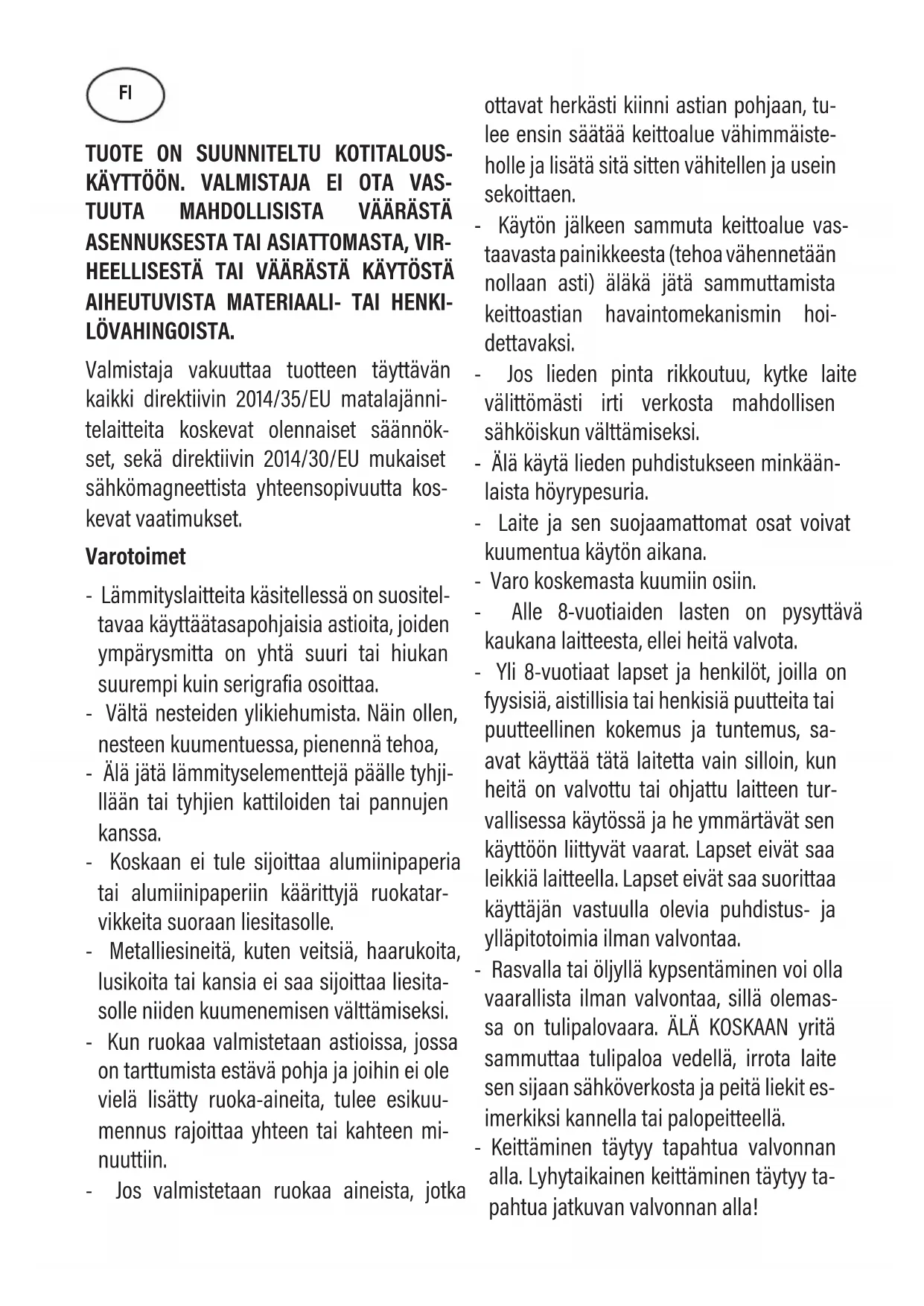 LÖVAHINGOISTA. Valmistaja vakuuttaa tuotteen täyttävän kaikki direktiivin 2014/35/EU matalajänni- telaitteita koskevat olennaiset säännök- set, sekä direktiivin 2014/30/EU mukaiset sähkömagneettista yhteensopivuutta kos- kevat vaatimukset. Varotoimet - Lämmityslaitteita käsitellessä on suositel- tavaa käyttäätasapohjaisia astioita, joiden ympärysmitta on yhtä suuri tai hiukan suurempi kuin serigrafia osoittaa. - Vältä nesteiden ylikiehumista. Näin ollen, nesteen kuumentuessa, pienennä tehoa, - Älä jätä lämmityselementtejä päälle tyhji- llään tai tyhjien kattiloiden tai pannujen kanssa. - Koskaan ei tule sijoittaa alumiinipaperia tai alumiinipaperiin käärittyjä ruokatar- vikkeita suoraan liesitasolle. - Metalliesineitä, kuten veitsiä, haarukoita, lusikoita tai kansia ei saa sijoittaa liesita- solle niiden kuumenemisen välttämiseksi. - Kun ruokaa valmistetaan astioissa, jossa on tarttumista estävä pohja ja joihin ei ole vielä lisätty ruoka-aineita, tulee esikuu- mennus rajoittaa yhteen tai kahteen mi- nuuttiin. - Jos valmistetaan ruokaa aineista, jotka ottavat herkästi kiinni astian pohjaan, tu- lee ensin säätää keittoalue vähimmäiste- holle ja lisätä sitä sitten vähitellen ja usein sekoittaen. - Käytön jälkeen sammuta keittoalue vas- taavasta painikkeesta (tehoa vähennetään nollaan asti) äläkä jätä sammuttamista keittoastian havaintomekanismin hoi- dettavaksi. - Jos lieden pinta rikkoutuu, kytke laite välittömästi irti verkosta mahdollisen sähköiskun välttämiseksi. - Älä käytä lieden puhdistukseen minkään- laista höyrypesuria. - Laite ja sen suojaamattomat osat voivat kuumentua käytön aikana. - Varo koskemasta kuumiin osiin. - Alle 8-vuotiaiden lasten on pysyttävä kaukana laitteesta, ellei heitä valvota. - Yli 8-vuotiaat lapset ja henkilöt, joilla on fyysisiä, aistillisia tai henkisiä puutteita tai puutteellinen kokemus ja tuntemus, sa- avat käyttää tätä laitetta vain silloin, kun heitä on valvottu tai ohjattu laitteen tur- vallisessa käytössä ja he ymmärtävät sen käyttöön liittyvät vaarat. Lapset eivät saa leikkiä laitteella. Lapset eivät saa suorittaa käyttäjän vastuulla olevia puhdistus- ja ylläpitotoimia ilman valvontaa. - Rasvalla tai öljyllä kypsentäminen voi olla vaarallista ilman valvontaa, sillä olemas- sa on tulipalovaara. ÄLÄ KOSKAAN yritä sammuttaa tulipaloa vedellä, irrota laite sen sijaan sähköverkosta ja peitä liekit es- imerkiksi kannella tai palopeitteellä. - Keittäminen täytyy tapahtua valvonnan alla. Lyhytaikainen keittäminen täytyy ta- pahtua jatkuvan valvonnan alla! FI- Valvomaton keittäminen hellalla jossa on rasvaa tai öljyä voi olla vaarallista ja jo- htaa tulipaloon. - Tulipalovaara: älä säilytä mitään esineitä keittotasolla. - Käytä ainoastaan keittotason valmistajan suosittelemia tai valmistajan käyttöohjeis- sa määritettyjä asianmukaisia keittotason suojia tai laitteen mukana toimitettuja keittotason suojia. Virheellisten suojien käyttö voi johtaa onnettomuuksiin. Lisää kiinteisiin johdotuksiin mahdollisuus katkaista verkkovirta ja eristä johdotus- sääntöjen mukaisesti niiden napojen kon- taktit, joiden avulla virran voi katkaista täy- sin, kun ylijännite on tasolla III. Pistokkeen tai moninapaisen katkaisijan tulee olla sopiva- lla korkeudella siten, että niihin pääsee hel- posti käsiksi laitteen ollessa asennettuna. Tätä laitetta ei ole tarkoitettu käytettäväksi ulkoisen ajastimen tai etähallintajärjestel- män kanssa. Valmistaja kieltäytyy kaikesta vastuusta ta- pauksissa, joissa edellä mainittuja ohjeita ja tavanomaisia vaaratilanteita ehkäiseviä käyttönormistoja ei noudateta. Jos virtajohto on vahingoittunut, tulee se vaihtaa. Vaihdon tulee olla valmistajan, val- tuutetun teknisen huoltoliikkeen tai päte- vän teknisen asentajan suorittama kaiken- tyyppisten vaaratilanteiden välttämiseksi. Käyttöohjeet Asentaminen Kaikkien asentamiseen liittyvien toimenpiteiden (sähkökytkentä) tulee olla voimassaolevien säännösten mukaisesti asiantuntevan henkilön suorittamia. Katso erityisohjeet asentamista koskevasta osiosta. Käyttö